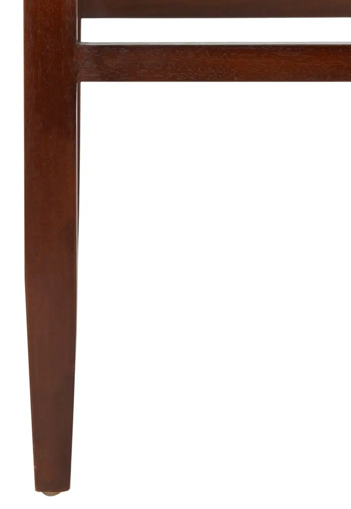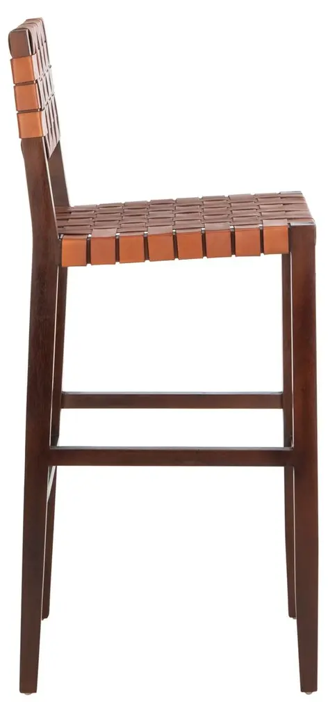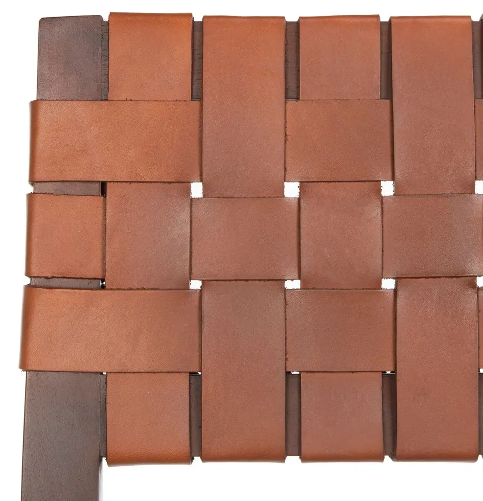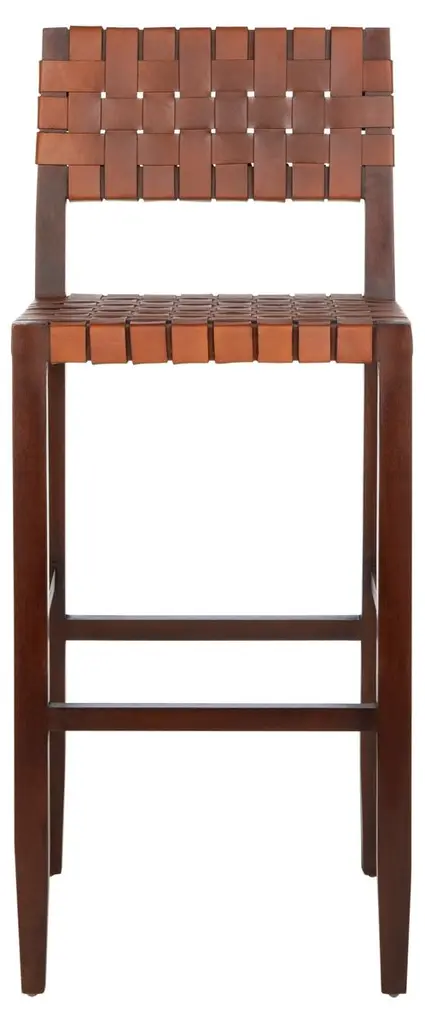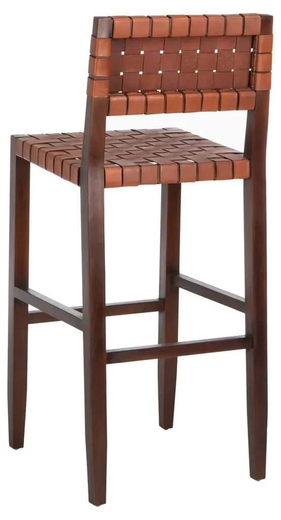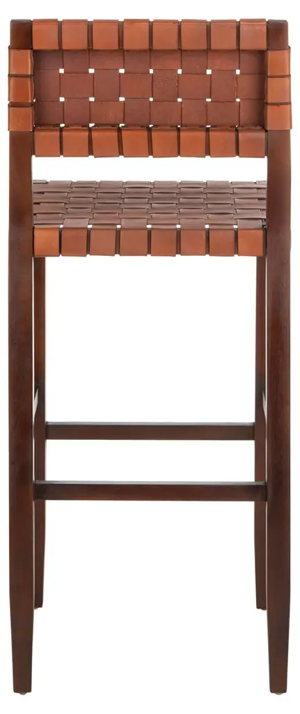 This barstool is framed in mahogany--a finely grained hardwood that resists swelling, shrinking, and warping--with a woven leather-strap seat and back that lends texture and dimension to the piece.