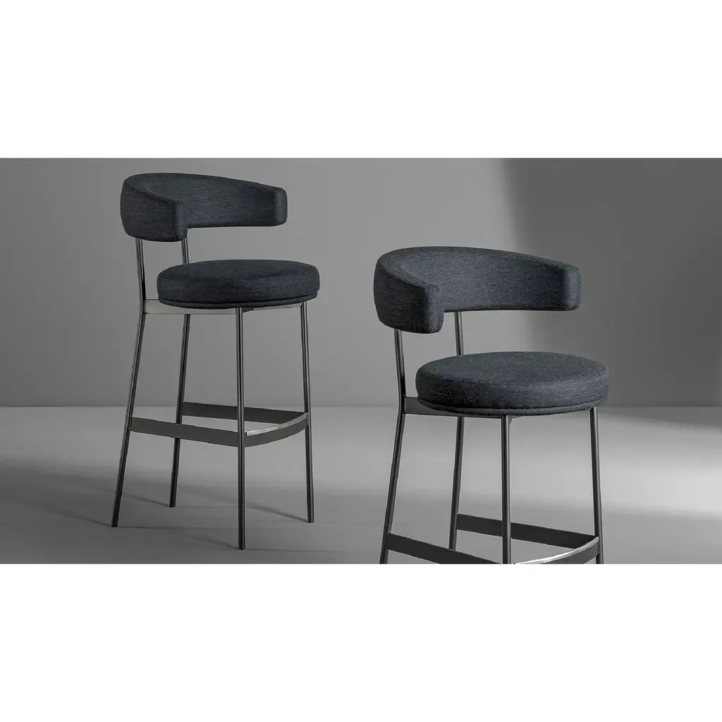 Neuilly too stands out for its delicate image and unique formal qualities which combine the geometric purity of the classic stool with a level of comfort that is evident at first glance. The slender proportions of the linear metal frame further highlight the circular padded seat while at the same time the ergonomic profile of the welcoming backrest/armrest offers a natural seating position and guarantees the stool great ease of use both in bar spaces and facing counters in dining areas.