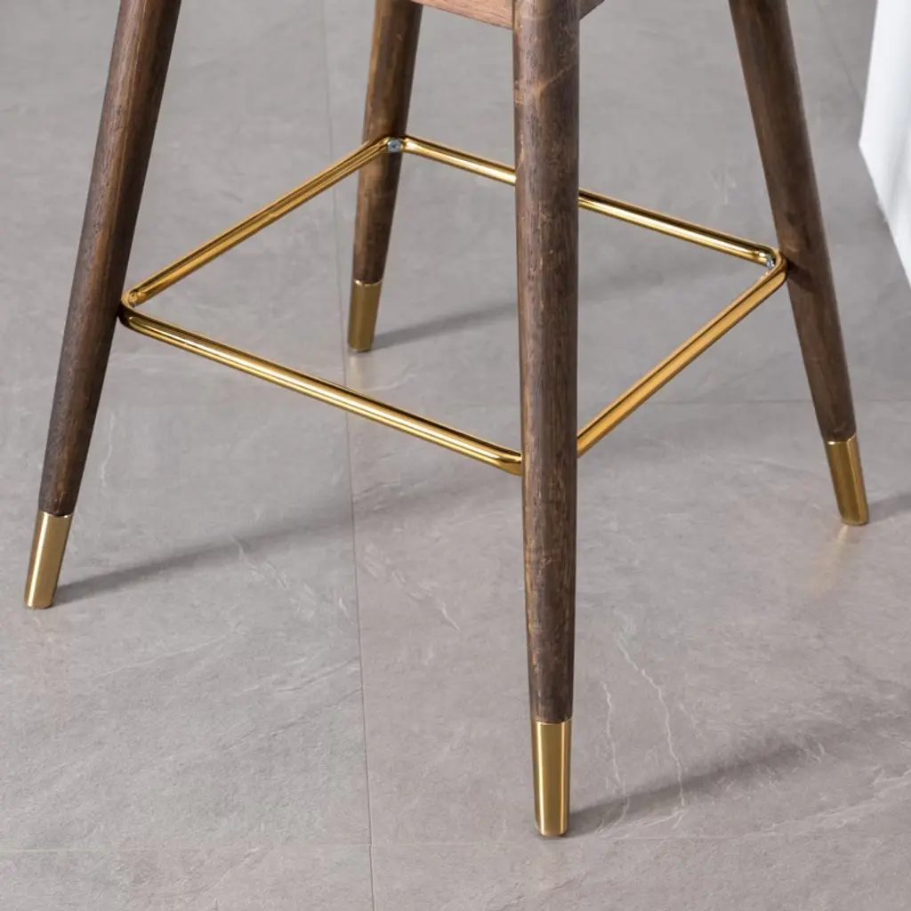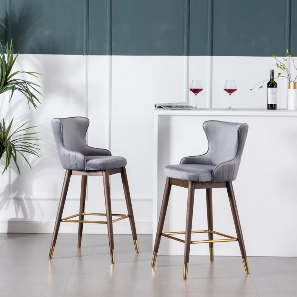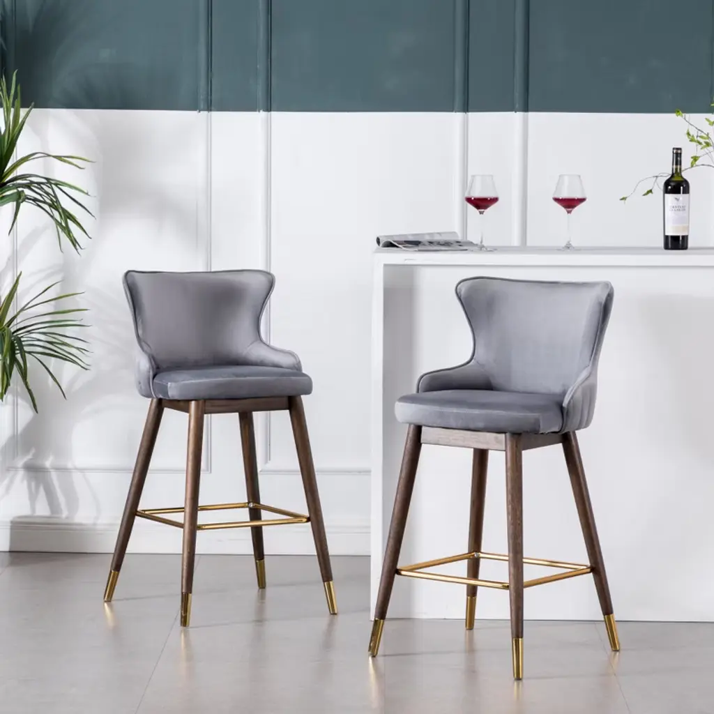Product Details Add a kick of mid-mod style to your home bar with the leggy Leland Fabric Upholstered Wingback Bar Stools. This stool is upholstered in your choice of select fabric color. It sports an exposed wood base plus long and lean tapered legs in a walnut finish with the gold-tone metal electroplated on the end. The frame is crafted with solid rubberwood for long-lasting. The seat is padded with dense foam upholstered by a silky velvet-like fabric to add a touch of delicate. Set includes two bar stools. Thick layers of dense foam are used to pad the backrest and seat, upholstered with a lush velvet-like fabric in your choice of colorMid-century inspired stools feature wingback and sleek tapered legs underneath, vertical stitches on the chair back add the dimension of the designSolid rubberwood legs finished in walnut with the gold-tone metal electroplated on the endPhoto may be slightly different from the actual item in terms of color due to the monitor's displayItem SKU: PC312GY