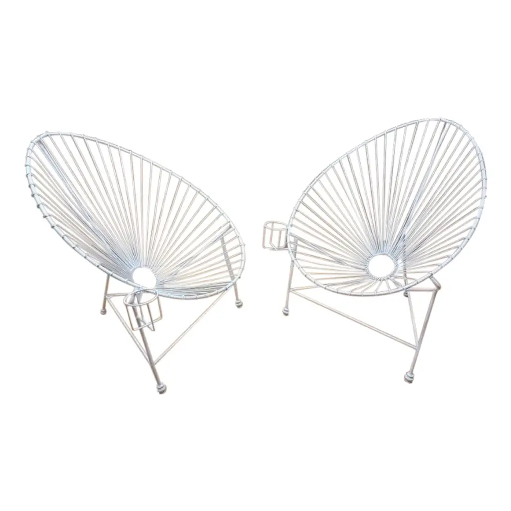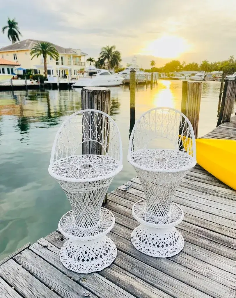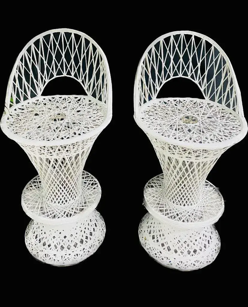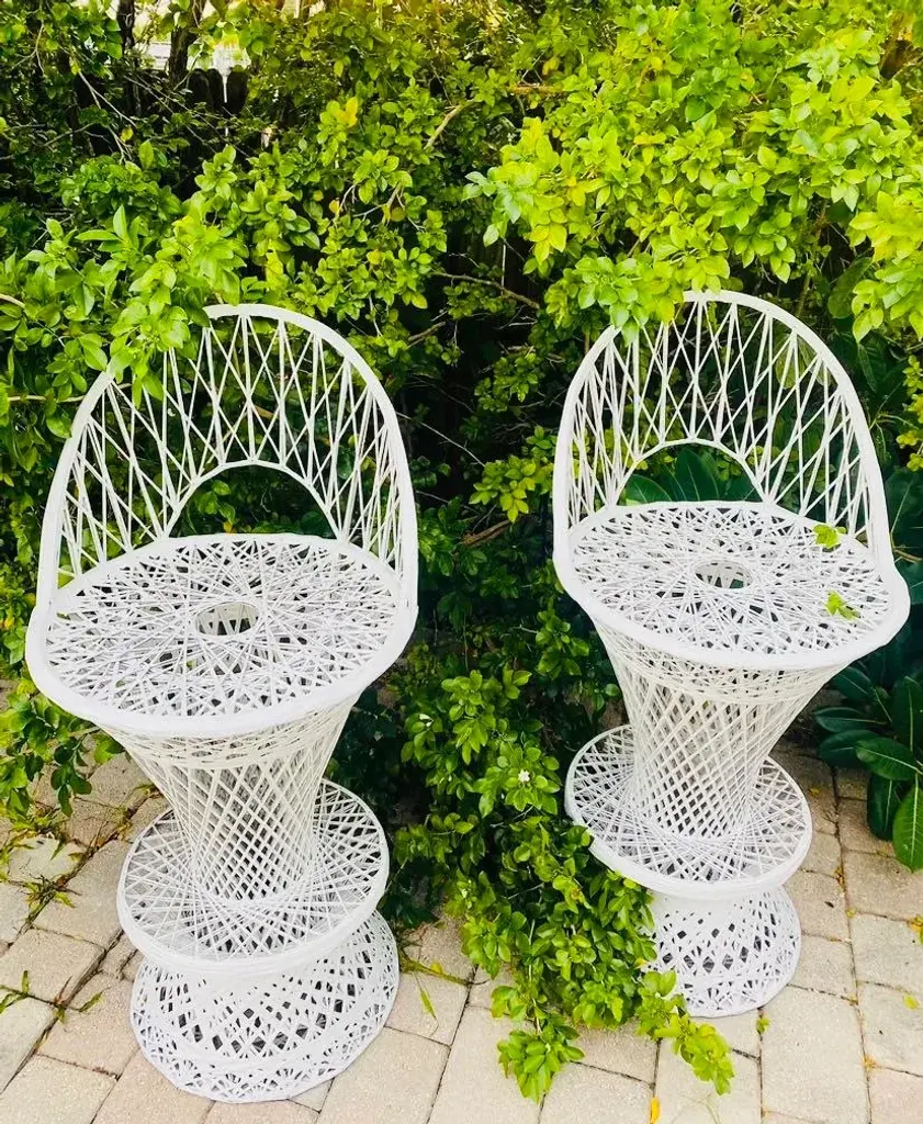 Set of 2 Russell Woodard spun fiberglass outdoor bar stools. Freshly lacquered White. If needed we have a other set available