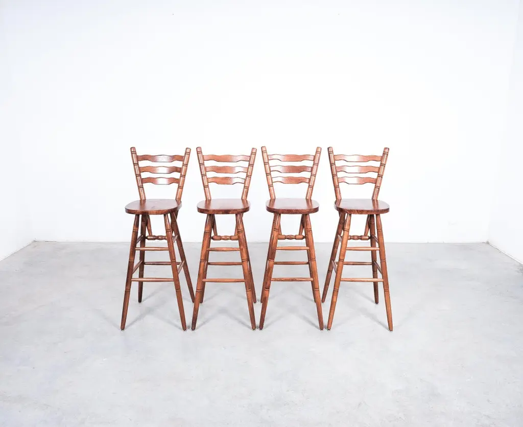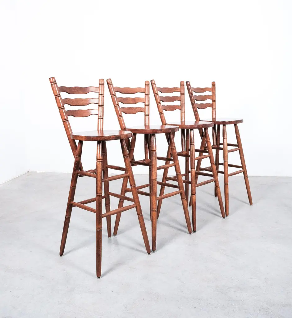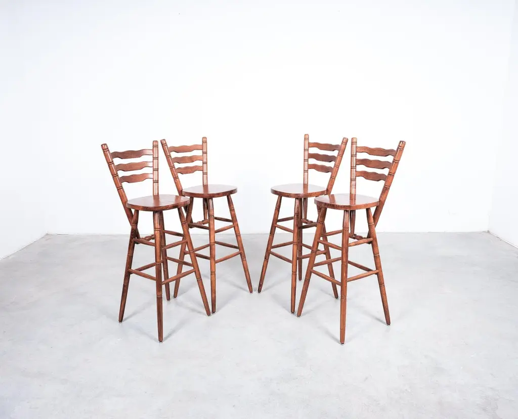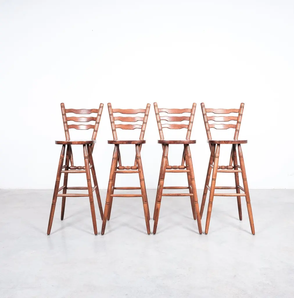 Rustic bar stools (Four available) made from birch, circa 1970 - priced per stool.Dimensions 44" (height) 30" (seat height). 18.5" x 15.74"Very stylish set from four barstools with nice backrests. We have an identical set of 3 pieces available which are a bit different in color. Those were manufactured in Germany in the mid 1970's and are in good original vintage condition, clean and ready to being placed at a kitchen island. Dimensions 44" (height) 30" (seat height). 18.5" x 15.74".