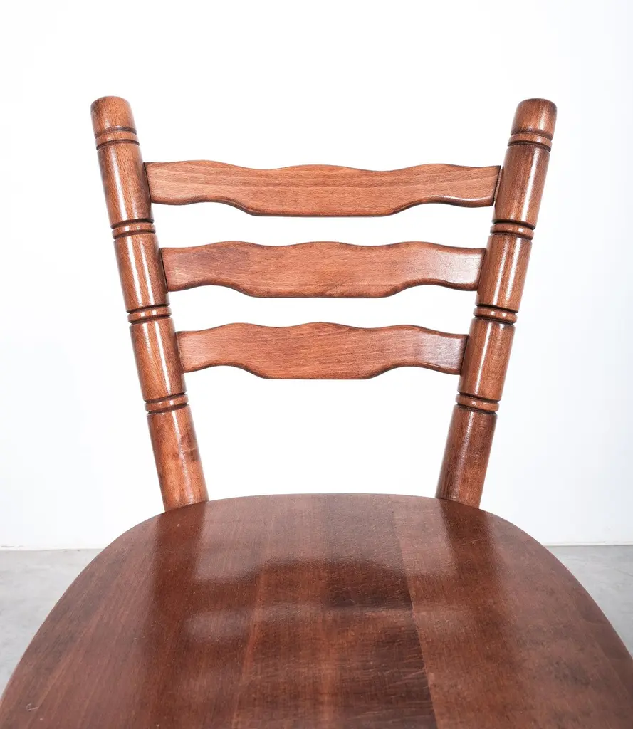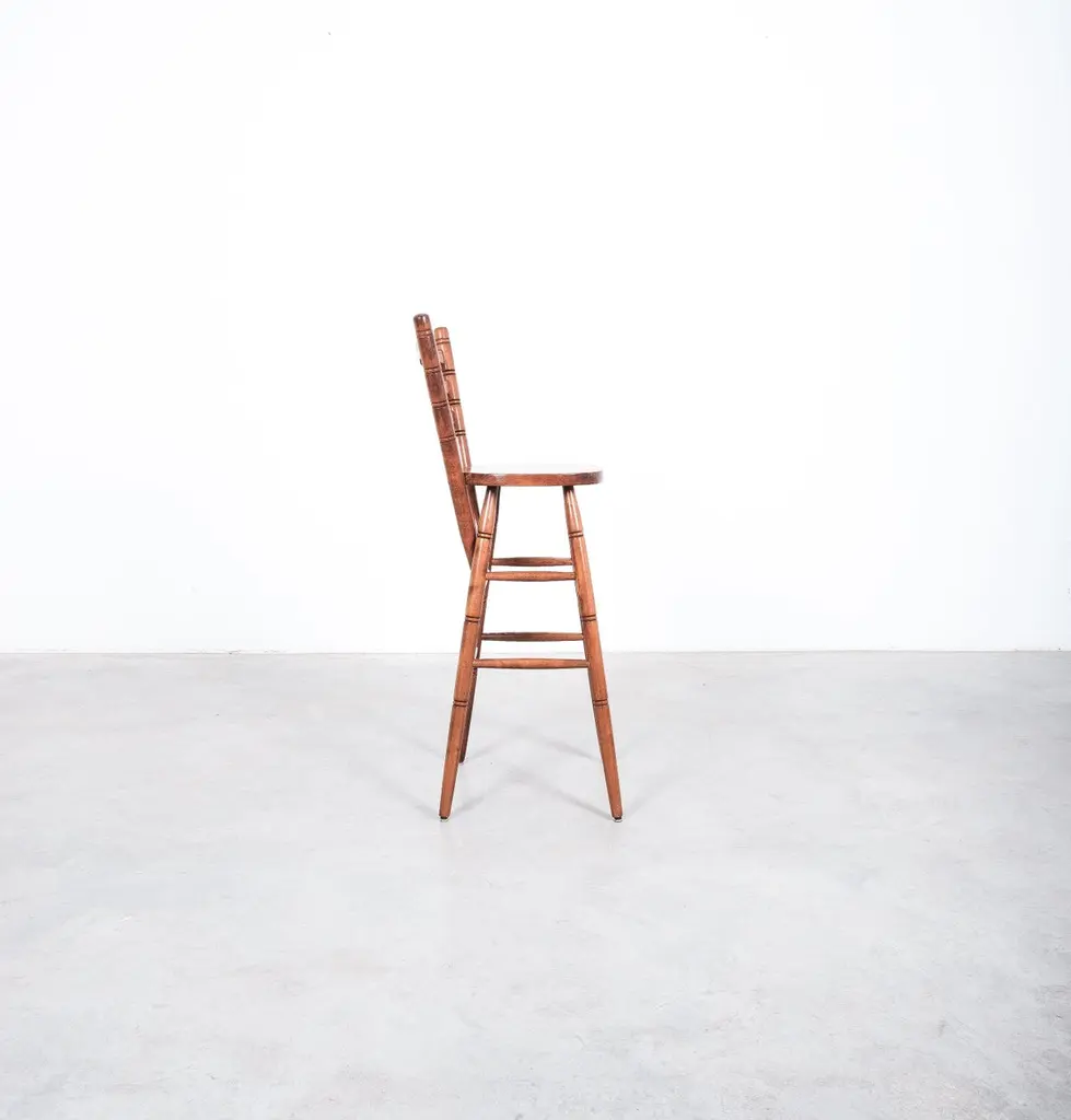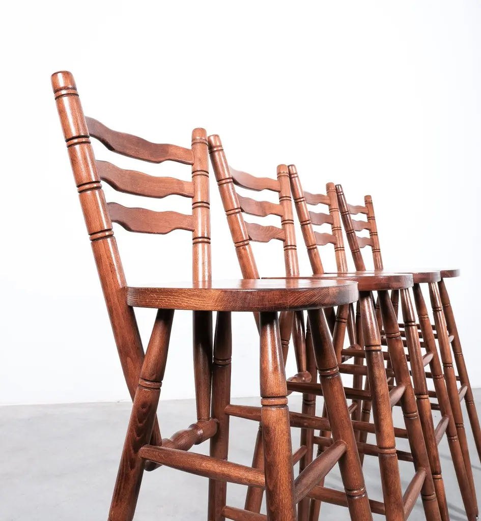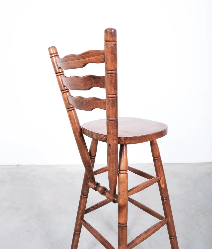Rustic bar stools (Four available) made from birch, circa 1970 - priced per stool.Dimensions 44" (height) 30" (seat height). 18.5" x 15.74"Very stylish set from four barstools with nice backrests. We have an identical set of 3 pieces available which are a bit different in color. Those were manufactured in Germany in the mid 1970's and are in good original vintage condition, clean and ready to being placed at a kitchen island. Dimensions 44" (height) 30" (seat height). 18.5" x 15.74".