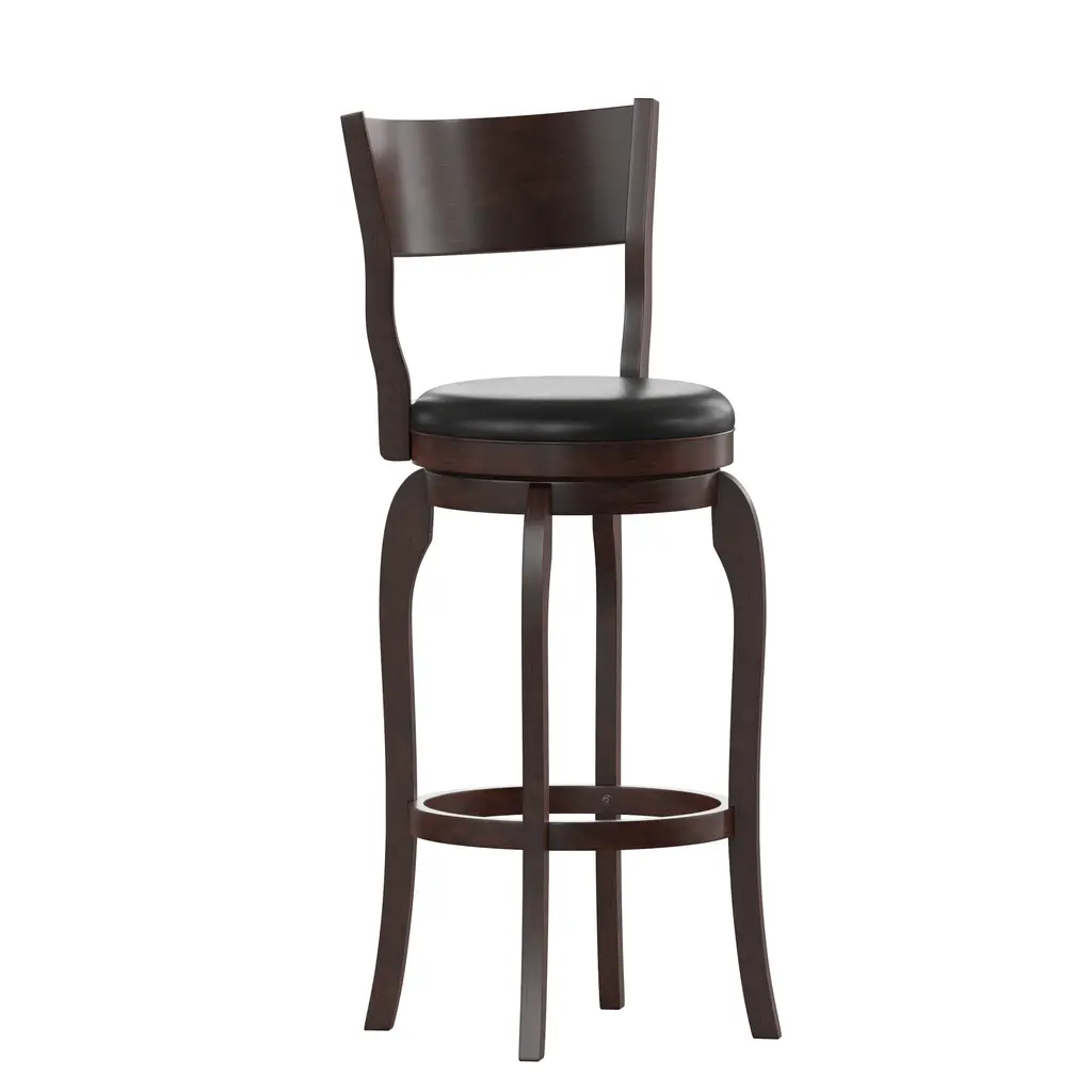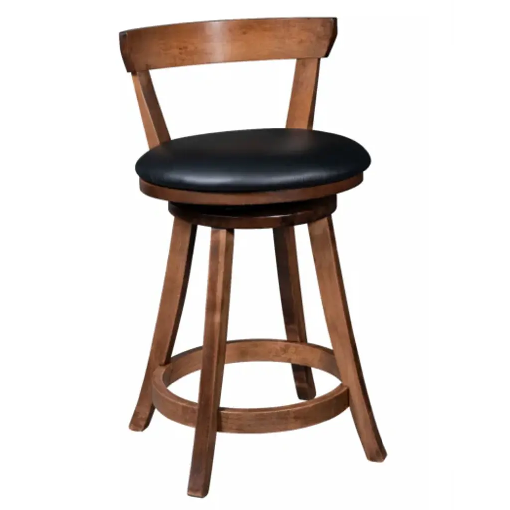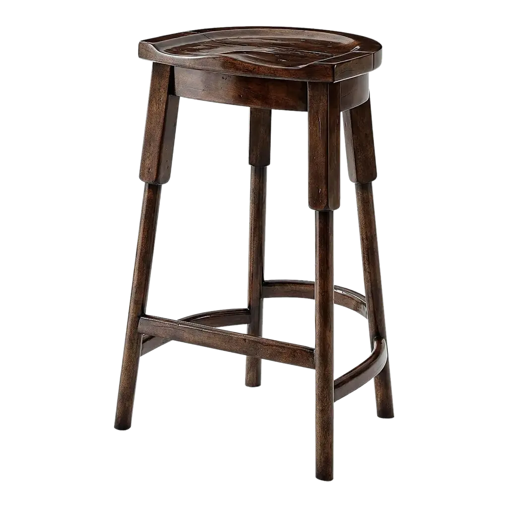 A rustic Byron finish bar stool, the shaped saddle seat above turned legs and stretchers. The original French Provincial.Dimensions: 18.5" W x 15.75" D x 29" H.