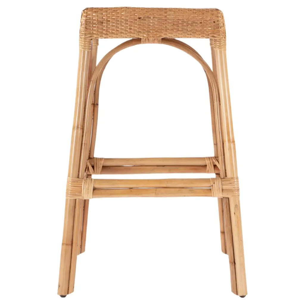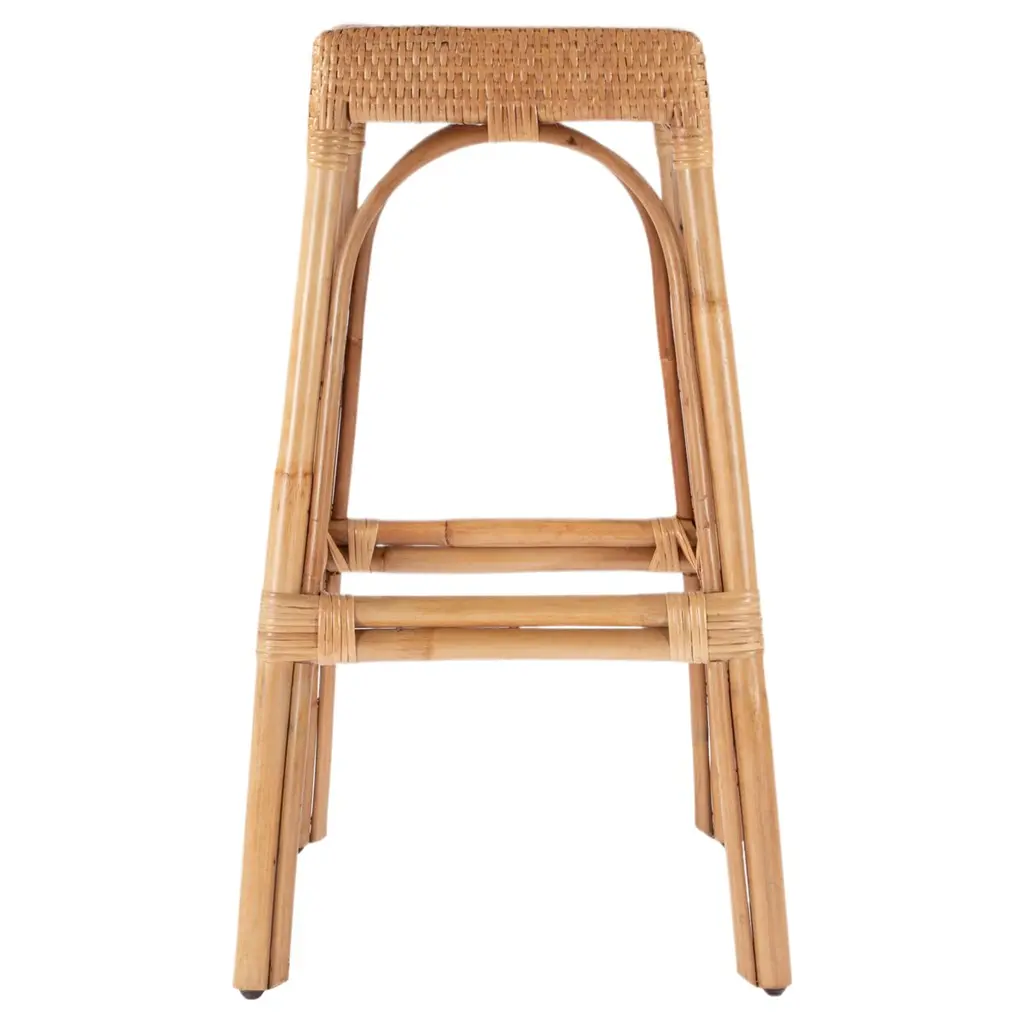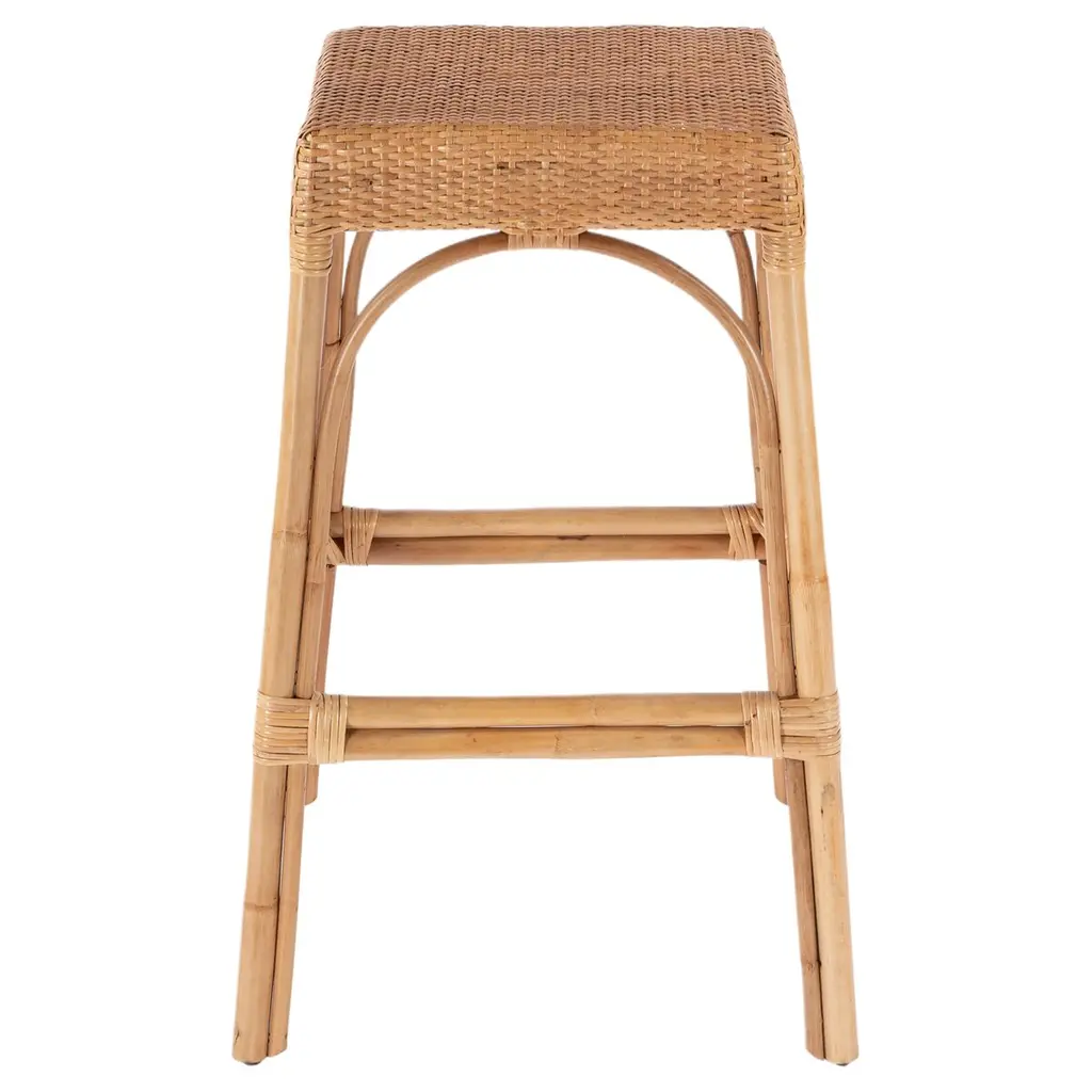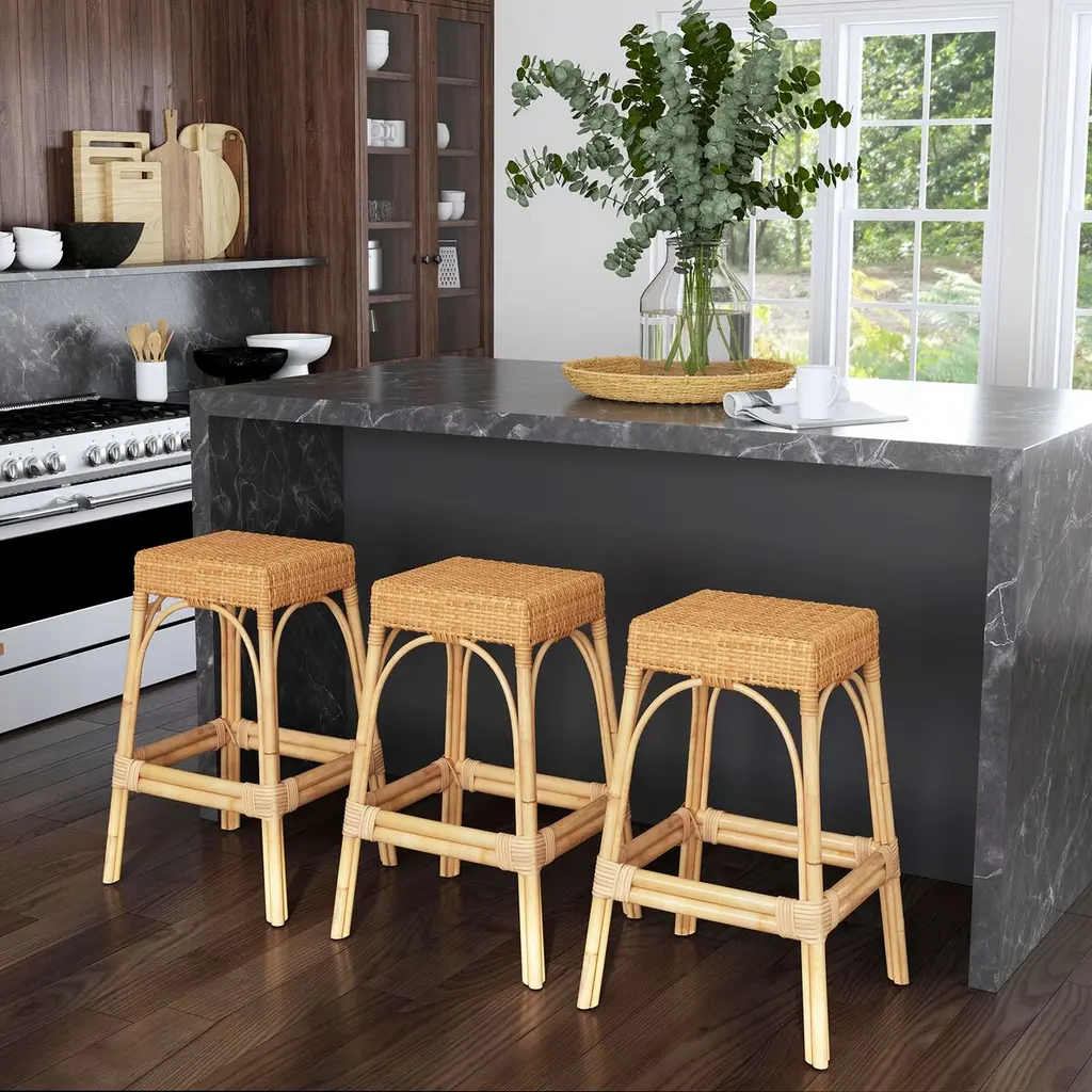This backless stool measures 30" high, making it the perfect height for your bar seating. It features an intricately woven rattan seat and four narrow legs equipped with plastic glides to protect your floors from scratches. The frame is crafted from a blend of solid and engineered wood with a natural wood grain that complements any aesthetic or color palette. Additionally, this stool includes a sturdy wooden footrest, ideal for busy homes. Its backless design allows you to conveniently slide it underneath your home bar, keeping it out of the way when not in use.