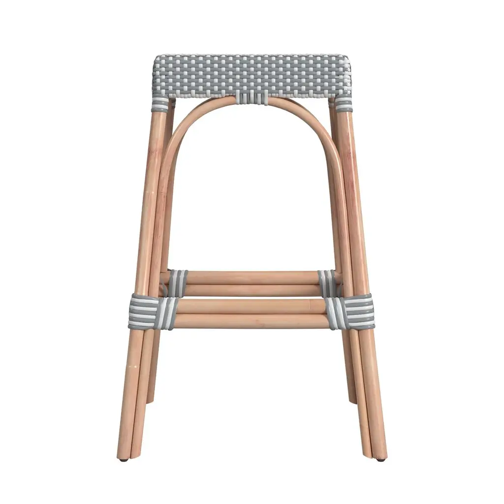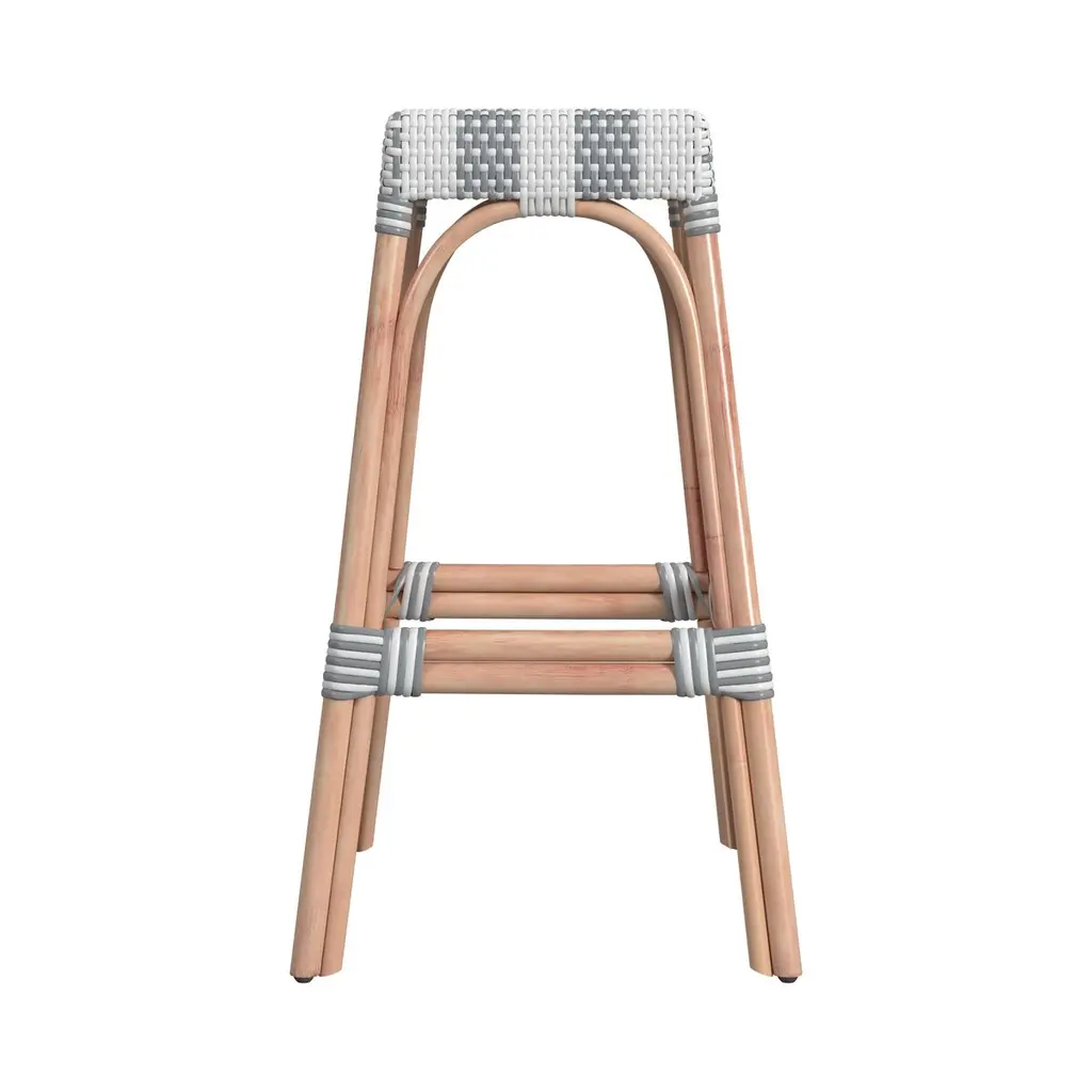 This backless stool measures 30" high, making it the perfect height for your bar seating. It features an intricately woven rattan seat and four narrow legs equipped with plastic glides to protect your floors from scratches. The frame is crafted from a blend of solid and engineered wood with a natural wood grain that complements any aesthetic or color palette. Additionally, this stool includes a sturdy wooden footrest, ideal for busy homes. Its backless design allows you to conveniently slide it underneath your home bar, keeping it out of the way when not in use.