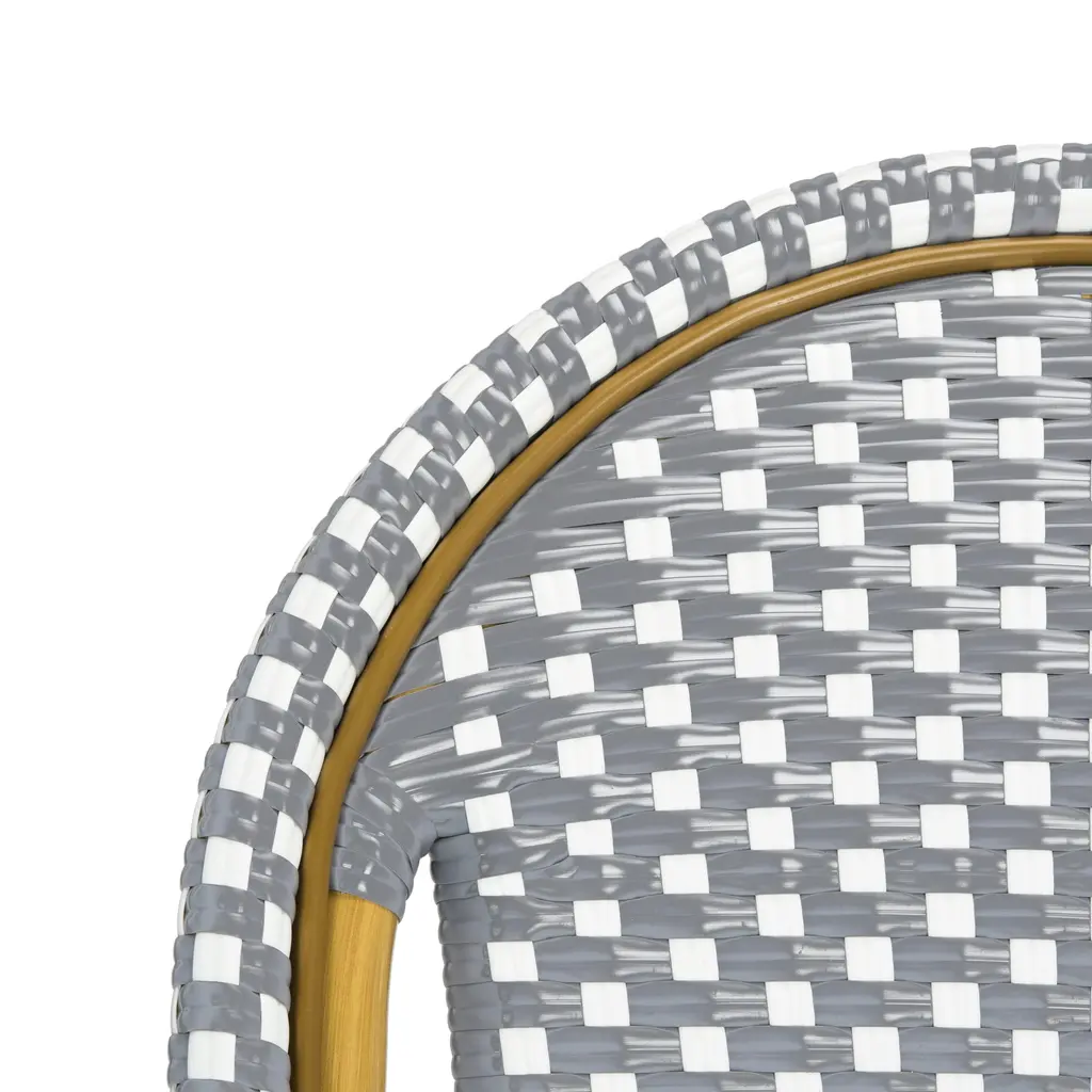 A cafe hidden in the heart of the infamous Saint-Germain-des-Pres inspired this indoor-outdoor stacking bistro barstool. Alive with Gallic charm, its grey and white wicker design lends instant character to a breakfast bar or outdoor kitchen.Features:Chair Type: BarstoolsMaterial: RattanAssembly: AssembledColor: White, Grey