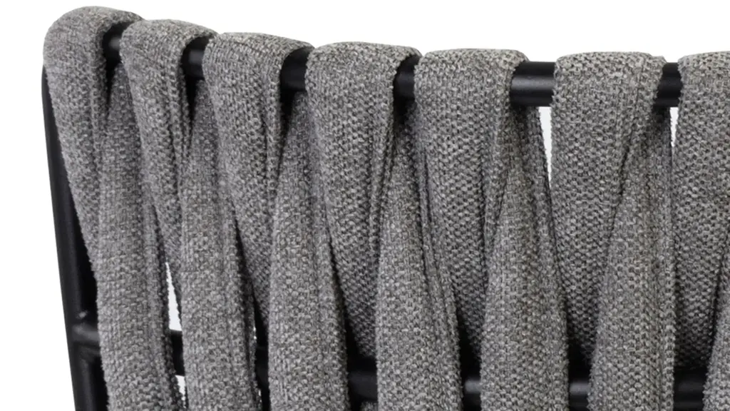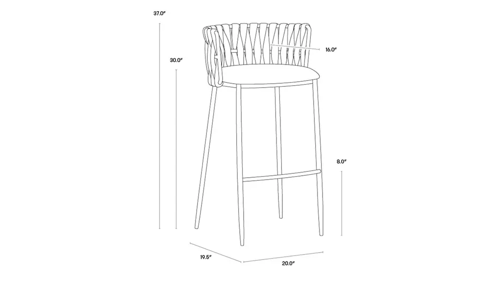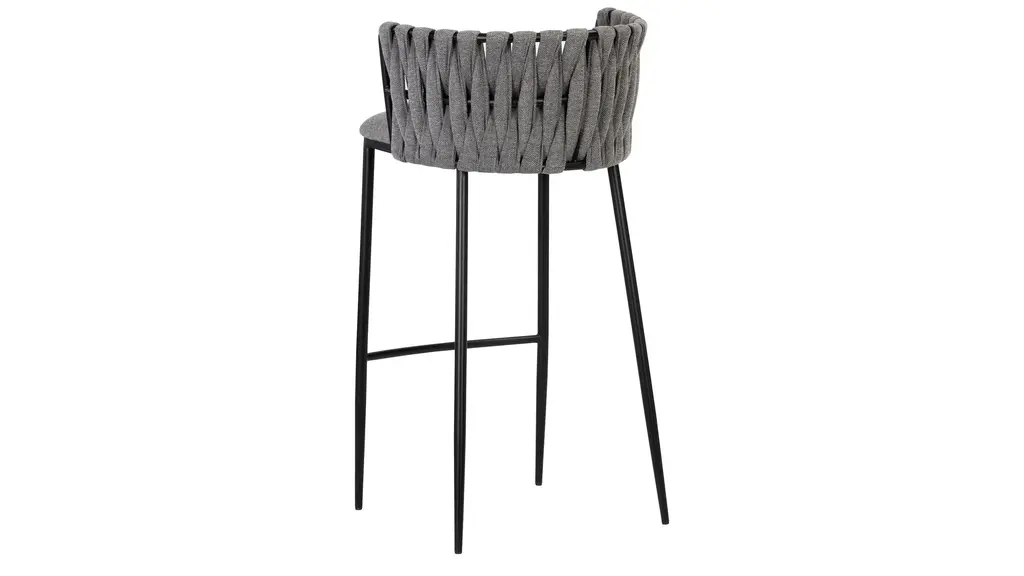 Sarai Barstool features an eye-catching design that will bring drama to any space. Crafted with a unique weaved backrest that is upholstered in our belfast heather Gray and koala Gray fabrics. Completed with black powder coated steel frame in a smooth finish.