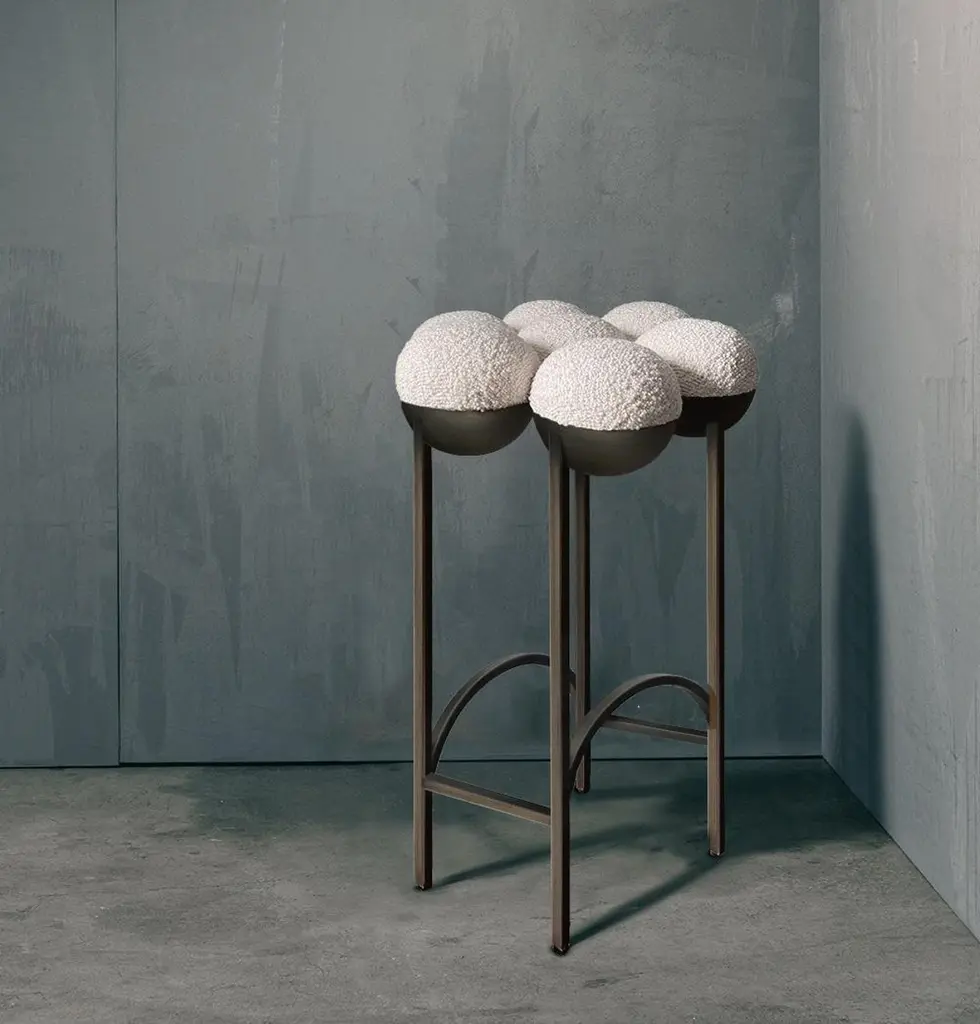 The equally singular Saturn bar stool utilizes the same gathered bilboquet seat construction, to create a more simplified but still incredibly distinctive form. The sumptuously undulating seat instantly appeals with its invitingly upholstered comfort, while the graceful supporting metalwork establishes the sense of floating and airiness.The stool is made in oxidized brushed brass and Dedar boucle fabric. It is made by hand in Portugal.Each piece of furniture is individually numbered and comes with a signed "Certificate of Authenticity" to prove that it is Bohinc Studio original.Material: oxidized brushed brass and boucle fabricDimensions: diameter 445 x height 660mm.