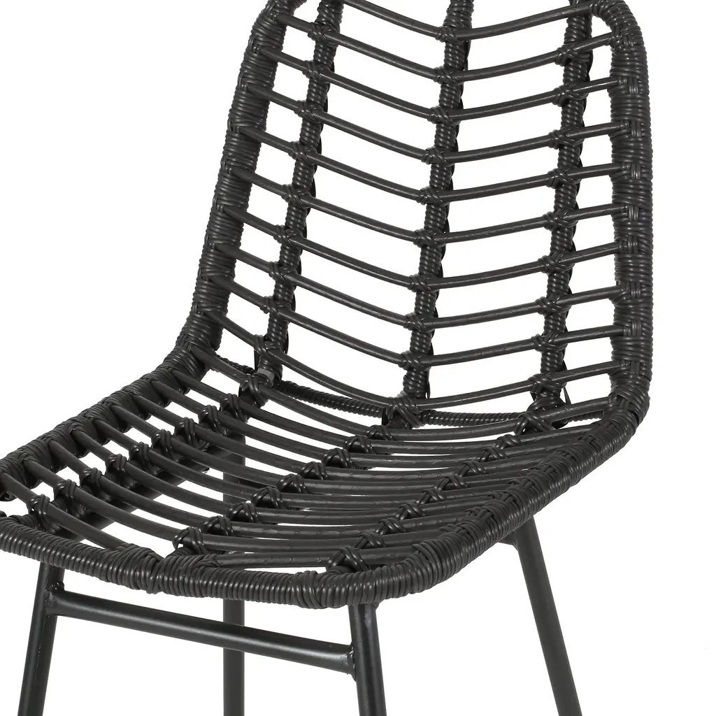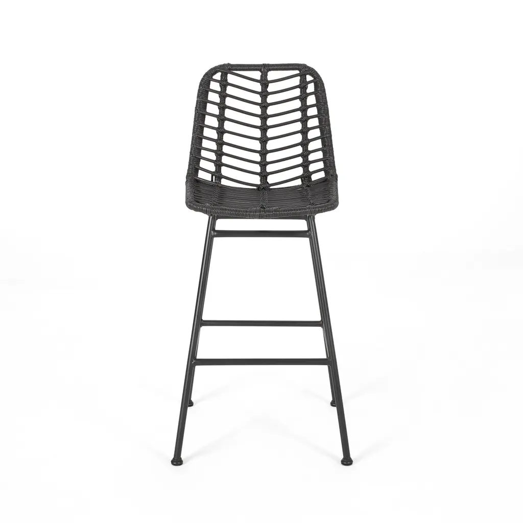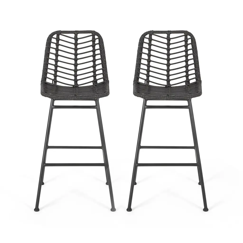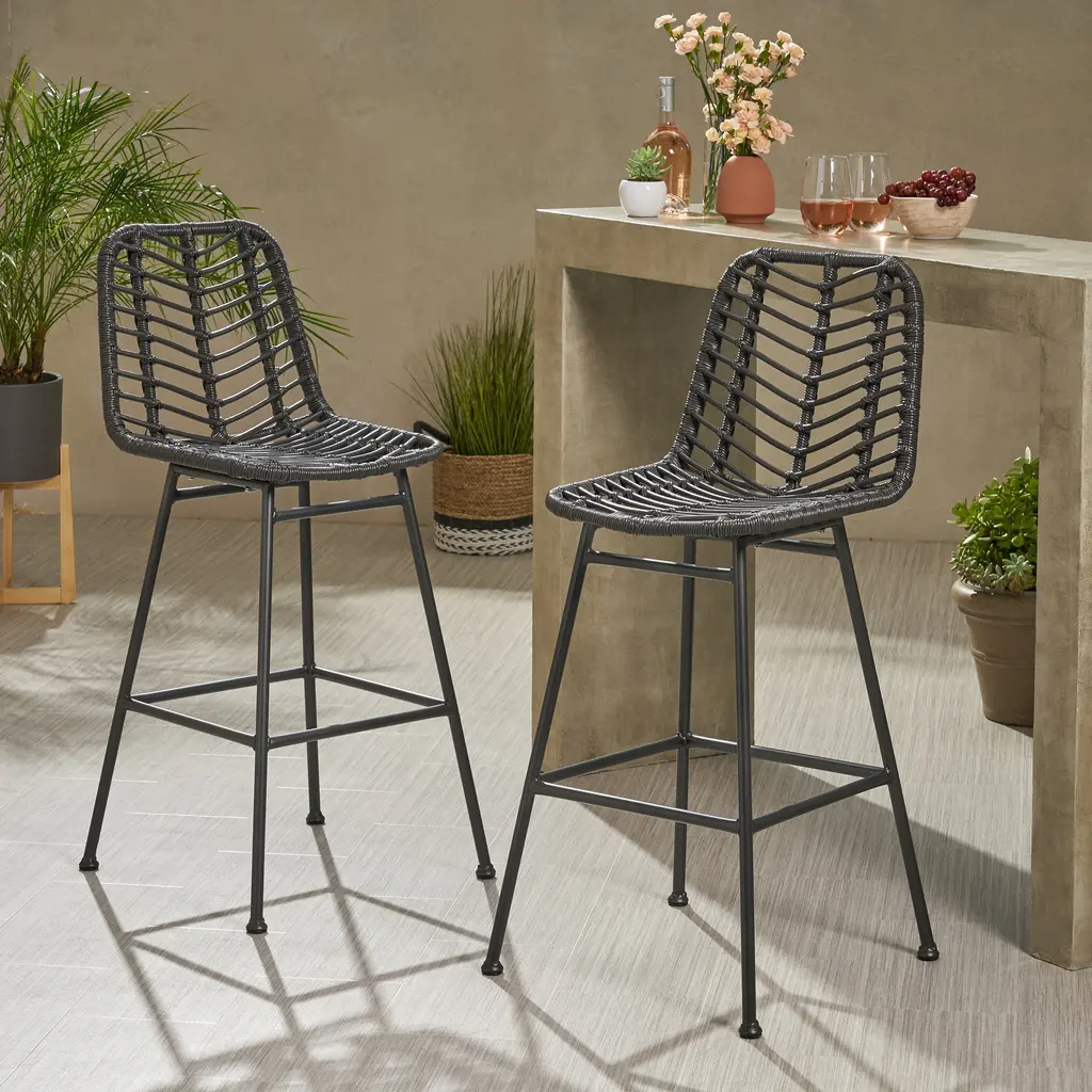 Add a touch of exquisite taste to your backyard bar with our refined yet outstanding bar stool set. Crafted to superior excellence, these bar stools perfectly blend rattan and metal to bring your outdoor space together with a flourish. The wrapped rattan design brings a modern twist to a classic look, making this ideal for any style of décor. With a thin angled frame, this bar stool set also provides a minimalistic yet durable structure that offers a stylish flair to your space.MODERN: With clean lines contrasted perfectly by its rounded edges, our rattan bar stool is the ideal modern accessory for your outdoor space. Finished with thin angled legs, this stool not only offers a sleek, minimalistic look but also provides a stable structure.POLYETHYLENE RATTAN: Featuring a long-lasting woven seat, this style is not only incredibly durable but also provides a versatile appearance. The handcrafted details of this material allow this piece to blend seamlessly with your outdoor décor.IRON FRAME: The frame of this bar stool consists of an iron material, making this incredibly durable and ensures that these will hold up under use. Finished with a polished black color, this frame emphasizes its modern style.BARSTOOL HEIGHT: This stool has a seat height of 28.75 inches, making this perfect for a backyard bar or a bistro bar set.ASSEMBLY REQUIRED: Some assembly is required for this set. All of the instructions and tools needed for assembly are included. This comes as a set of two.