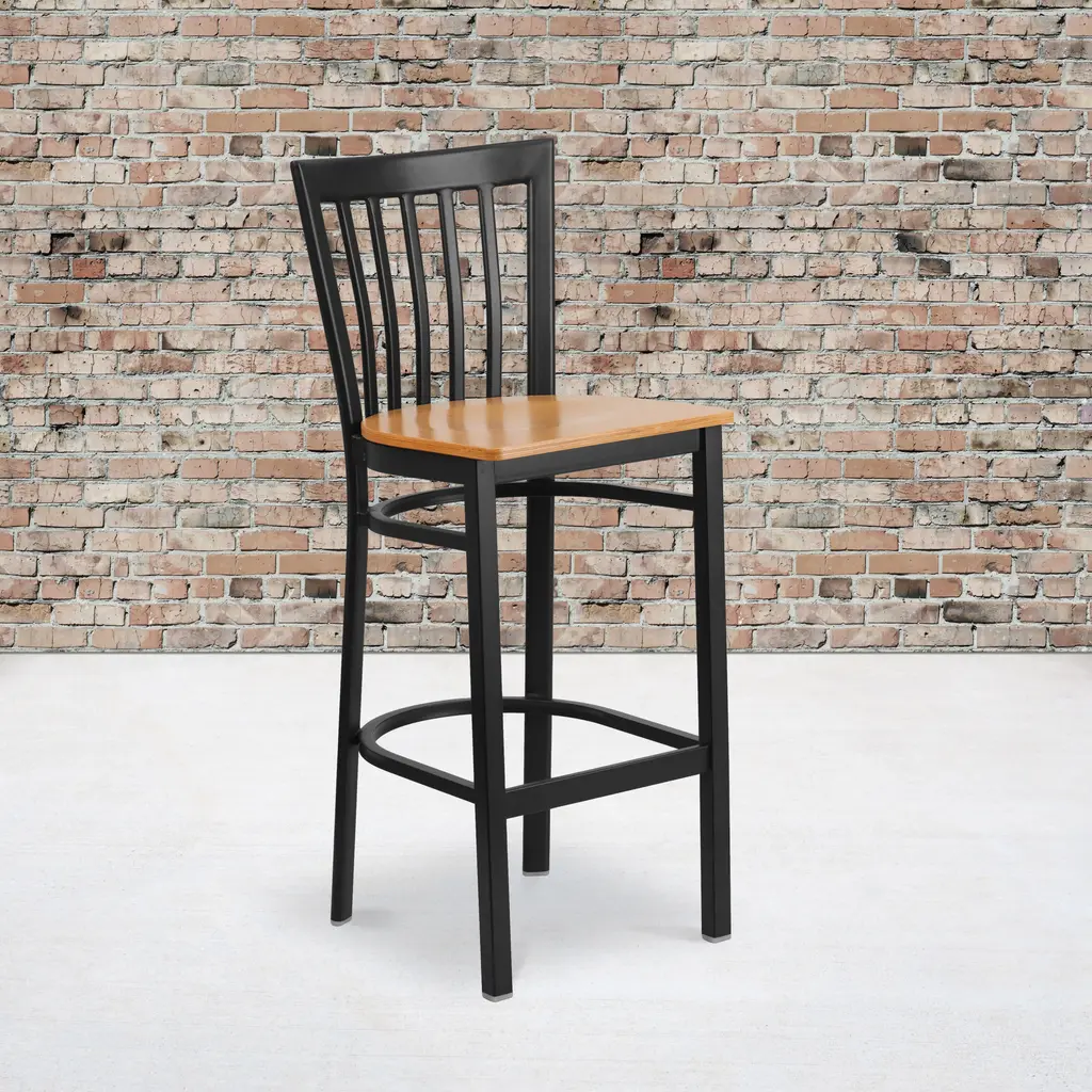 Create a first-rate dining experience by offering your patrons great food, service and attractive furnishings. Metal barstools are a popular choice for furnishing restaurants, pool halls, lounges, bars and other high traffic establishments. This school house back metal restaurant barstool is easy to clean, which is an important aspect for a business. Built to withstand everyday use in the restaurant and hospitality business, these dining stools will also The seat is designed to keep guests comfortable. The frame is stabilized using two welded support bars, which includes a footrest. The floor glides help protect your floors and ensure smooth gliding. Use this bar height stool in your dining room or home bar to give your decor a fresh look. The simple and lightweight design of this stool is a must have, whether used in the home or your commercial business.