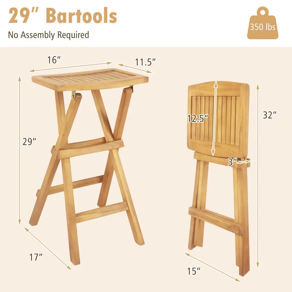 Specifications:Description:Crafted from durable teak wood, these outdoor bar stools offer a blend of timeless design and sturdy functionality, making them an excellent choice for any outdoor or indoor seating area. With a weight capacity of up to 350 lbs, these stools are designed for long-lasting use while ensuring comfort with their ergonomic shape and built-in footrest. Ideal for gatherings, these stools provide a comfortable seating experience, whether you're at a bar, Kitchen Island, or dining area. The folding design allows for quick and easy setup, and the compact size makes storage effortless, perfect for maximizing space in smaller areas. Standing at a standard 29-inch height, they are a great fit for most counters and bars, offering versatility for a variety of settings—from poolside parties to cozy indoor get-together. Lightweight and portable, these backless stools allow for easy movement and flexibility, making them a practical addition to any space.Key Features:● Luxurious Teak Elegance: The outdoor bar stools are crafted from premium teak wood for a timeless beauty. Their natural durability and robust construction ensure a lifetime of stylish seating, holding up to 350 lbs.● Crafted for Comfort: Revel in the ergonomic contours and integrated footrest of the bar height stools, designed to cradle your body for an unparalleled comfort experience. Perfect for lingering conversations and leisurely moments.● Effortless Setup, Space-Saving Design: Say goodbye to complicated assembly with these ready-to-use folding stools. The simple fold mechanism and compact storage solution make them an ideal addition to smaller areas.● Perfect Fit for Any Bar: At a standard 29-inch height, the bistro stools are the perfect match for most counters and bars. Enjoy the perfect seating height for your Kitchen Island, home bar, or dining setup.● Versatile Charm for Every Setting: Whether you're hosting a poolside party or a cozy indoor gathering, the portable backless stools effortlessly blend with any setting. They are also lightweight for a flexible arrangement, adapting to various needs.