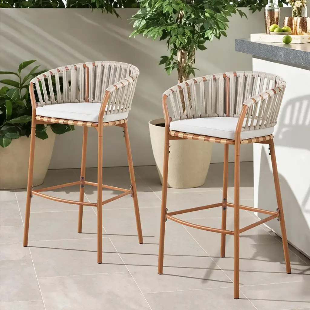 Refresh your patio, balcony, or poolside bar with this set of 2 outdoor metal rope barstools, designed to combine modern functionality with timeless outdoor style. Each stool features a sturdy iron frame finished in a warm, teak-wood look that brings the inviting feel of natural wood with the strength and resilience of metal. The semicircular, fan-shaped backrest and integrated armrests wrap gently around your body, creating a supportive and comfortable seat for long, relaxed evenings outdoors. Woven rope webbing along the backrest adds a stylish, coastal touch while providing extra durability against the elements. The plush beige cushion, upholstered in weather-resistant fabric, resists fading, stains, and moisture, keeping your outdoor seating looking fresh season after season. The low-profile back and streamlined silhouette are ideal for compact patios, balconies, or smaller outdoor dining spaces, offering comfort and elegance without taking up extra room. Whether hosting friends or enjoying a quiet sunset, these patio bar stools invite you to settle in and enjoy your outdoor space with confidence.