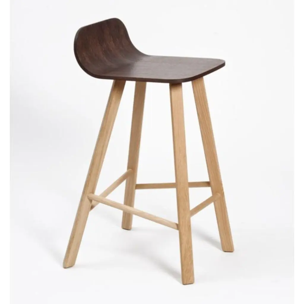 Set of 2, Tria stool, low back, coffee by Colé Italia with Lorenz & Kaz Dimensions: H.seat 67/77, H 79/89, D 52, W 48 cmMaterials: Legs in solid oak with triangular section. Shell low back in curved plywood oak veneeredAlso Available: Tria Stool Natural, High Back, Upholstered, Different Materials (Custom color for minimum 4 units), & upon request the bar stool version with seat high 78 cmTC: C.O.M. fabric - send us your own materialCA: Cat A - Angel (polypropylene), Ganesha (synt. leather), Nord Wool (felt)CB: Cat B - Tiffany (polyestere), Lana (aquaclean)CC: Cat C - Velvetforthy (Velvet), Topia (wool), Novum (Wool), Opera (felt)CP: Cat P - Milano (full grain leather) Our iconic chair designed by German duo Lorenz + Kaz. Tria is a table chair, at the same time many people place it asa sculpture, as ornament in an entrance, a bedroom or in a living room. It recalls the impossible forms of Dutch graphicartist and engraver Maurits Escher, defining itself in a game of twists and elusive leak. The corolla-shaped shell can beused in two different seating positions, center or side, in this case with one armrest. The shell is composed of three equal elements in bent plywood assembled together and veneered with a special wood finishing ivory/ black stripes.It is also available in veneered oak, natural or stained open pore in different colors, as well as customized colors (min. 4units). Available with 3 or 4 solid wood legs, or 4 metal legs in different finishings. For a better back comfort if you useTria chair in center position, for dining or studying, you can add a back cushion specially designed for it, upholsteredand coated with a wide range of fabrics.Colé is a young Italian design brand, with a high-end production 100% made in Italy. Born from the experience of Matteo De Ponti, architect, who grew up in one of the most outstanding Milanese design families, and the artistic sensibility of Laura Macagno, degree in Economics and passionate of art and design. Our Mission is to create design icons, beautiful and comfortable pieces that can Stand the test of time, furnishing houses of international and sophisticated clients, and realized with craftsmanship, thus unique. “We love objects which own deep roots, excellent quality, and a strong evocative power. Archetypal forms dressed with new beauty without losing their classical composure”.Our expressive research is inspired by the utopian force of Italian eminences grises architects and designers of the ’50s, the Scandinavian design, the Bauhaus, ethnic handcraft and houses of famous writers of the XX century, all different as a style but united by the intense soul of those who worked and lived there.