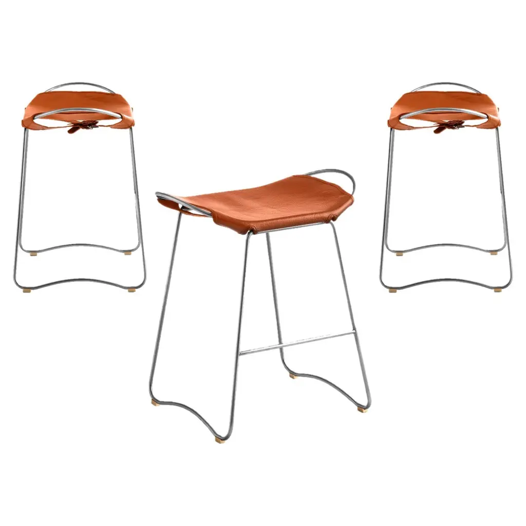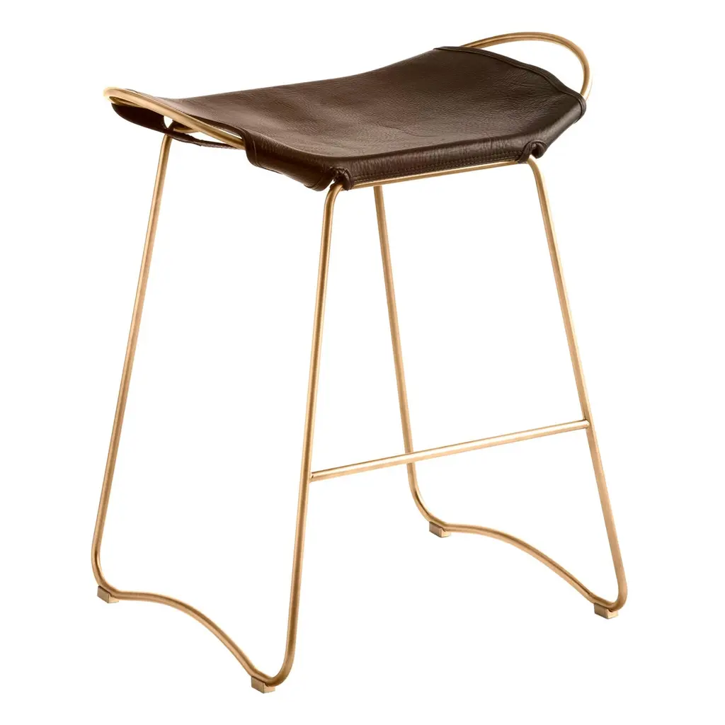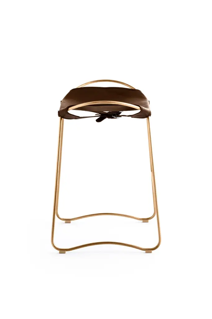 The Hug contemporary barstool is designed and conceived with a light aesthetic, the slight oscillation of the steel rod of 12 mm is complemented by the flexibility of the double 3.5 mm thick leather. When sitting in this furniture you feel an enveloping sensation, like being hugged, since the weight of the body is distributed evenly. Each unit becomes a refuge of visual and ergonomic wellbeing.Our Hug Collection is inspired by the organic lines of a landscape, the curves of nature, and the imaginary silhouette of the wind inspire this collection of organic forms, almost like metallic sculptures. All pieces are done with cold bended steel rods, polished, nickel plated, colored by electrolysis, and lacquered. The process of polishing and lacquering the steel, goes through a manual and delicate chroming process, which gives its final and unique metal color finish. This precise technique gives a uniform metallic finish of minimum 50 microns over the entire Surface. Our metal finishing has successfully passed a corrosion resistance test in a salt spray chamber according to UNE-EN ISO 9227: 2017 and UNE-EN ISO 1456: 2010. Our signature screws are made with brass turning lathed, polished, and lacquered, these are the pieces that fix the saddle leather to the metal frame.Leathers are Spanish hides vegetable tanned. We use premium saddles in multiple colors to adjust to your taste and interior needs. This traditional vegetable dying and tanning method is an organic technique that relies on natural tannings from bark or plant tissues. The use of oils and natural fats give the leather a distinctive flexibility and texture, allowing it to be molded, retain its shape and age graciously.All skins are carefully selected from food industry, with a minimum thickness of 3.5 mm / 0,02 in, using the part of the animal's shoulder, which allows for larger pieces and uniformity, even though signature wrinkle from the animal’s neck may be recognizable. The vegetable tanning is a traditional and artisan treatment, which is respectful to the environment. Even with careful selection natural marks as a result of the contact with other animals, the age, origin and characteristics of the skin, or even the season in which the tanning takes place cannot be avoided. We still believe that these factors only add authenticity and uniqueness to every piece. Our leather parts are made with double saddles, always showing the top side of the hides that presents the better quality.Customization options.With the aim of creating customized pieces, clients can select from the various metal finishes, and leather colors to create pieces that complement their home décor. Leather colors available, black, navy, dark brown, cognac and natural tobacco, and steel polished finishing available, aged brass, black smoke and aged silver.Normally we use tone on tone threats for stitches, but client can select a contrast option, being possible to select any color to make a unique piece for the project it belongs. The finish on the edges of our leather components are sanded and hand painted. We have the option of select an alternative color if not tone on tone will be applied.Please consult in case you are interested on having a particular heat embossing stamp on the leather with your own branding.Our collections are made to full fill home spaces where to gather and enjoy great conversation with families and friends. Occasional furniture for exquisite homes, from cottages to exclusive resorts. Our product is understood as a sculptural piece of design, as an art object to be displayed at different house spaces as library, bar, living, foyer, bedroom, powder, meeting, grand or great room.The different finishes options make the furniture perfect combinations on diverse styles, from rustic mountain home, a small cottage, a ski lodge retreat, or industrial a minimalist look.