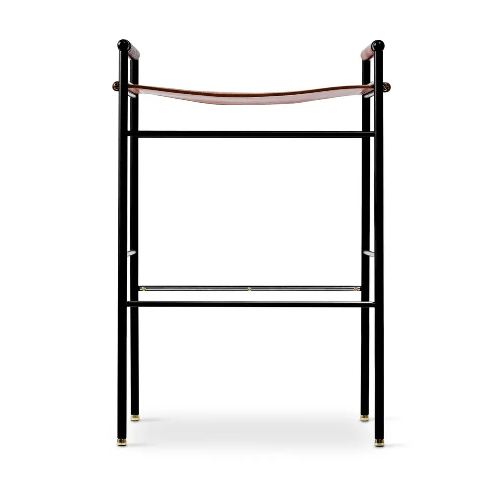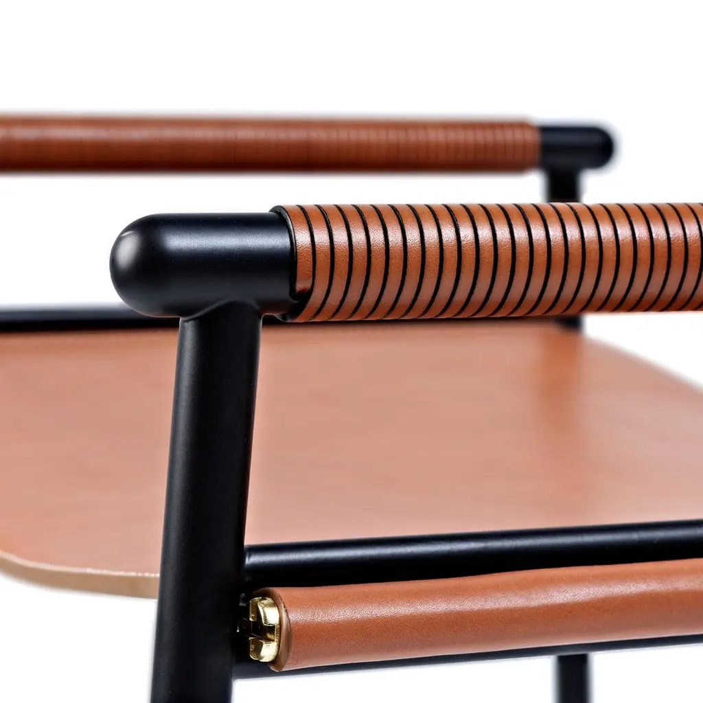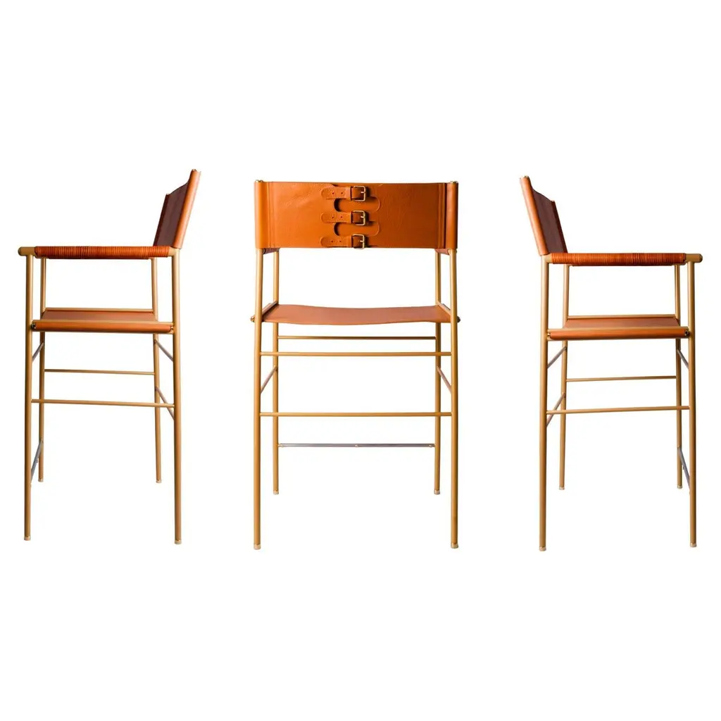 The “Repose” contemporary barstool belongs to a collection that revisit the director chair collection, serene pieces where exclusivity and precision are shown in small details such as the hand-turned metal nuts and bolts that fix the leather surfaces, that go unnoticed at first sight.The robustness of the steel structure is combined with the delicacy of the rounded structure. The matte metal finishes evoke the passage of time and are complemented by vegetable tanned cowhide leathers that age gracefully with its use.The “Repose” collection is designed and conceived as a tribute to director’s chair or luxury safari foldable furniture. All pieces are done with cold steel rods, machined on a turning lathe, black powder coated and lacquered with a matt rubber effect. Our signature screws are made with brass turning lathed, polished, and lacquered, these are the pieces that fix the saddle leather to the metal frame.Leathers are Spanish hides vegetable tanned. We use premium saddles in five colors to adjust to your taste and interior needs. This traditional vegetable dyeing and tanning method is an organic technique that relies on natural tannings from bark or plant tissues. The use of oils and natural fats give the leather a distinctive flexibility and texture, allowing it to be molded, retain its shape and age graciously.All skins are carefully selected from food industry sub-products, with a minimum thickness of 3.5 mm / 0,02 in, using the part of the animal's shoulder, which allows for larger pieces and uniformity, even though signature wrinkle from the animal’s neck may be recognizable. The vegetable tanning is a traditional and artisan treatment, which is respectful to the environment. Even with careful selection natural marks as a result of the contact with other animals, the age, origin and characteristics of the skin, or even the season in which the tanning takes place cannot be avoided. We still believe that these factors only add authenticity and uniqueness to every piece. Our leather parts are made with double saddles, always showing the top side of the hides that presents the better quality.Customization options.With the aim of creating customized pieces, clients can select from the various leather colors to create pieces that complement their home décor. Leather colors available, black, navy, dark brown, cognac and natural tobacco, and steel color is black.Normally we use off white threats for stitches, but client can select another option, being possible to select any color to make a unique piece for the project it belongs. The finish on the edges of our leather components is sanded and hand painted. We have the option to select an alternative color if not tone on tone will be applied.Please consult in case you are interested on having a particular heat embossing stamp on the leather.Our high-end collections are made to full fill home spaces where to gather and enjoy great conversation with families and friends. Occasional one-of-a-kind furniture for exquisite homes, from cottages to exclusive resorts. Our product is understood as a sculptural piece of design, as an art object to be displayed at different house spaces as library, bar, living, foyer, bedroom, powder, meeting, grand or great room.The different finishes options make the furniture perfect combinations on diverse styles, from rustic mountain home, a small cottage, a ski lodge retreat, or industrial a minimalist look. The 'Repose' contemporary armchair is a part of our exclusive collection that reimagines the classic director chair with a serene and exquisite design. Every detail is carefully crafted, from the hand-turned metal nuts and bolts that secure the leather surfaces, to the robust yet delicate combination of steel and rounded structure. The matte metal finishes evoke a timeless appeal, complemented by vegetable-tanned cowhide leathers that age gracefully over time.Designed as a tribute to director's chairs and luxury safari foldable furniture, the 'Repose' armchair is meticulously constructed using cold steel rods, machined on a turning lathe, and finished with a black powder coating and a matt rubber effect. Our signature brass screws not only add elegance but also securely fix the saddle leather to the metal frame.We use premium Spanish hides that undergo vegetable tanning, a traditional and environmentally-friendly technique relying on natural tannings from bark or plant tissues. The use of oils and natural fats gives the leather a distinctive flexibility, texture, and longevity, allowing it to mold, retain its shape, and age gracefully. Each skin is carefully selected from food industry sub-products, ensuring a minimum thickness of 3.5 mm / 0.02 in. While some natural marks and wrinkles from the animal's neck may be noticeable, we believe they enhance the authenticity and uniqueness of every piece.Our leather parts are made with double saddles, always showcasing the top side of the hides for superior quality. We offer customization options to suit individual preferences and home décor, with a range of leather colors including black, navy, dark brown, cognac, and natural tobacco. The steel color is black, seamlessly blending with various interior styles.For stitching, we typically use off-white threads, but clients have the flexibility to select alternative colors, making each piece truly unique. The edges of our leather components are meticulously sanded and hand-painted, providing a refined finish. Additionally, we offer the option to choose an alternative color for a striking contrast if a tone-on-tone effect is not preferred.If you desire a personal touch, we offer the possibility of incorporating a particular heat embossing stamp on the leather. Our high-end collections are designed to create a gathering space for families and friends, offering one-of-a-kind furniture for exquisite homes, ranging from cottages to exclusive resorts. Each piece is a sculptural work of art, perfect for vario