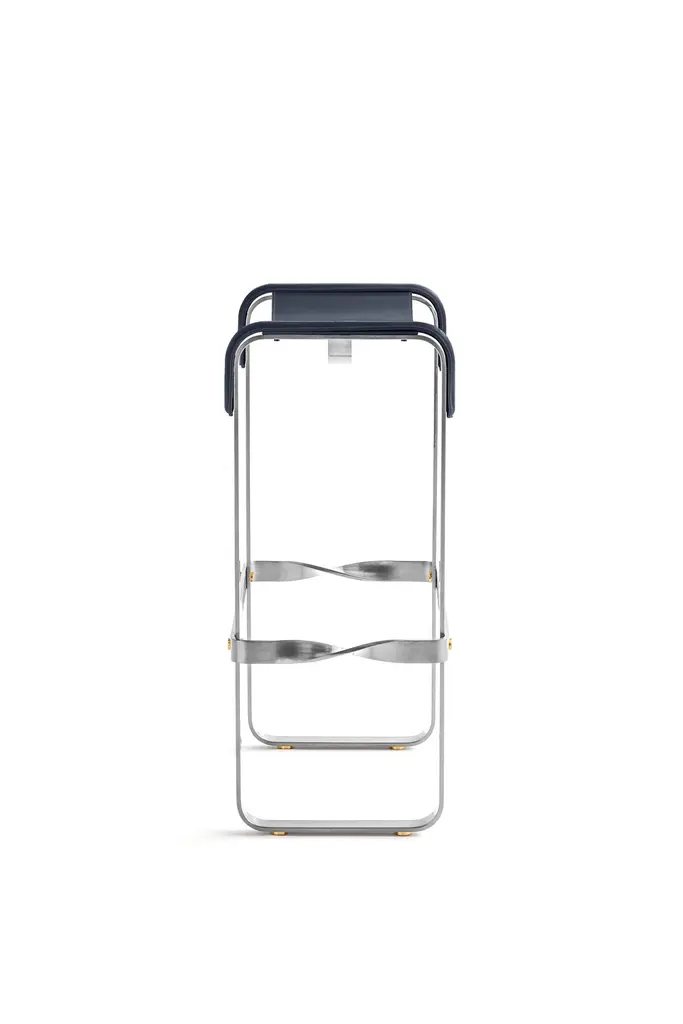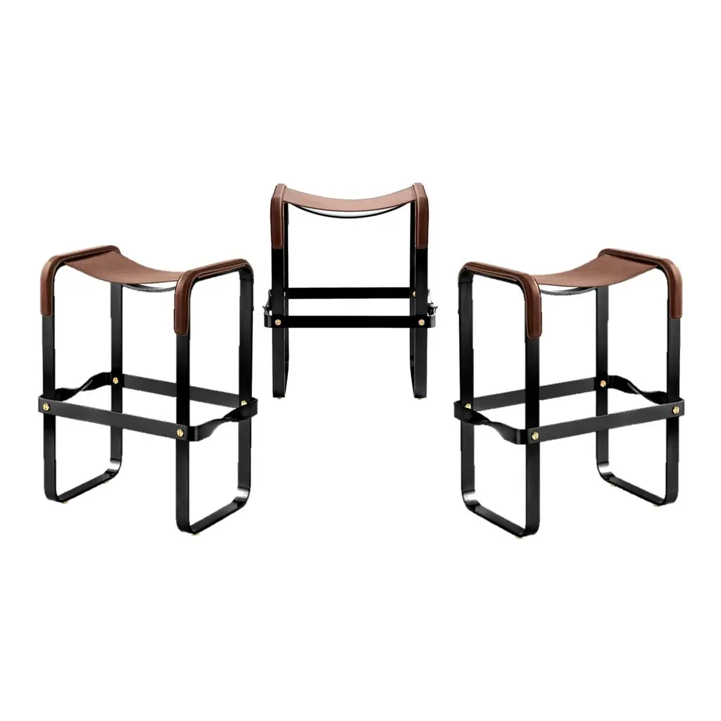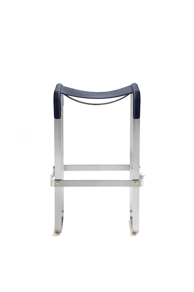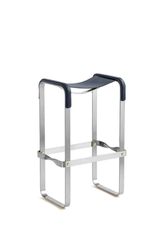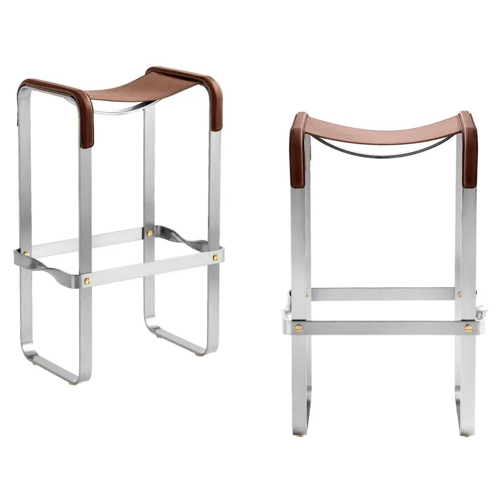 The Wanderlust contemporary barstool belongs to a collection of Minimalist and serene pieces where exclusivity and precision are shown in small details such as the hand-turned metal nuts and bolts that fix the leather surfaces, that go unnoticed at first sight.The robustness of the steel structure is combined with the delicacy of the rounded edges. The matte metal finishes evoke the passage of time and are complemented by vegetable tanned cowhide leathers that age gracefully with its use.The Wanderlust counter stool is designed and conceived as a tribute of Bauhaus tribute, the phrases "Less is more" and "God is in the detail" from the German American architect and Industrial designer Mies van der Rohe, one of the pioneers of modernist architecture, define this collection.All pieces are done with cold bended steel rods, polished, nickel plated, colored by electrolysis, and lacquered. The process of polishing and lacquering the steel, goes through a manual and delicate chroming process, which gives its final and unique metal color finish. This precise technique gives a uniform metallic finish of minimum 50 microns over the entire Surface. Our metal finishing has successfully passed a corrosion resistance test in a salt spray chamber according to UNE-EN ISO 9227: 2017 and UNE-EN ISO 1456: 2010. Our signature screws are made with brass turning lathed, polished, and lacquered, these are the pieces that fix the saddle leather to the metal frame.Leathers are Spanish hides vegetable tanned. We use premium saddles in multiple colors to adjust to your taste and interior needs. This traditional vegetable dying and tanning method is an organic technique that relies on natural tannings from bark or plant tissues. The use of oils and natural fats give the leather a distinctive flexibility and texture, allowing it to be molded, retain its shape and age graciously.All skins are carefully selected from food industry Sub-products, with a minimum thickness of 3.5 mm / 0,02 in, using the part of the animal's shoulder, which allows for larger pieces and uniformity, even though signature wrinkle from the animal’s neck may be recognizable. The vegetable tanning is a traditional and artisan treatment, which is respectful to the environment. Even with careful selection natural marks as a result of the contact with other animals, the age, origin and characteristics of the skin, or even the season in which the tanning takes place cannot be avoided. We still believe that these factors only add authenticity and uniqueness to every piece. Our leather parts are made with double saddles, always showing the top side of the hides that presents the better quality.Customization options.With the aim of creating customized pieces, clients can select from the various metal finishes, and leather colors to create pieces that complement their home décor. Leather colors available, black, navy, dark brown, cognac and natural tobacco, and steel polished finishing available, aged brass, black smoke and aged silver.Normally we use tone on tone threats for stitches, but client can select a contrast option, being possible to select any color to make a unique piece for the project it belongs. The finish on the edges of our leather components are sanded and hand painted. We have the option of select an alternative color if not tone on tone will be applied.Please consult in case you are interested on having a particular heat embossing stamp on the leather with your own branding.Our collections are made to full fill home spaces where to gather and enjoy great conversation with families and friends. Occasional furniture for exquisite homes, from cottages to exclusive resorts. Our product is understood as a sculptural piece of design, as an art object to be displayed at different house spaces as library, bar, living, foyer, bedroom, powder, meeting, grand or great room.The different finishes options make the furniture perfect combinations on diverse styles, from rustic mountain home, a small cottage, a ski lodge retreat, or industrial a minimalist look.