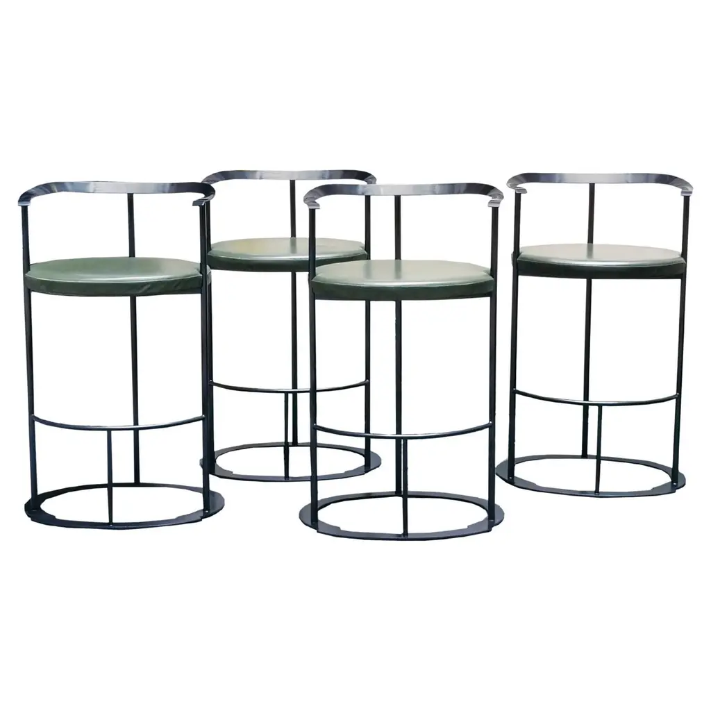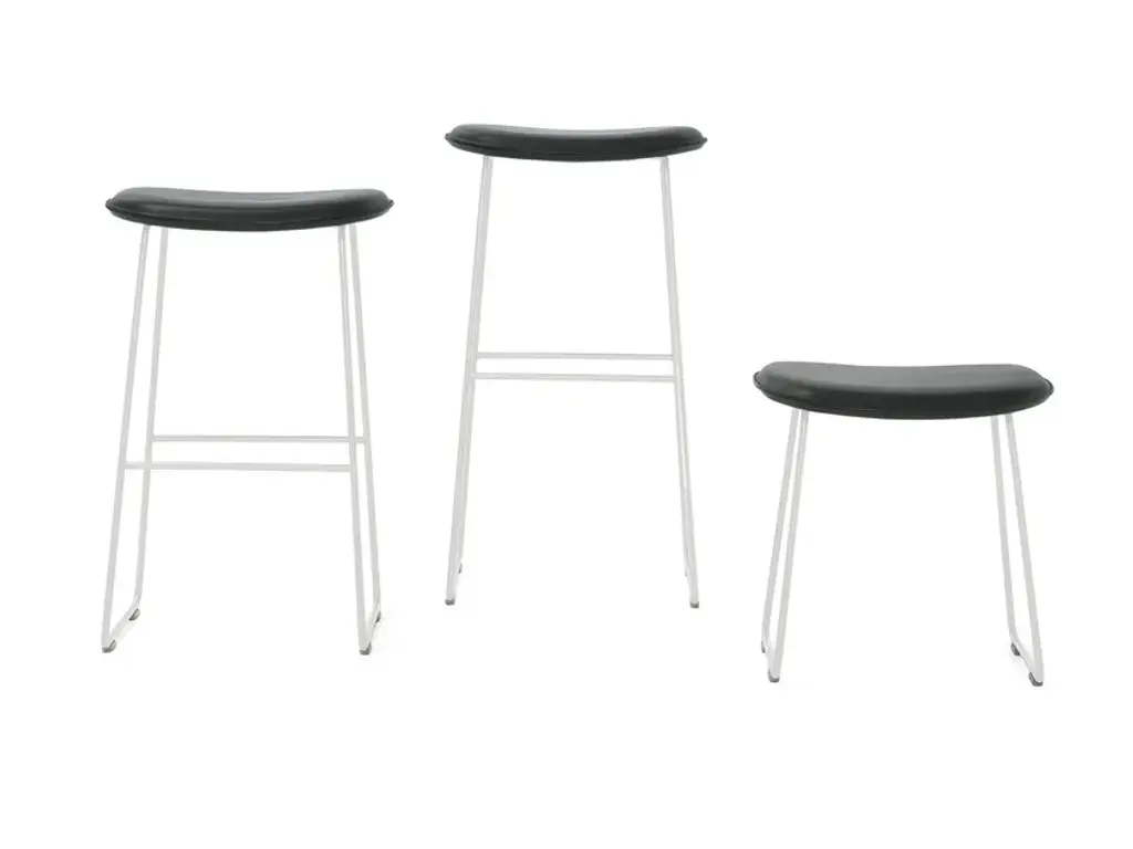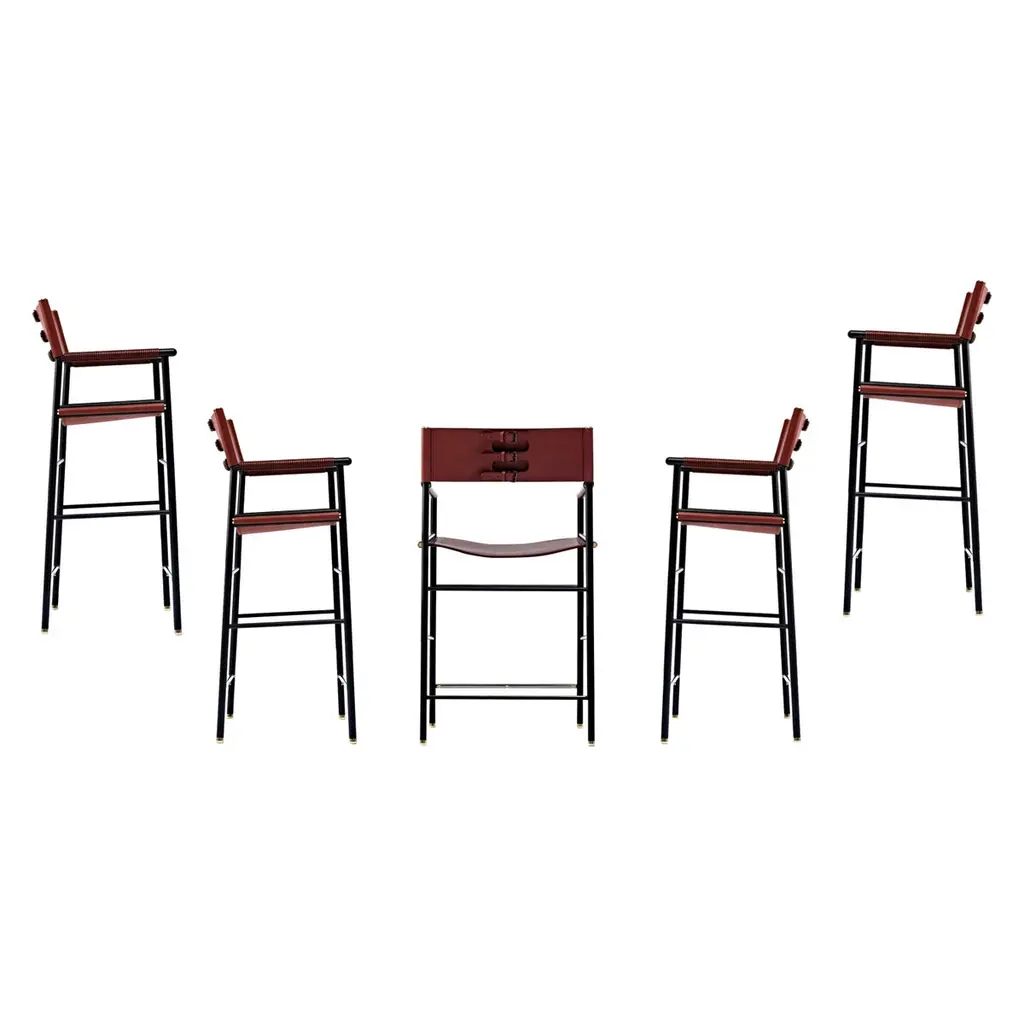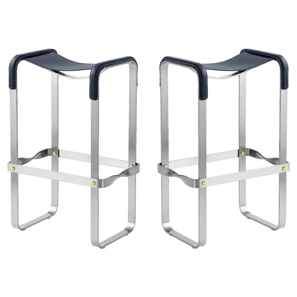 The Wanderlust contemporary barstool belongs to a collection of Minimalist and serene pieces where exclusivity and precision are shown in small details such as the hand-turned metal nuts and bolts that fix the leather surfaces, that go unnoticed at first sight.The robustness of the steel structure is combined with the delicacy of the rounded edges. The matte metal finishes evoke the passage of time and are complemented by vegetable tanned cowhide leathers that age gracefully with its use.The Wanderlust counter stool is designed and conceived as a tribute of Bauhaus tribute, the phrases "Less is more" and "God is in the detail" from the German American architect and Industrial designer Mies van der Rohe, one of the pioneers of modernist architecture, define this collection.All pieces are done with cold bended steel rods, polished, nickel plated, colored by electrolysis, and lacquered. The process of polishing and lacquering the steel, goes through a manual and delicate chroming process, which gives its final and unique metal color finish. This precise technique gives a uniform metallic finish of minimum 50 microns over the entire Surface. Our metal finishing has successfully passed a corrosion resistance test in a salt spray chamber according to UNE-EN ISO 9227: 2017 and UNE-EN ISO 1456: 2010. Our signature screws are made with brass turning lathed, polished, and lacquered, these are the pieces that fix the saddle leather to the metal frame.Leathers are Spanish hides vegetable tanned. We use premium saddles in multiple colors to adjust to your taste and interior needs. This traditional vegetable dying and tanning method is an organic technique that relies on natural tannings from bark or plant tissues. The use of oils and natural fats give the leather a distinctive flexibility and texture, allowing it to be molded, retain its shape and age graciously.All skins are carefully selected from food industry Sub-products, with a minimum thickness of 3.5 mm / 0,02 in, using the part of the animal's shoulder, which allows for larger pieces and uniformity, even though signature wrinkle from the animal’s neck may be recognizable. The vegetable tanning is a traditional and artisan treatment, which is respectful to the environment. Even with careful selection natural marks as a result of the contact with other animals, the age, origin and characteristics of the skin, or even the season in which the tanning takes place cannot be avoided. We still believe that these factors only add authenticity and uniqueness to every piece. Our leather parts are made with double saddles, always showing the top side of the hides that presents the better quality.Customization options.With the aim of creating customized pieces, clients can select from the various metal finishes, and leather colors to create pieces that complement their home décor. Leather colors available, black, navy, dark brown, cognac and natural tobacco, and steel polished finishing available, aged brass, black smoke and aged silver.Normally we use tone on tone threats for stitches, but client can select a contrast option, being possible to select any color to make a unique piece for the project it belongs. The finish on the edges of our leather components are sanded and hand painted. We have the option of select an alternative color if not tone on tone will be applied.Please consult in case you are interested on having a particular heat embossing stamp on the leather with your own branding.Our collections are made to full fill home spaces where to gather and enjoy great conversation with families and friends. Occasional furniture for exquisite homes, from cottages to exclusive resorts. Our product is understood as a sculptural piece of design, as an art object to be displayed at different house spaces as library, bar, living, foyer, bedroom, powder, meeting, grand or great room.The different finishes options make the furniture perfect combinations on diverse styles, from rustic mountain home, a small cottage, a ski lodge retreat, or industrial a minimalist look.