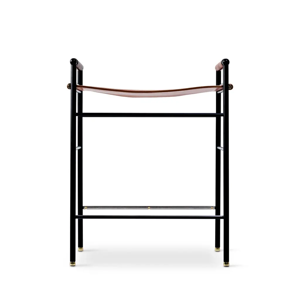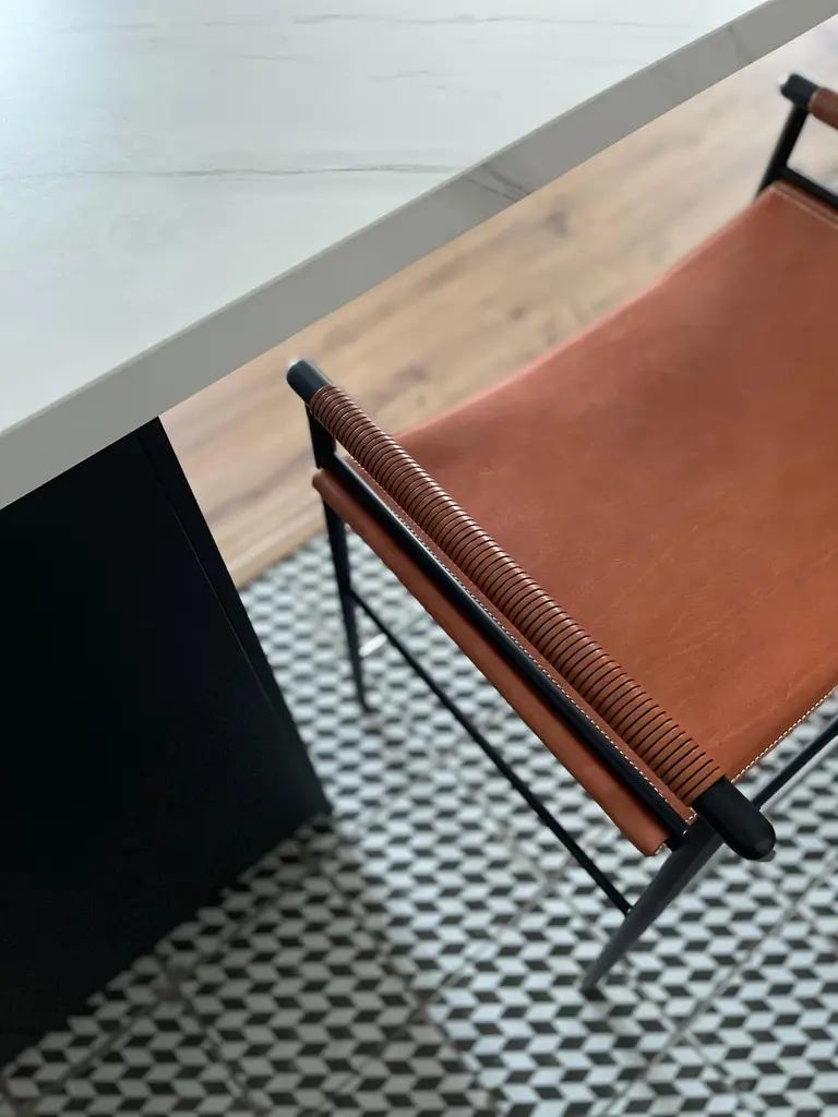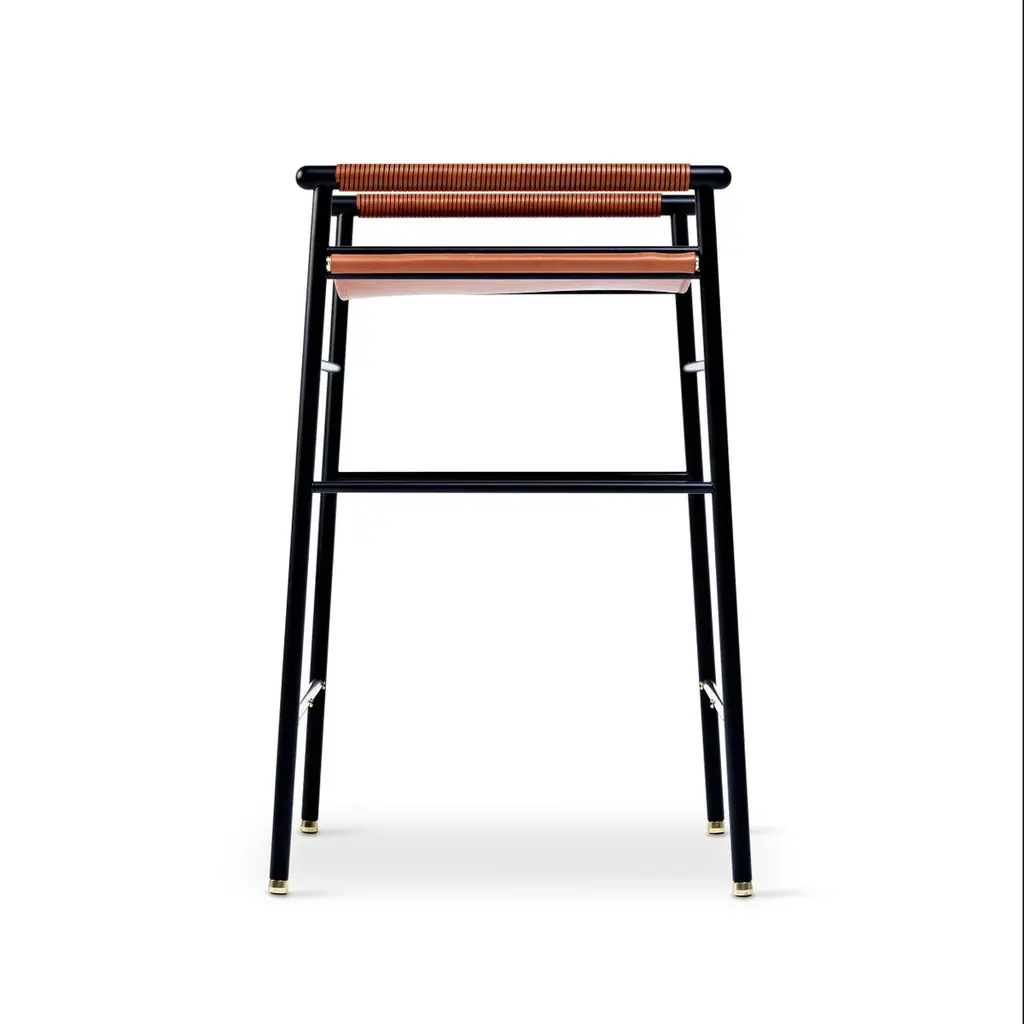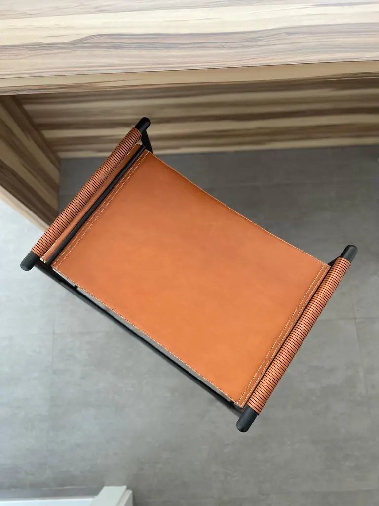 The “Repose” contemporary counter stool belongs to a collection that revisit the director chair collection, serene pieces where exclusivity and precision are shown in small details such as the hand-turned metal nuts and bolts that fix the leather surfaces, that go unnoticed at first sight.The robustness of the steel structure is combined with the delicacy of the rounded structure. The matte metal finishes evoke the passage of time and are complemented by vegetable tanned cowhide leathers that age gracefully with its use.The “Repose” collection is designed and conceived as a tribute to director’s chair or luxury safari foldable furniture. All pieces are done with cold steel rods, machined on a turning lathe, black powder coated and lacquered with a matt rubber effect. Our signature screws are made with brass turning lathed, polished, and lacquered, these are the pieces that fix the saddle leather to the metal frame.Leathers are Spanish hides vegetable tanned. We use premium saddles in five colors to adjust to your taste and interior needs. This traditional vegetable dyeing and tanning method is an organic technique that relies on natural tannings from bark or plant tissues. The use of oils and natural fats give the leather a distinctive flexibility and texture, allowing it to be molded, retain its shape and age graciously.All skins are carefully selected from food industry sub-products, with a minimum thickness of 3.5 mm / 0,02 in, using the part of the animal's shoulder, which allows for larger pieces and uniformity, even though signature wrinkle from the animal’s neck may be recognizable. The vegetable tanning is a traditional and artisan treatment, which is respectful to the environment. Even with careful selection natural marks as a result of the contact with other animals, the age, origin and characteristics of the skin, or even the season in which the tanning takes place cannot be avoided. We still believe that these factors only add authenticity and uniqueness to every piece. Our leather parts are made with double saddles, always showing the top side of the hides that presents the better quality.Customization options.With the aim of creating customized pieces, clients can select from the various leather colors to create pieces that complement their home décor. Leather colors available, black, navy, dark brown, cognac and natural tobacco, and steel color is black.Normally we use off white threats for stitches, but client can select another option, being possible to select any color to make a unique piece for the project it belongs. The finish on the edges of our leather components is sanded and hand painted. We have the option to select an alternative color if not tone on tone will be applied.Please consult in case you are interested on having a particular heat embossing stamp on the leather.Our high-end collections are made to full fill home spaces where to gather and enjoy great conversation with families and friends. Occasional one-of-a-kind furniture for exquisite homes, from cottages to exclusive resorts. Our product is understood as a sculptural piece of design, as an art object to be displayed at different house spaces as library, bar, living, foyer, bedroom, powder, meeting, grand or great room.The different finishes options make the furniture perfect combinations on diverse styles, from rustic mountain home, a small cottage, a ski lodge retreat, or industrial a minimalist look. The 'Repose' contemporary armchair is a part of our exclusive collection that reimagines the classic director chair with a serene and exquisite design. Every detail is carefully crafted, from the hand-turned metal nuts and bolts that secure the leather surfaces, to the robust yet delicate combination of steel and rounded structure. The matte metal finishes evoke a timeless appeal, complemented by vegetable-tanned cowhide leathers that age gracefully over time.Designed as a tribute to director's chairs and luxury safari foldable furniture, the 'Repose' armchair is meticulously constructed using cold steel rods, machined on a turning lathe, and finished with a black powder coating and a matt rubber effect. Our signature brass screws not only add elegance but also securely fix the saddle leather to the metal frame.We use premium Spanish hides that undergo vegetable tanning, a traditional and environmentally-friendly technique relying on natural tannings from bark or plant tissues. The use of oils and natural fats gives the leather a distinctive flexibility, texture, and longevity, allowing it to mold, retain its shape, and age gracefully. Each skin is carefully selected from food industry sub-products, ensuring a minimum thickness of 3.5 mm / 0.02 in. While some natural marks and wrinkles from the animal's neck may be noticeable, we believe they enhance the authenticity and uniqueness of every piece.Our leather parts are made with double saddles, always showcasing the top side of the hides for superior quality. We offer customization options to suit individual preferences and home décor, with a range of leather colors including black, navy, dark brown, cognac, and natural tobacco. The steel color is black, seamlessly blending with various interior styles.For stitching, we typically use off-white threads, but clients have the flexibility to select alternative colors, making each piece truly unique. The edges of our leather components are meticulously sanded and hand-painted, providing a refined finish. Additionally, we offer the option to choose an alternative color for a striking contrast if a tone-on-tone effect is not preferred.If you desire a personal touch, we offer the possibility of incorporating a particular heat embossing stamp on the leather. Our high-end collections are designed to create a gathering space for families and friends, offering one-of-a-kind furniture for exquisite homes, ranging from cottages to exclusive resorts. Each piece is a sculptural work of art, perfect for 