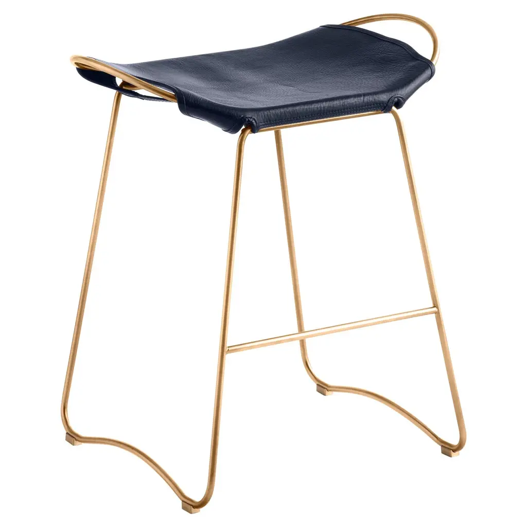 Set Of 3 Contemporary Kitchen Counter Bar Stool Aged Brass Metal & Navy Leather