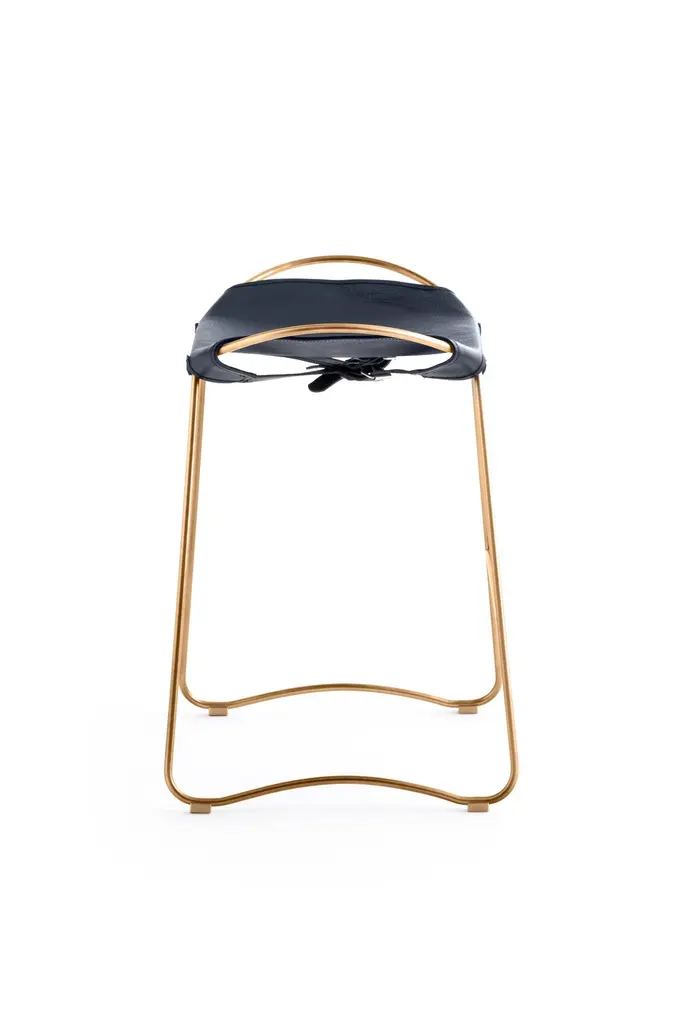 The Hug contemporary counter stool is designed and conceived with a light aesthetic, the slight oscillation of the steel rod of 12 mm is complemented by the flexibility of the double 3.5 mm thick leather. When sitting in this furniture you feel an enveloping sensation, like being hugged, since the weight of the body is distributed evenly. Each unit becomes a refuge of visual and ergonomic wellbeing.Our Hug Collection is inspired by the organic lines of a landscape, the curves of nature, and the imaginary silhouette of the wind inspire this collection of organic forms, almost like metallic sculptures. All pieces are done with cold bended steel rods, polished, nickel plated, colored by electrolysis, and lacquered. The process of polishing and lacquering the steel, goes through a manual and delicate chroming process, which gives its final and unique metal color finish. This precise technique gives a uniform metallic finish of minimum 50 microns over the entire Surface. Our metal finishing has successfully passed a corrosion resistance test in a salt spray chamber according to UNE-EN ISO 9227: 2017 and UNE-EN ISO 1456: 2010. Our signature screws are made with brass turning lathed, polished, and lacquered, these are the pieces that fix the saddle leather to the metal frame.Leathers are Spanish hides vegetable tanned. We use premium saddles in multiple colors to adjust to your taste and interior needs. This traditional vegetable dying and tanning method is an organic technique that relies on natural tannings from bark or plant tissues. The use of oils and natural fats give the leather a distinctive flexibility and texture, allowing it to be molded, retain its shape and age graciously.All skins are carefully selected from food industry, with a minimum thickness of 3.5 mm / 0,02 in, using the part of the animal's shoulder, which allows for larger pieces and uniformity, even though signature wrinkle from the animal’s neck may be recognizable. The vegetable tanning is a traditional and artisan treatment, which is respectful to the environment. Even with careful selection natural marks as a result of the contact with other animals, the age, origin and characteristics of the skin, or even the season in which the tanning takes place cannot be avoided. We still believe that these factors only add authenticity and uniqueness to every piece. Our leather parts are made with double saddles, always showing the top side of the hides that presents the better quality.Customization options.With the aim of creating customized pieces, clients can select from the various metal finishes, and leather colors to create pieces that complement their home décor. Leather colors available, black, navy, dark brown, cognac and natural tobacco, and steel polished finishing available, aged brass, black smoke and aged silver.Normally we use tone on tone threats for stitches, but client can select a contrast option, being possible to select any color to make a unique piece for the project it belongs. The finish on the edges of our leather components are sanded and hand painted. We have the option of select an alternative color if not tone on tone will be applied.Please consult in case you are interested on having a particular heat embossing stamp on the leather with your own branding.Our collections are made to full fill home spaces where to gather and enjoy great conversation with families and friends. Occasional furniture for exquisite homes, from cottages to exclusive resorts. Our product is understood as a sculptural piece of design, as an art object to be displayed at different house spaces as library, bar, living, foyer, bedroom, powder, meeting, grand or great room.The different finishes options make the furniture perfect combinations on diverse styles, from rustic mountain home, a small cottage, a ski lodge retreat, or industrial a minimalist look.