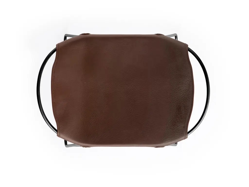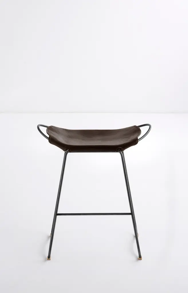 The Hug contemporary counter stool is designed and conceived with a light aesthetic, the slight oscillation of the steel rod of 12 mm is complemented by the flexibility of the double 3.5 mm thick leather. When sitting in this furniture you feel an enveloping sensation, like being hugged, since the weight of the body is distributed evenly. Each unit becomes a refuge of visual and ergonomic wellbeing.Our Hug Collection is inspired by the organic lines of a landscape, the curves of nature, and the imaginary silhouette of the wind inspire this collection of organic forms, almost like metallic sculptures. All pieces are done with cold bended steel rods, polished, nickel plated, colored by electrolysis, and lacquered. The process of polishing and lacquering the steel, goes through a manual and delicate chroming process, which gives its final and unique metal color finish. This precise technique gives a uniform metallic finish of minimum 50 microns over the entire Surface. Our metal finishing has successfully passed a corrosion resistance test in a salt spray chamber according to UNE-EN ISO 9227: 2017 and UNE-EN ISO 1456: 2010. Our signature screws are made with brass turning lathed, polished, and lacquered, these are the pieces that fix the saddle leather to the metal frame.Leathers are Spanish hides vegetable tanned. We use premium saddles in multiple colors to adjust to your taste and interior needs. This traditional vegetable dying and tanning method is an organic technique that relies on natural tannings from bark or plant tissues. The use of oils and natural fats give the leather a distinctive flexibility and texture, allowing it to be molded, retain its shape and age graciously.All skins are carefully selected from food industry, with a minimum thickness of 3.5 mm / 0,02 in, using the part of the animal's shoulder, which allows for larger pieces and uniformity, even though signature wrinkle from the animal’s neck may be recognizable. The vegetable tanning is a traditional and artisan treatment, which is respectful to the environment. Even with careful selection natural marks as a result of the contact with other animals, the age, origin and characteristics of the skin, or even the season in which the tanning takes place cannot be avoided. We still believe that these factors only add authenticity and uniqueness to every piece. Our leather parts are made with double saddles, always showing the top side of the hides that presents the better quality.Customization options.With the aim of creating customized pieces, clients can select from the various metal finishes, and leather colors to create pieces that complement their home décor. Leather colors available, black, navy, dark brown, cognac and natural tobacco, and steel polished finishing available, aged brass, black smoke and aged silver.Normally we use tone on tone threats for stitches, but client can select a contrast option, being possible to select any color to make a unique piece for the project it belongs. The finish on the edges of our leather components are sanded and hand painted. We have the option of select an alternative color if not tone on tone will be applied.Please consult in case you are interested on having a particular heat embossing stamp on the leather with your own branding.Our collections are made to full fill home spaces where to gather and enjoy great conversation with families and friends. Occasional furniture for exquisite homes, from cottages to exclusive resorts. Our product is understood as a sculptural piece of design, as an art object to be displayed at different house spaces as library, bar, living, foyer, bedroom, powder, meeting, grand or great room.The different finishes options make the furniture perfect combinations on diverse styles, from rustic mountain home, a small cottage, a ski lodge retreat, or industrial a minimalist look.
