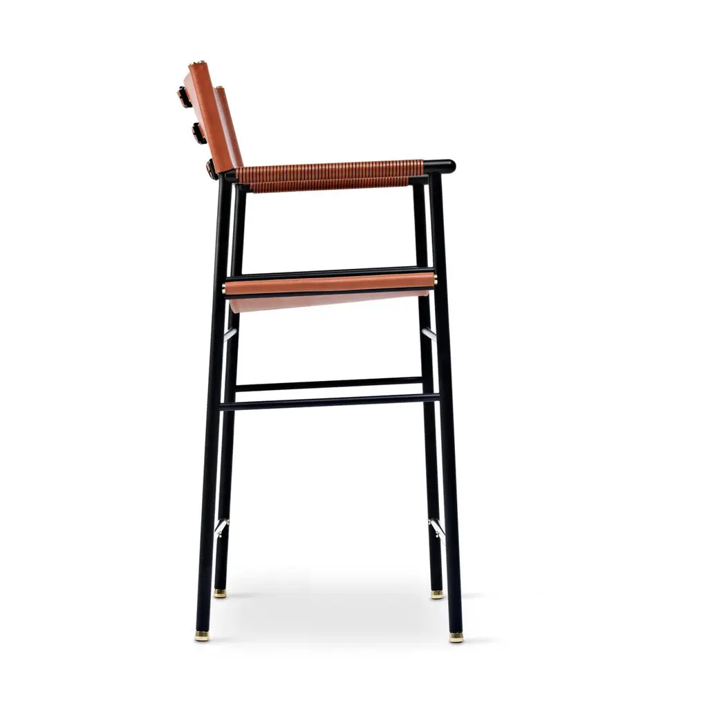 The “Repose” contemporary counter height stool belongs to a collection that revisit the director chair collection, serene pieces where exclusivity and precision are shown in small details such as the hand-turned metal nuts and bolts that fix the leather surfaces, that go unnoticed at first sight.The robustness of the steel structure is combined with the delicacy of the rounded structure. The matte metal finishes evoke the passage of time and are complemented by vegetable tanned cowhide leathers that age gracefully with its use.The “Repose” armchair is designed and conceived as a tribute to director’s chair or luxury safari foldable furniture. All pieces are done with cold steel rods, machined on a turning lathe, black powder coated and lacquered with a matt rubber effect. Our signature screws are made with brass turning lathed, polished, and lacquered, these are the pieces that fix the saddle leather to the metal frame.Leathers are Spanish hides vegetable tanned. We use premium saddles in five colors to adjust to your taste and interior needs. This traditional vegetable dyeing and tanning method is an organic technique that relies on natural tannings from bark or plant tissues. The use of oils and natural fats give the leather a distinctive flexibility and texture, allowing it to be molded, retain its shape and age graciously.All skins are carefully selected from food industry sub-products, with a minimum thickness of 3.5 mm / 0,02 in, using the part of the animal's shoulder, which allows for larger pieces and uniformity, even though signature wrinkle from the animal’s neck may be recognizable. The vegetable tanning is a traditional and artisan treatment, which is respectful to the environment. Even with careful selection natural marks as a result of the contact with other animals, the age, origin and characteristics of the skin, or even the season in which the tanning takes place cannot be avoided. We still believe that these factors only add authenticity and uniqueness to every piece. Our leather parts are made with double saddles, always showing the top side of the hides that presents the better quality.Customization options.With the aim of creating customized pieces, clients can select from the various leather colors to create pieces that complement their home décor. Leather colors available, black, navy, dark brown, cognac and natural tobacco, and steel color is black.Normally we use off white threats for stitches, but client can select another option, being possible to select any color to make a unique piece for the project it belongs. The finish on the edges of our leather components is sanded and hand painted. We have the option to select an alternative color if not tone on tone will be applied.Please consult in case you are interested on having a particular heat embossing stamp on the leather.Our high-end collections are made to full fill home spaces where to gather and enjoy great conversation with families and friends. Occasional one-of-a-kind furniture for exquisite homes, from cottages to exclusive resorts. Our product is understood as a sculptural piece of design, as an art object to be displayed at different house spaces as library, bar, living, foyer, bedroom, powder, meeting, grand or great room.The different finishes options make the furniture perfect combinations on diverse styles, from rustic mountain home, a small cottage, a ski lodge retreat, or industrial a minimalist look. The 'Repose' contemporary armchair is a part of our exclusive collection that reimagines the classic director chair with a serene and exquisite design. Every detail is carefully crafted, from the hand-turned metal nuts and bolts that secure the leather surfaces, to the robust yet delicate combination of steel and rounded structure. The matte metal finishes evoke a timeless appeal, complemented by vegetable-tanned cowhide leathers that age gracefully over time.Designed as a tribute to director's chairs and luxury safari foldable furniture, the 'Repose' armchair is meticulously constructed using cold steel rods, machined on a turning lathe, and finished with a black powder coating and a matt rubber effect. Our signature brass screws not only add elegance but also securely fix the saddle leather to the metal frame.We use premium Spanish hides that undergo vegetable tanning, a traditional and environmentally-friendly technique relying on natural tannings from bark or plant tissues. The use of oils and natural fats gives the leather a distinctive flexibility, texture, and longevity, allowing it to mold, retain its shape, and age gracefully. Each skin is carefully selected from food industry sub-products, ensuring a minimum thickness of 3.5 mm / 0.02 in. While some natural marks and wrinkles from the animal's neck may be noticeable, we believe they enhance the authenticity and uniqueness of every piece.Our leather parts are made with double saddles, always showcasing the top side of the hides for superior quality. We offer customization options to suit individual preferences and home décor, with a range of leather colors including black, navy, dark brown, cognac, and natural tobacco. The steel color is black, seamlessly blending with various interior styles.For stitching, we typically use off-white threads, but clients have the flexibility to select alternative colors, making each piece truly unique. The edges of our leather components are meticulously sanded and hand-painted, providing a refined finish. Additionally, we offer the option to choose an alternative color for a striking contrast if a tone-on-tone effect is not preferred.If you desire a personal touch, we offer the possibility of incorporating a particular heat embossing stamp on the leather. Our high-end collections are designed to create a gathering space for families and friends, offering one-of-a-kind furniture for exquisite homes, ranging from cottages to exclusive resorts. Each piece is a sculptural work of art, perfect