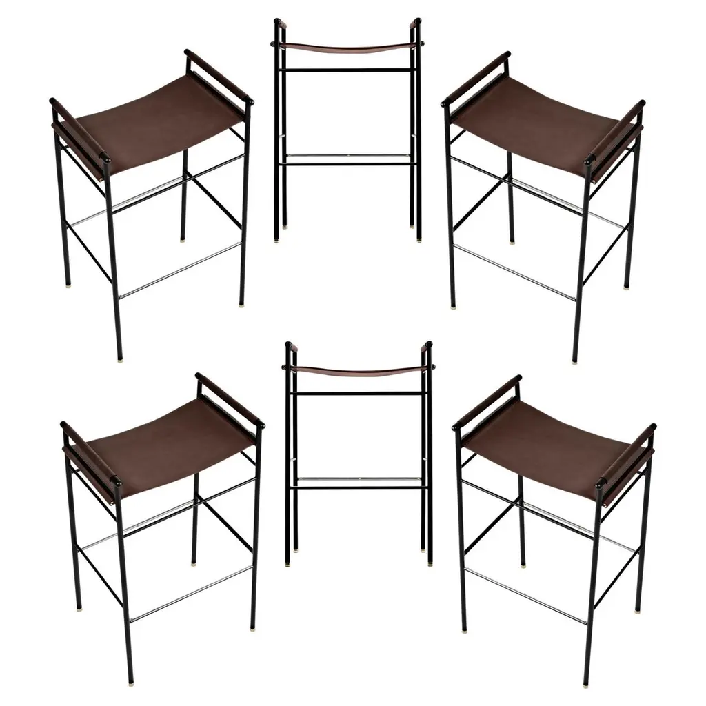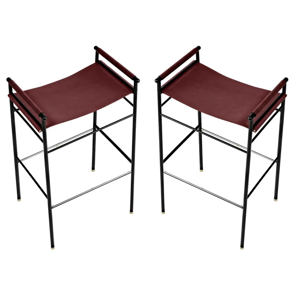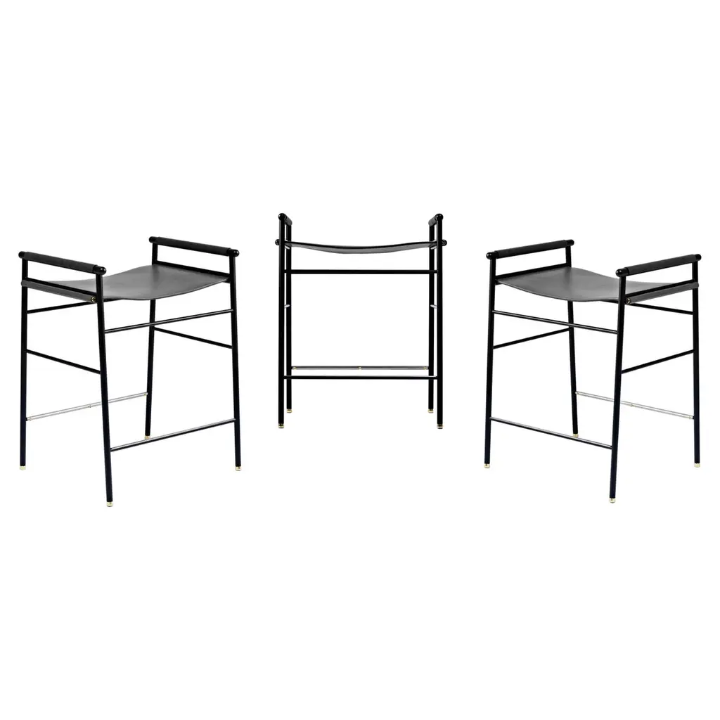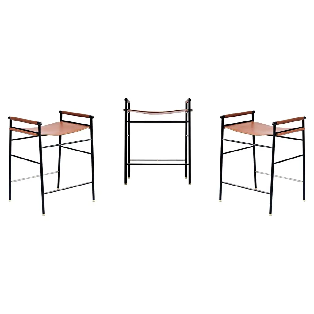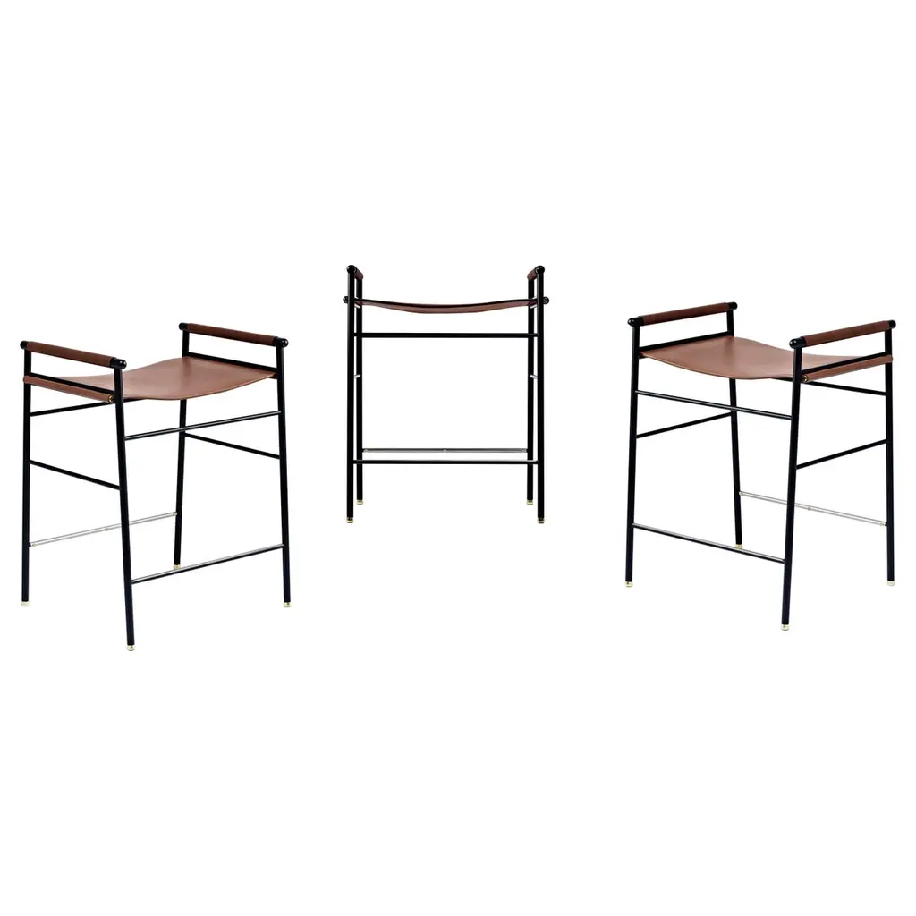 The “Repose” contemporary counter stool belongs to a collection that revisit the director chair collection, serene pieces where exclusivity and precision are shown in small details such as the hand-turned metal nuts and bolts that fix the leather surfaces, that go unnoticed at first sight.The robustness of the steel structure is combined with the delicacy of the rounded structure. The matte metal finishes evoke the passage of time and are complemented by vegetable tanned cowhide leathers that age gracefully with its use.The “Repose” collection is designed and conceived as a tribute to director’s chair or luxury safari foldable furniture. All pieces are done with cold steel rods, machined on a turning lathe, black powder coated and lacquered with a matt rubber effect. Our signature screws are made with brass turning lathed, polished, and lacquered, these are the pieces that fix the saddle leather to the metal frame.Leathers are Spanish hides vegetable tanned. We use premium saddles in five colors to adjust to your taste and interior needs. This traditional vegetable dyeing and tanning method is an organic technique that relies on natural tannings from bark or plant tissues. The use of oils and natural fats give the leather a distinctive flexibility and texture, allowing it to be molded, retain its shape and age graciously.All skins are carefully selected from food industry sub-products, with a minimum thickness of 3.5 mm / 0,02 in, using the part of the animal's shoulder, which allows for larger pieces and uniformity, even though signature wrinkle from the animal’s neck may be recognizable. The vegetable tanning is a traditional and artisan treatment, which is respectful to the environment. Even with careful selection natural marks as a result of the contact with other animals, the age, origin and characteristics of the skin, or even the season in which the tanning takes place cannot be avoided. We still believe that these factors only add authenticity and uniqueness to every piece. Our leather parts are made with double saddles, always showing the top side of the hides that presents the better quality.Customization options.With the aim of creating customized pieces, clients can select from the various leather colors to create pieces that complement their home décor. Leather colors available, black, navy, dark brown, cognac and natural tobacco, and steel color is black.Normally we use off white threats for stitches, but client can select another option, being possible to select any color to make a unique piece for the project it belongs. The finish on the edges of our leather components is sanded and hand painted. We have the option to select an alternative color if not tone on tone will be applied.Please consult in case you are interested on having a particular heat embossing stamp on the leather.Our high-end collections are made to full fill home spaces where to gather and enjoy great conversation with families and friends. Occasional one-of-a-kind furniture for exquisite homes, from cottages to exclusive resorts. Our product is understood as a sculptural piece of design, as an art object to be displayed at different house spaces as library, bar, living, foyer, bedroom, powder, meeting, grand or great room.The different finishes options make the furniture perfect combinations on diverse styles, from rustic mountain home, a small cottage, a ski lodge retreat, or industrial a minimalist look. The 'Repose' contemporary armchair is a part of our exclusive collection that reimagines the classic director chair with a serene and exquisite design. Every detail is carefully crafted, from the hand-turned metal nuts and bolts that secure the leather surfaces, to the robust yet delicate combination of steel and rounded structure. The matte metal finishes evoke a timeless appeal, complemented by vegetable-tanned cowhide leathers that age gracefully over time.Designed as a tribute to director's chairs and luxury safari foldable furniture, the 'Repose' armchair is meticulously constructed using cold steel rods, machined on a turning lathe, and finished with a black powder coating and a matt rubber effect. Our signature brass screws not only add elegance but also securely fix the saddle leather to the metal frame.We use premium Spanish hides that undergo vegetable tanning, a traditional and environmentally-friendly technique relying on natural tannings from bark or plant tissues. The use of oils and natural fats gives the leather a distinctive flexibility, texture, and longevity, allowing it to mold, retain its shape, and age gracefully. Each skin is carefully selected from food industry sub-products, ensuring a minimum thickness of 3.5 mm / 0.02 in. While some natural marks and wrinkles from the animal's neck may be noticeable, we believe they enhance the authenticity and uniqueness of every piece.Our leather parts are made with double saddles, always showcasing the top side of the hides for superior quality. We offer customization options to suit individual preferences and home décor, with a range of leather colors including black, navy, dark brown, cognac, and natural tobacco. The steel color is black, seamlessly blending with various interior styles.For stitching, we typically use off-white threads, but clients have the flexibility to select alternative colors, making each piece truly unique. The edges of our leather components are meticulously sanded and hand-painted, providing a refined finish. Additionally, we offer the option to choose an alternative color for a striking contrast if a tone-on-tone effect is not preferred.If you desire a personal touch, we offer the possibility of incorporating a particular heat embossing stamp on the leather. Our high-end collections are designed to create a gathering space for families and friends, offering one-of-a-kind furniture for exquisite homes, ranging from cottages to exclusive resorts. Each piece is a sculptural work of art, perfect for 