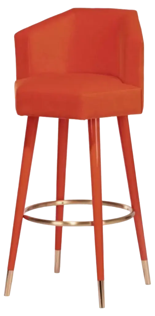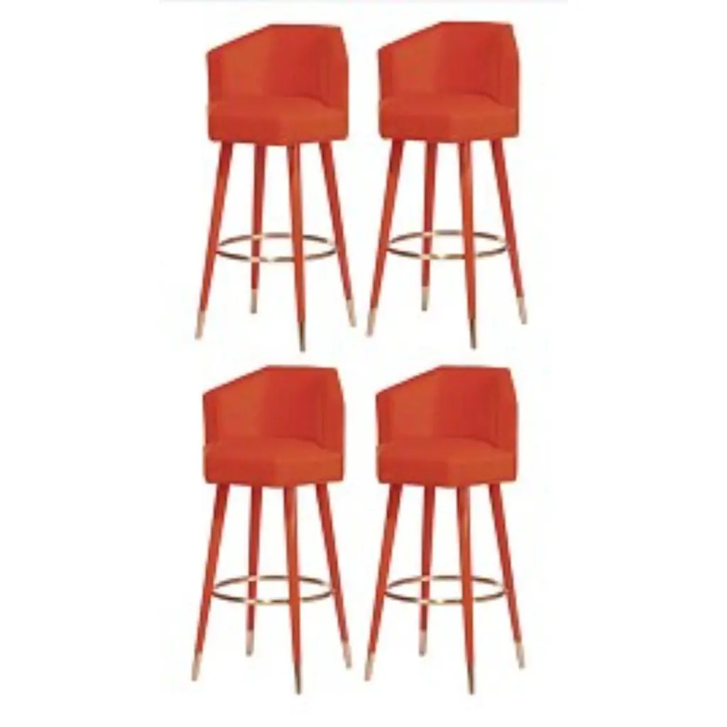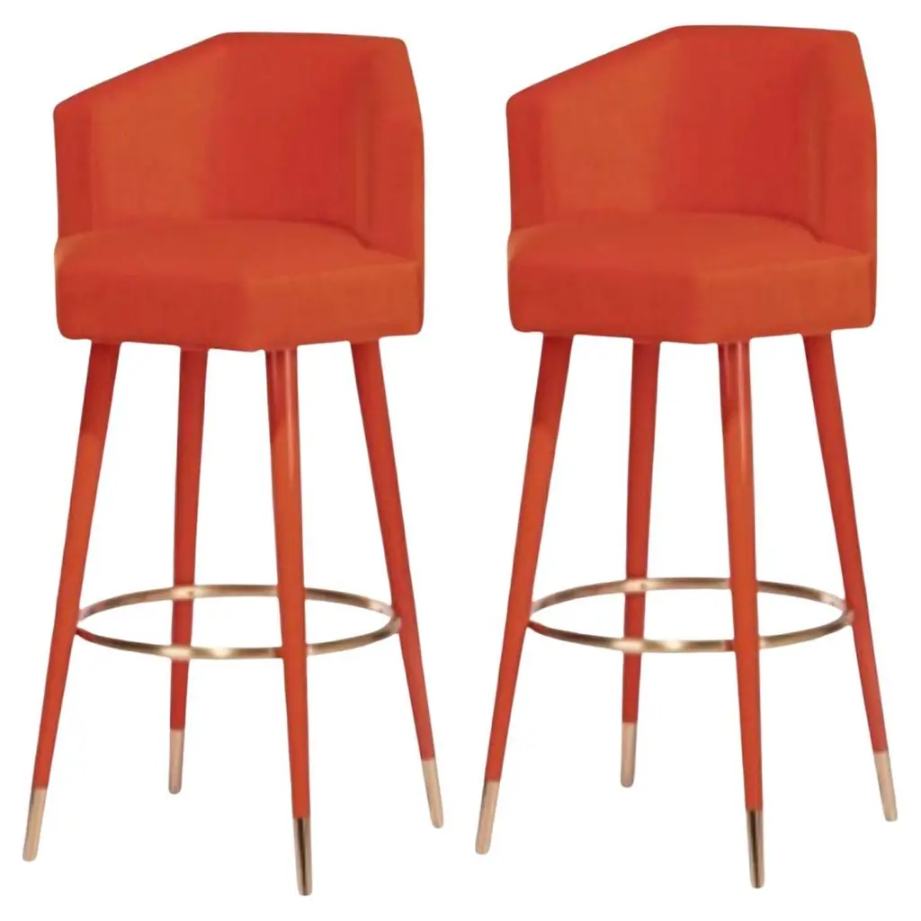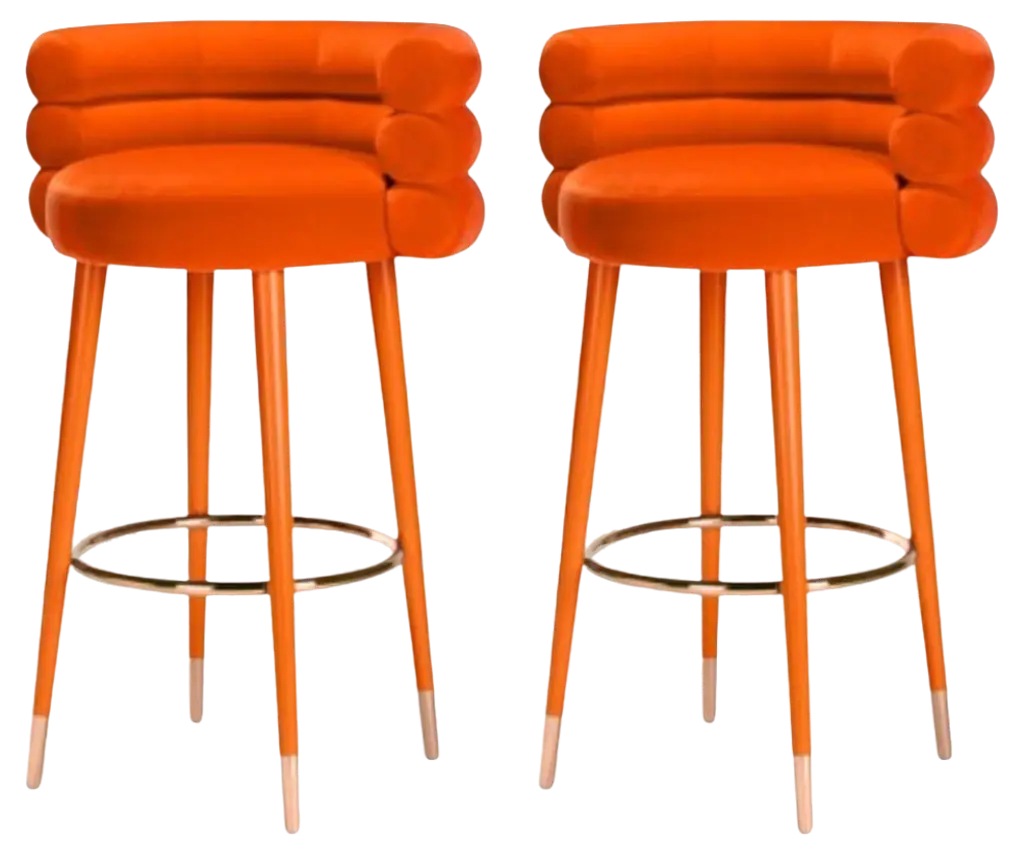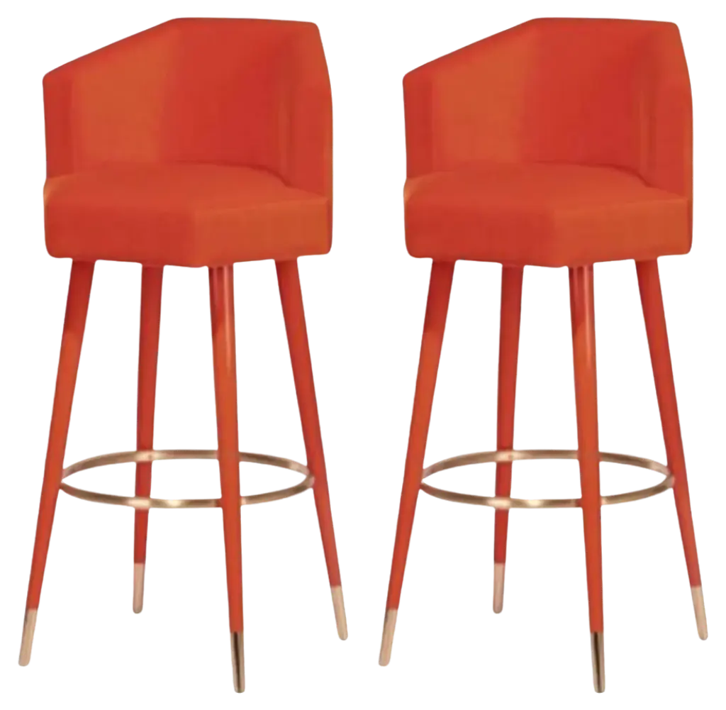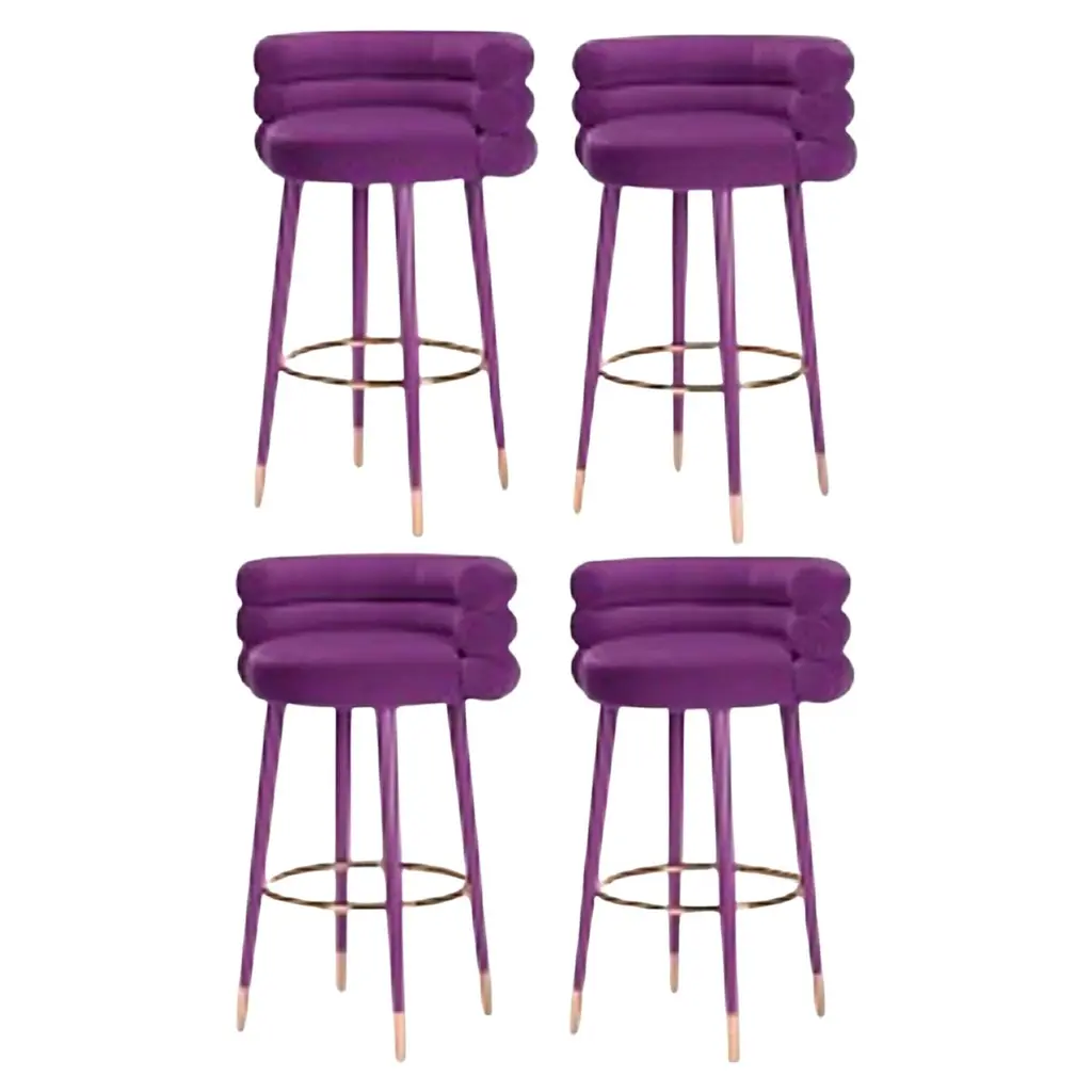 Set of 4 Beelicious bar stools, Royal StrangerDimensions: 54.5 x 46 x 107 cmMaterials: Upholstery Zinnia cotton velvet. Legs Zinnia lacquered wood with a glossy finish. Feet covers and footrest brushed brass.Royal Stranger is an exclusive furniture brand determined to bring you the best unique pieces of art and design.Fusing design, art, and the best craftsmanship, they strive to deliver the best state of handmade art furniture. The design team works every day to create meaningful products that represent values such as passion, function, aesthetics and know-how. Values that are meant to represent Royal Stranger’s DNA. This dedication is present at all stages of production and the combination of craftsmanship and innovative design contributes toour final purpose: to produce certified high-quality products, made with passion and expertise and using royal materials such as gold leaf, rich woods, and high-quality lacquers.It was in 2013, as an architects, that Sofia Santos & Rui Santos started to push the boundaries of innovation in several retail design concepts for some of the best stores in Portugal. This has always been present in their work, and that’s how the brand was born.