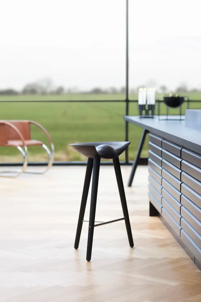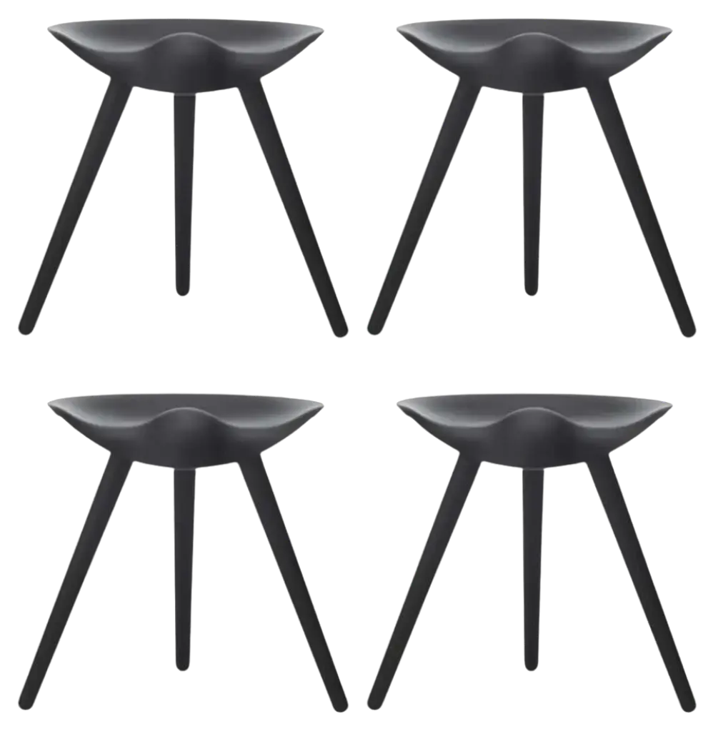 Set of 4 ML 42 black beech and stainless steel bar stools by Lassen.Dimensions: H 77 x W 36 x L 55.5 cm.Materials: Beech, stainless steel.In 1942 Mogens Lassen designed the Stool ML42 as a piece for a furniture exhibition held at the Danish Museum of Decorative Art. He took inspiration from the stools used by the shoemakers of the past, and transferred the light, elegant look to the creation of this sculptural three-legged stool. The Stool ML42 is still manufactured in Denmark to this day with a focus on quality and Danish craftsmanship, and is considered a collector’s item by international design connoisseurs.By Lassen is a Danish design brand focused on iconic designs created by Mogens and Flemming Lassen, founded by Lassens’ relatives in 2008. Brothers Mogens (1901-1987) and Flemming (1902-1984) Lassen are known as two of Denmark’s greatest architects and designers. Both were renowned pioneers of Danish functionalism and modernist architecture, honoured with numerous prestigious medals and awards. Headed by Mogens Lassen’s grandson Søren Lassen, By Lassen carries on the brothers’ design philosophy by manufacturing their iconic designs as well as products by other designers that complement the Lassen’s functionalist style. The company’s mission is to continue the tradition of timelessness, functionality and quality, and to introduce the Lassen’s design heritage to new generations.
