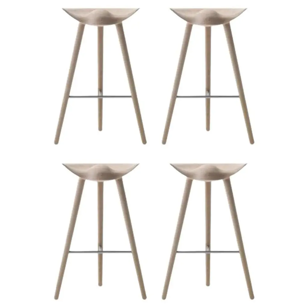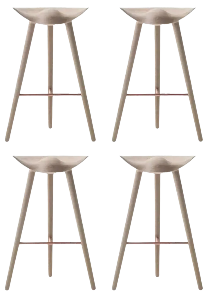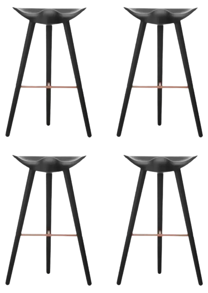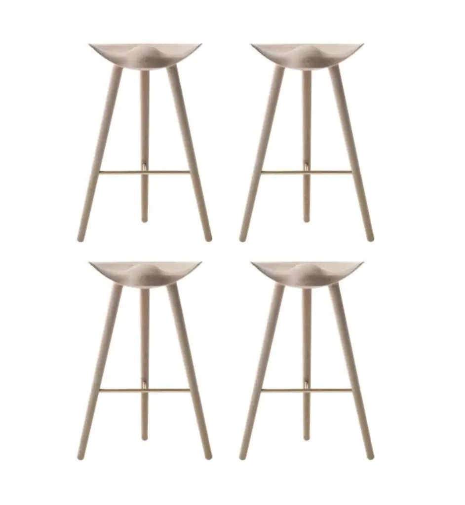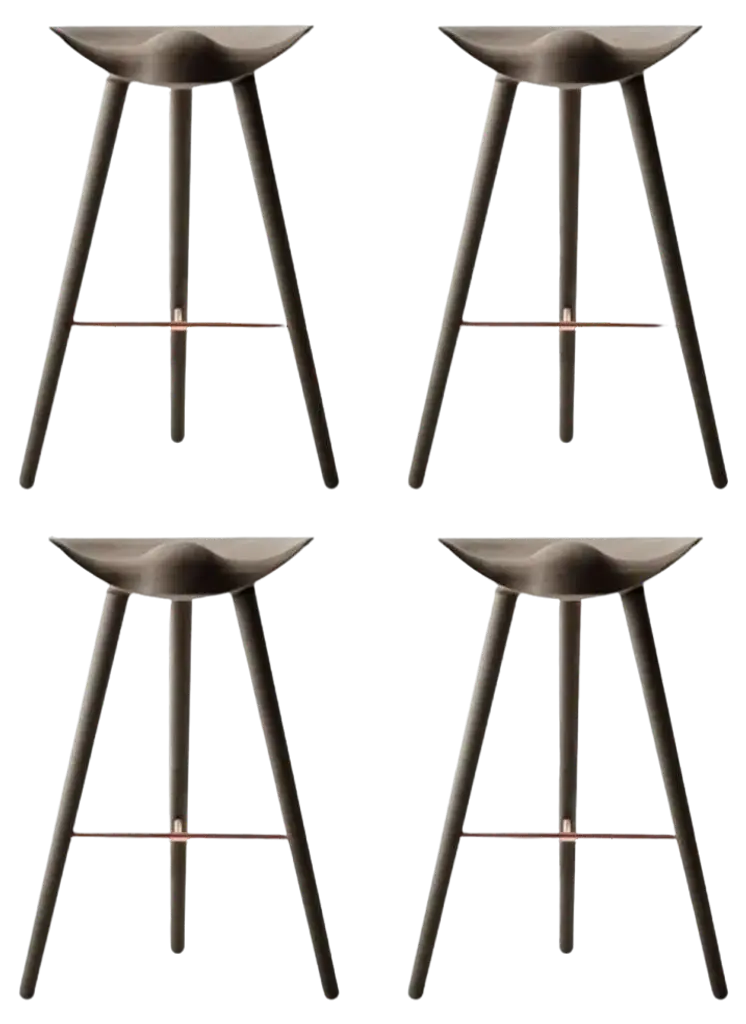 Set of 4 ML 42 oak and brass bar stools by LassenDimensions: H 77 x W 36 x L 55.5 cmMaterials: oak, brassIn 1942 Mogens Lassen designed the Stool ML42 as a piece for a furniture exhibition held at the Danish Museum of Decorative Art. He took inspiration from the stools used by the shoemakers of the past, and transferred the light, elegant look to the creation of this sculptural three-legged stool. The Stool ML42 is still manufactured in Denmark to this day with a focus on quality and Danish craftsmanship, and is considered a collector’s item by international design connoisseurs.By Lassen is a Danish design brand focused on iconic designs created by Mogens and Flemming Lassen, founded by Lassens’ relatives in 2008. Brothers Mogens (1901-1987) and Flemming (1902-1984) Lassen are known as two of Denmark’s greatest architects and designers. Both were renowned pioneers of Danish functionalism and modernist architecture, honoured with numerous prestigious medals and awards. Headed by Mogens Lassen’s grandson Søren Lassen, By Lassen carries on the brothers’ design philosophy by manufacturing their iconic designs as well as products by other designers that complement the Lassen’s functionalist style. The company’s mission is to continue the tradition of timelessness, functionality and quality, and to introduce the Lassen’s design heritage to new generations.