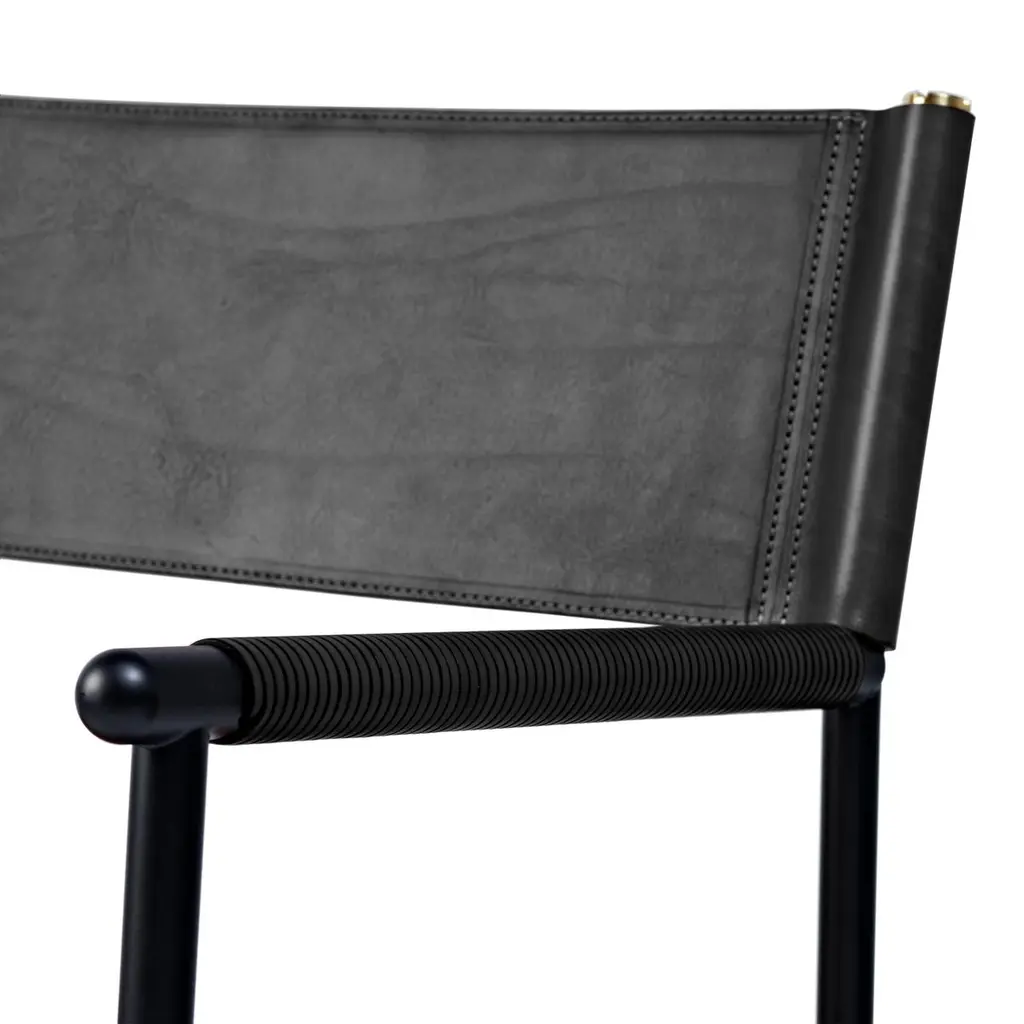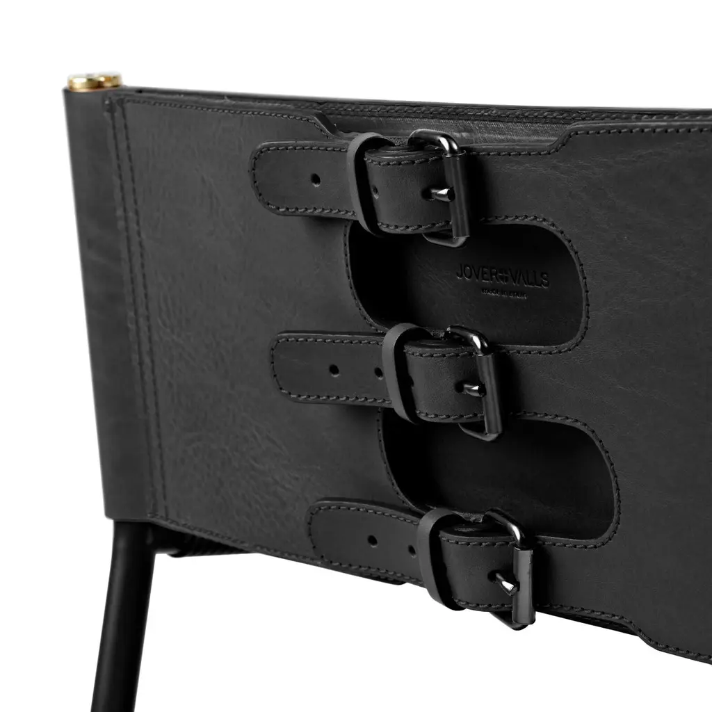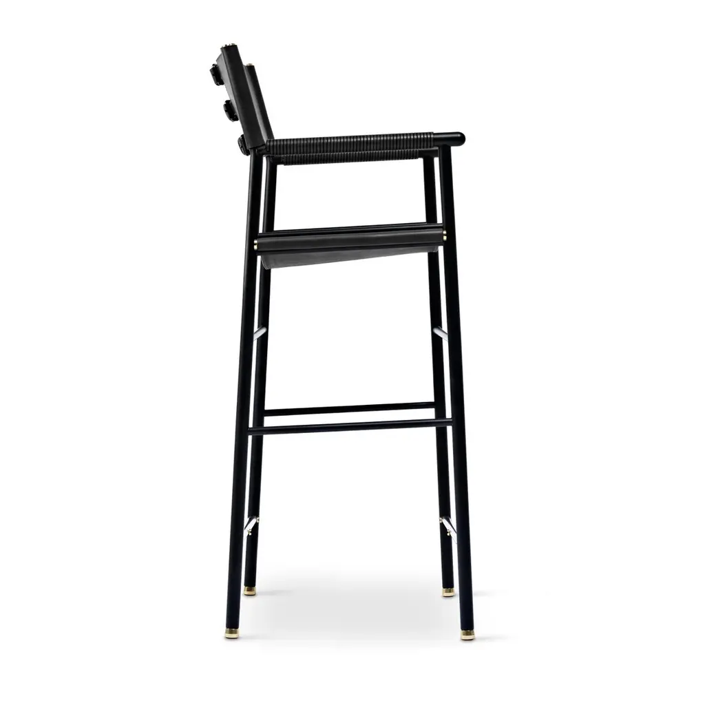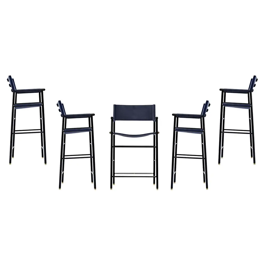 The “Repose” contemporary barstool belongs to a collection that revisit the director chair collection, serene pieces where exclusivity and precision are shown in small details such as the hand-turned metal nuts and bolts that fix the leather surfaces, that go unnoticed at first sight.The robustness of the steel structure is combined with the delicacy of the rounded structure. The matte metal finishes evoke the passage of time and are complemented by vegetable tanned cowhide leathers that age gracefully with its use.The “Repose” armchair is designed and conceived as a tribute to director’s chair or luxury safari foldable furniture. All pieces are done with cold steel rods, machined on a turning lathe, black powder coated and lacquered with a matt rubber effect. Our signature screws are made with brass turning lathed, polished, and lacquered, these are the pieces that fix the saddle leather to the metal frame.Leathers are Spanish hides vegetable tanned. We use premium saddles in five colors to adjust to your taste and interior needs. This traditional vegetable dyeing and tanning method is an organic technique that relies on natural tannings from bark or plant tissues. The use of oils and natural fats give the leather a distinctive flexibility and texture, allowing it to be molded, retain its shape and age graciously.All skins are carefully selected from food industry sub-products, with a minimum thickness of 3.5 mm / 0,02 in, using the part of the animal's shoulder, which allows for larger pieces and uniformity, even though signature wrinkle from the animal’s neck may be recognizable. The vegetable tanning is a traditional and artisan treatment, which is respectful to the environment. Even with careful selection natural marks as a result of the contact with other animals, the age, origin and characteristics of the skin, or even the season in which the tanning takes place cannot be avoided. We still believe that these factors only add authenticity and uniqueness to every piece. Our leather parts are made with double saddles, always showing the top side of the hides that presents the better quality.Customization options.With the aim of creating customized pieces, clients can select from the various leather colors to create pieces that complement their home décor. Leather colors available, black, navy, dark brown, cognac and natural tobacco, and steel color is black.Normally we use off white threats for stitches, but client can select another option, being possible to select any color to make a unique piece for the project it belongs. The finish on the edges of our leather components is sanded and hand painted. We have the option to select an alternative color if not tone on tone will be applied.Please consult in case you are interested on having a particular heat embossing stamp on the leather.Our high-end collections are made to full fill home spaces where to gather and enjoy great conversation with families and friends. Occasional one-of-a-kind furniture for exquisite homes, from cottages to exclusive resorts. Our product is understood as a sculptural piece of design, as an art object to be displayed at different house spaces as library, bar, living, foyer, bedroom, powder, meeting, grand or great room.The different finishes options make the furniture perfect combinations on diverse styles, from rustic mountain home, a small cottage, a ski lodge retreat, or industrial a minimalist look.