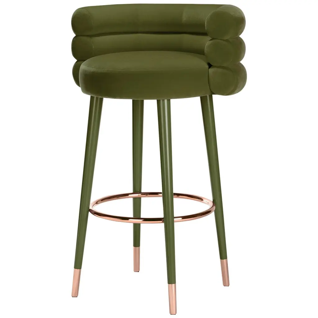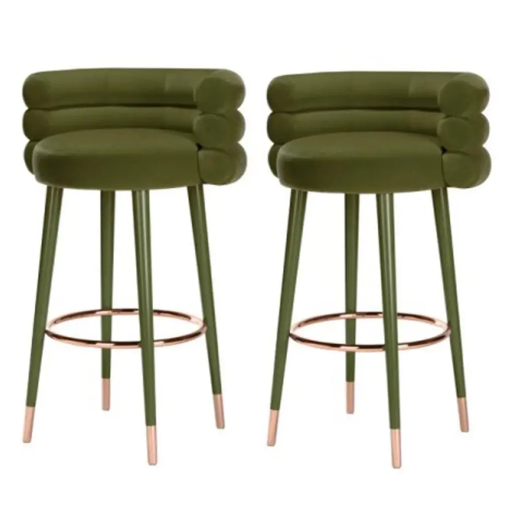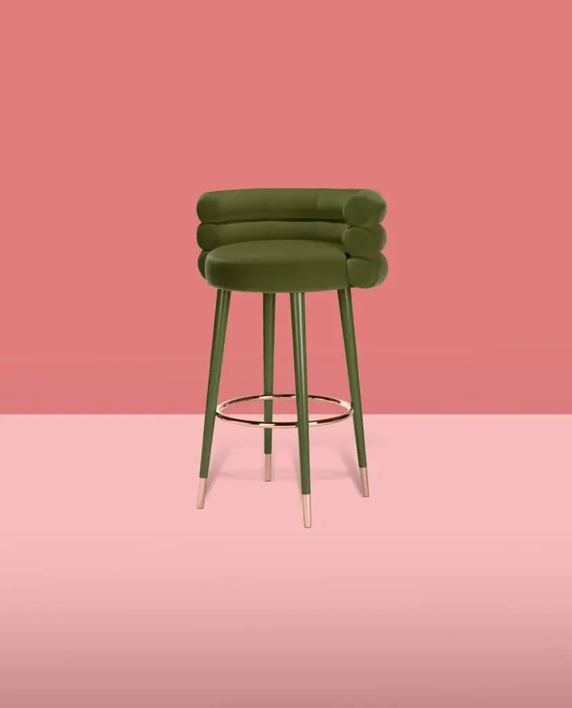 Set of 2 marshmallow bar stools, Royal Stranger. Dimensions: 100 x 70 x 60 cm Materials: Velvet upholstery, brass Available in: Mint green, light pink, royal green, royal red. Royal stranger is an exclusive furniture brand determined to bring you the best unique pieces of art and design. Fusing design, art and the best craftsmanship, they strive to deliver the best state of the handmade art furniture. The design team works every day to create meaningful products that represent values such as passion, function, aesthetics and know-how. Values that are meant to represent Royal stranger’s DNA. This dedication is present at all stages of production and the combination of craftsmanship and innovative design contributes to our final purpose: to produce certified high-quality products, made with passion and expertise and using royal materials such as gold leaf, rich woods and high quality lacquers. It was in 2013, as an architects, that Sofia Santos & Rui Santos started to push the boundaries of innovation in several retail design concepts for some of the best stores in Portugal. This will has always been present in their work, and that’s how the brand was born. This piece is attributed to the mentioned designer/maker. It has no attribution mark and no official proof of authenticity, however it is well documented in design history. I take full responsibility for any authenticity issues arising from misattribution