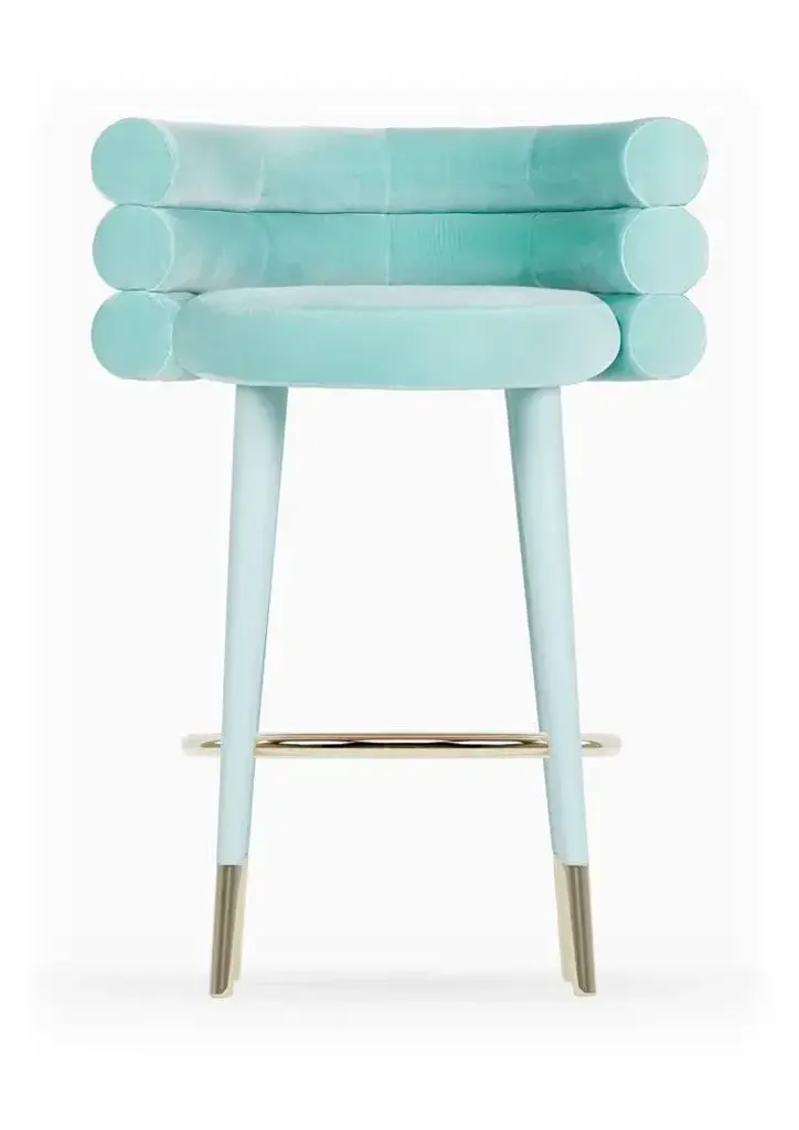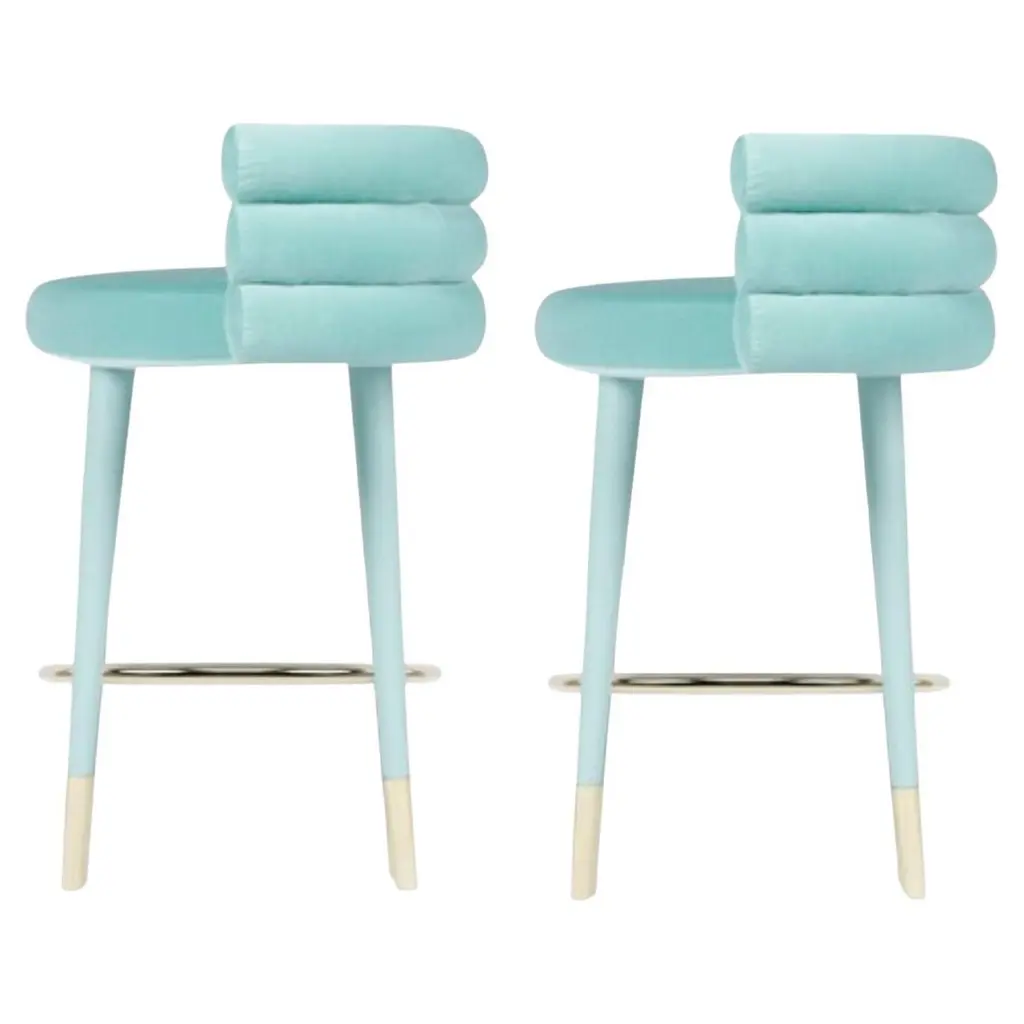 Set of 2 marshmallow bar stools, Royal Stranger Dimensions: 100 x 70 x 60 cm. Materials: Velvet upholstery, brass. Available in: Mint green, light pink, Royal green, Royal red. Royal stranger is an exclusive furniture brand determined to bring you the best unique pieces of art and design. Fusing design, art and the best craftsmanship, they strive to deliver the best state of the handmade art furniture. The design team works every day to create meaningful products that represent values such as passion, function, aesthetics and know-how. Values that are meant to represent Royal stranger’s DNA. This dedication is present at all stages of production and the combination of craftsmanship and innovative design contributes to our final purpose: to produce certified high-quality products, made with passion and expertise and using royal materials such as gold leaf, rich woods and high quality lacquers. It was in 2013, as an architects, that Sofia Santos & Rui Santos started to push the boundaries of innovation in several retail design concepts for some of the best stores in Portugal. This will has always been present in their work, and that’s how the brand was born. This piece is attributed to the mentioned designer/maker. It has no attribution mark and no official proof of authenticity, however it is well documented in design history. I take full responsibility for any authenticity issues arising from misattribution