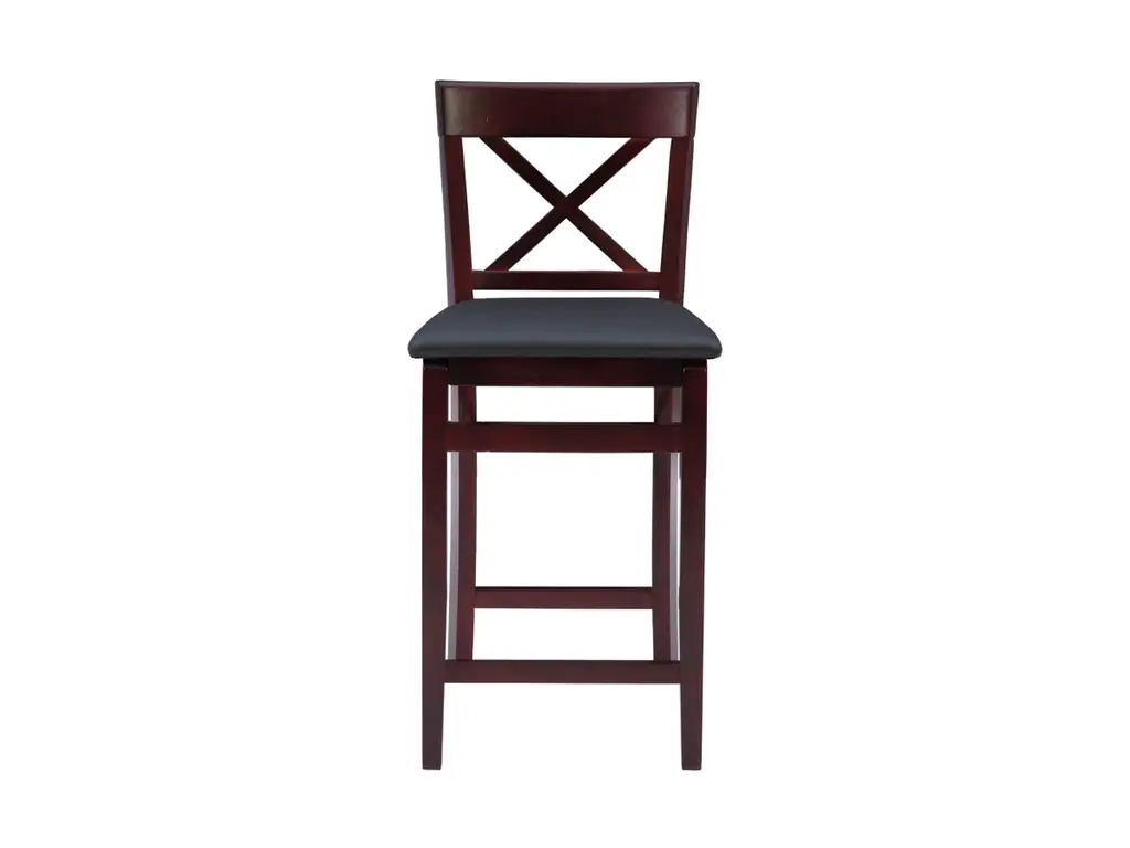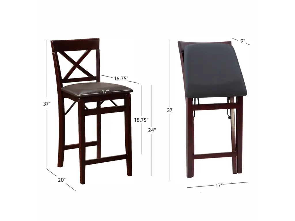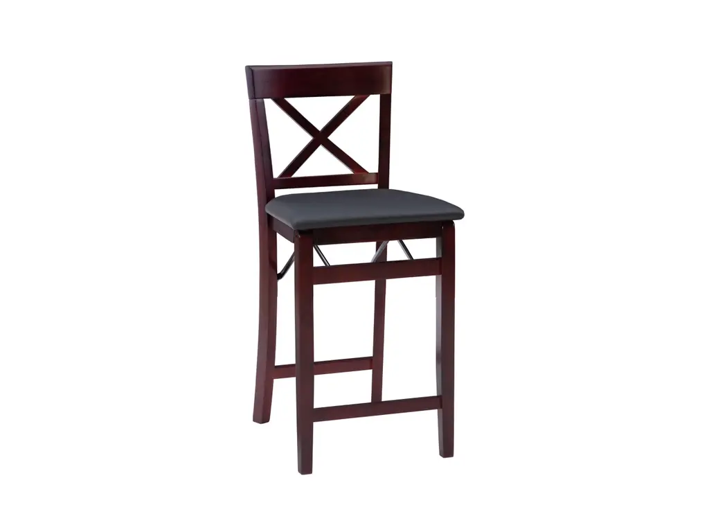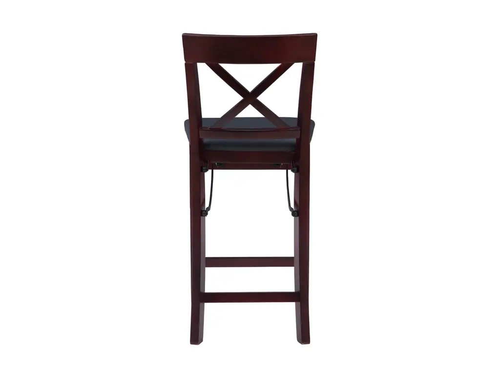 The elegance and unique style of this Shae X back folding counter stool will carry throughout your kitchen, dining, or home pub area. Finished in a rich merlot, the seat is upholstered in a wipe clean brown faux leather. The folding feature makes it simple to easily store the stool when space is needed. Front and rear supports provide stability. 24" seat height. 275 pound weight limit.