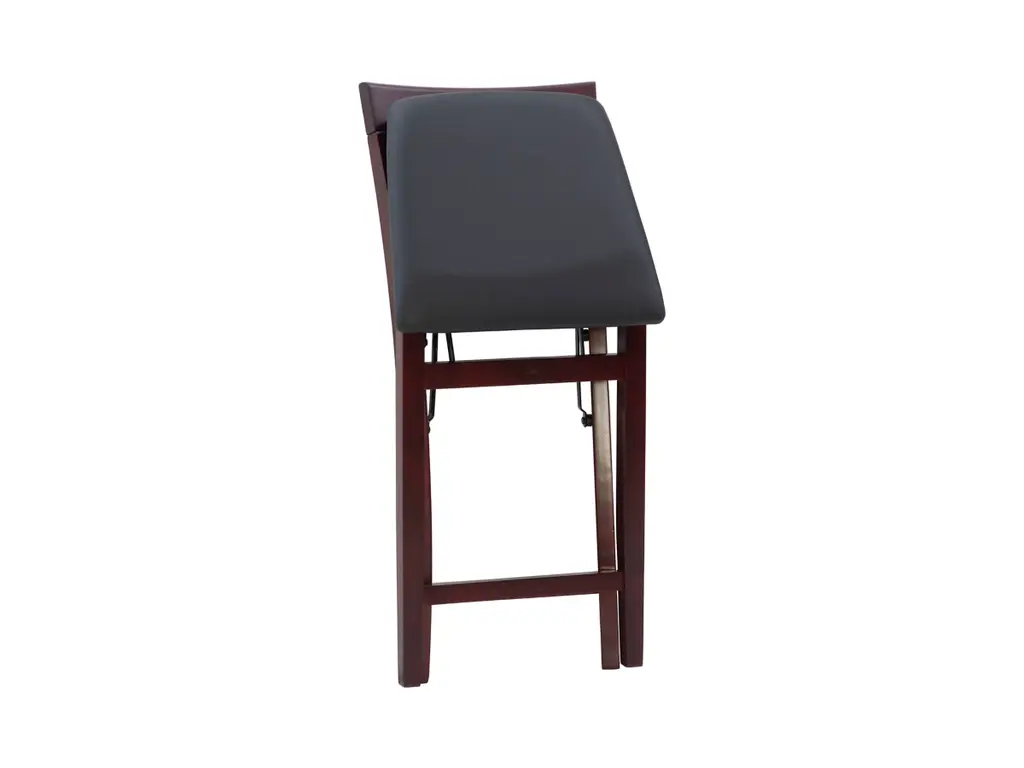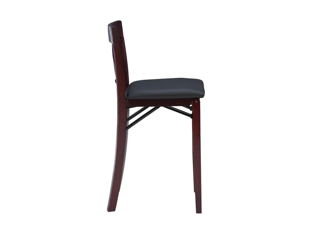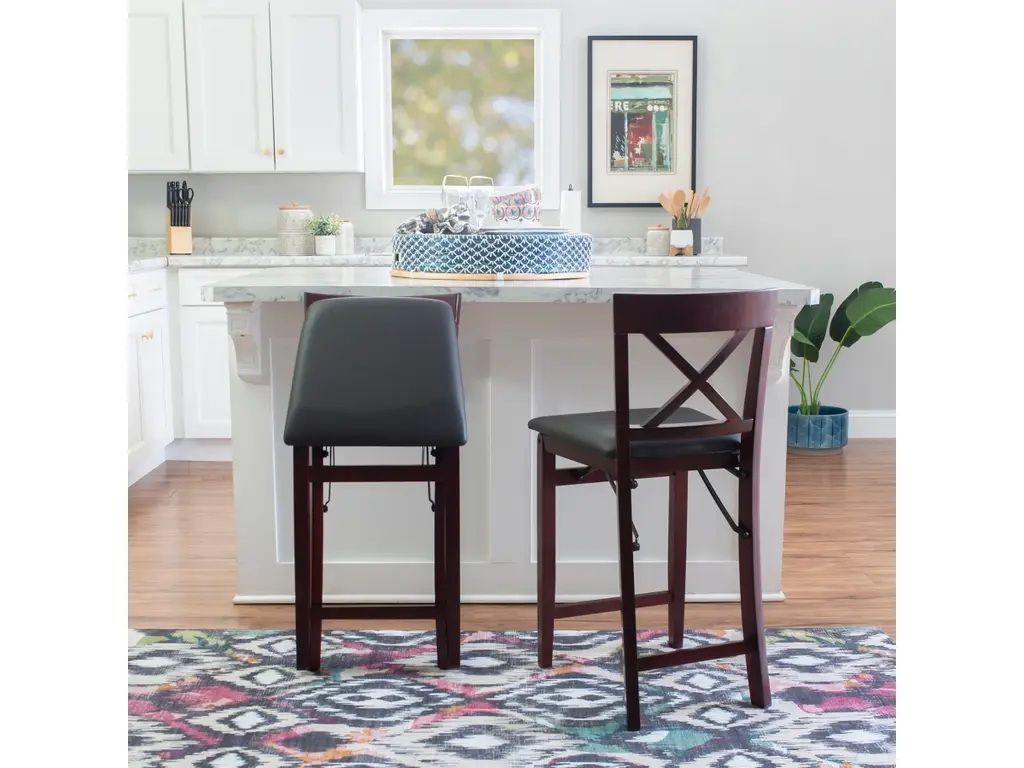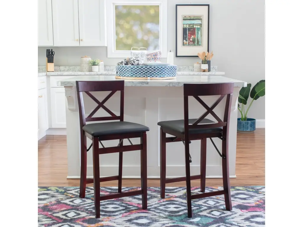 The elegance and unique style of this Shae X back folding counter stool will carry throughout your kitchen, dining, or home pub area. Finished in a rich merlot, the seat is upholstered in a wipe clean brown faux leather. The folding feature makes it simple to easily store the stool when space is needed. Front and rear supports provide stability. 24" seat height. 275 pound weight limit.