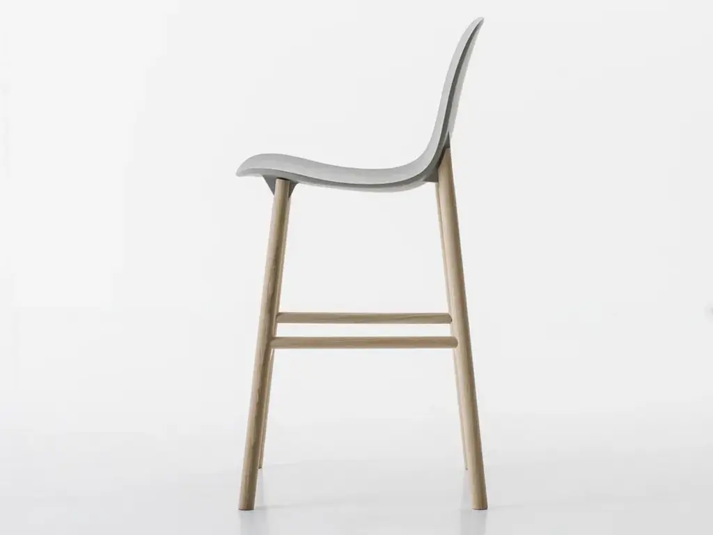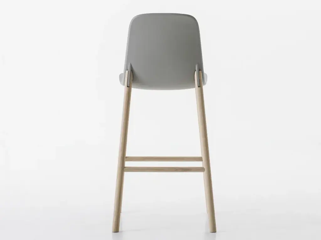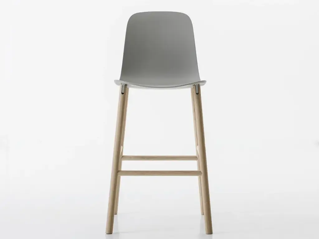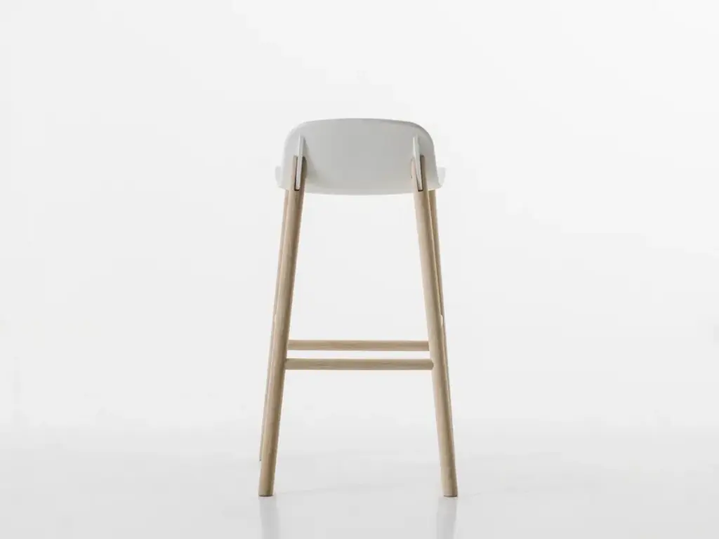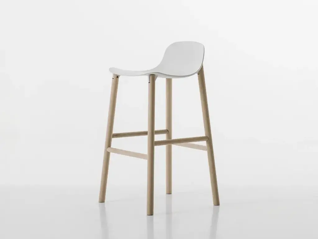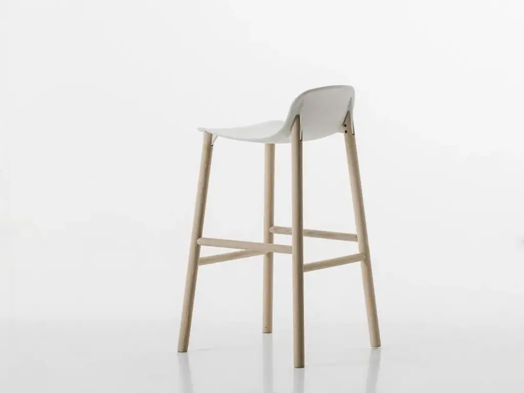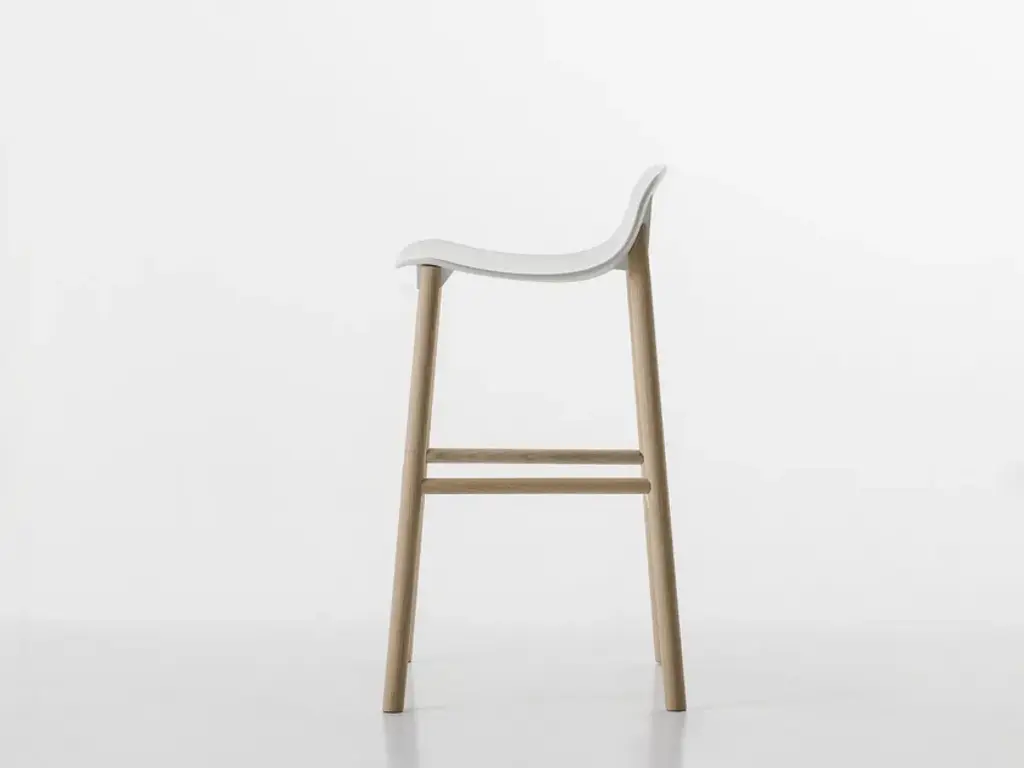 Stools available in two heights with seats in different shapes with wood legs.Two sinuous stools with narrow lines and an overall effect that is extremely resistant. The high stool entirely replicates the seat of the chair and becomes a comfortable bar stool, whereas the low stool has been shortened for a more harmonious overall effect. The two fin-shaped coupling elements clearly remain on the rear part, as a linking element between the frame and the base; a technical detail that is the key characteristic of the project. These two versatile seats are ideal for use in the home or as a distinguishing feature of a project at a restaurant, bar or hotel.The Sharky stool can be fitted with light padding and upholstered in high-quality Kvadrat® fabric in different colours that create many combinations.The philosophy of Eva Paster and Michael Geldmacher is based on observing nature and on a profound knowledge of contemporary lifestyles. To create the coupling elements between the structure and base of the Sharky chair, which won the Interior Innovation Award in 2015, the designers were inspired by the lightness and strength of shark fins. The result is a slimline, sinuous yet very hardwearing seat.The Sharky chair, stool with a high backrest and stool with a low backrest are available with wood legs or with painted aluminium legs with visible welded details. The polyurethane structure is made even more comfortable with a padded seat or cushions, available in a wide variety of colours. The option of adding a Lips cushion, designed for outdoor use, adds a touch of customization and extra comfort to these chairs.