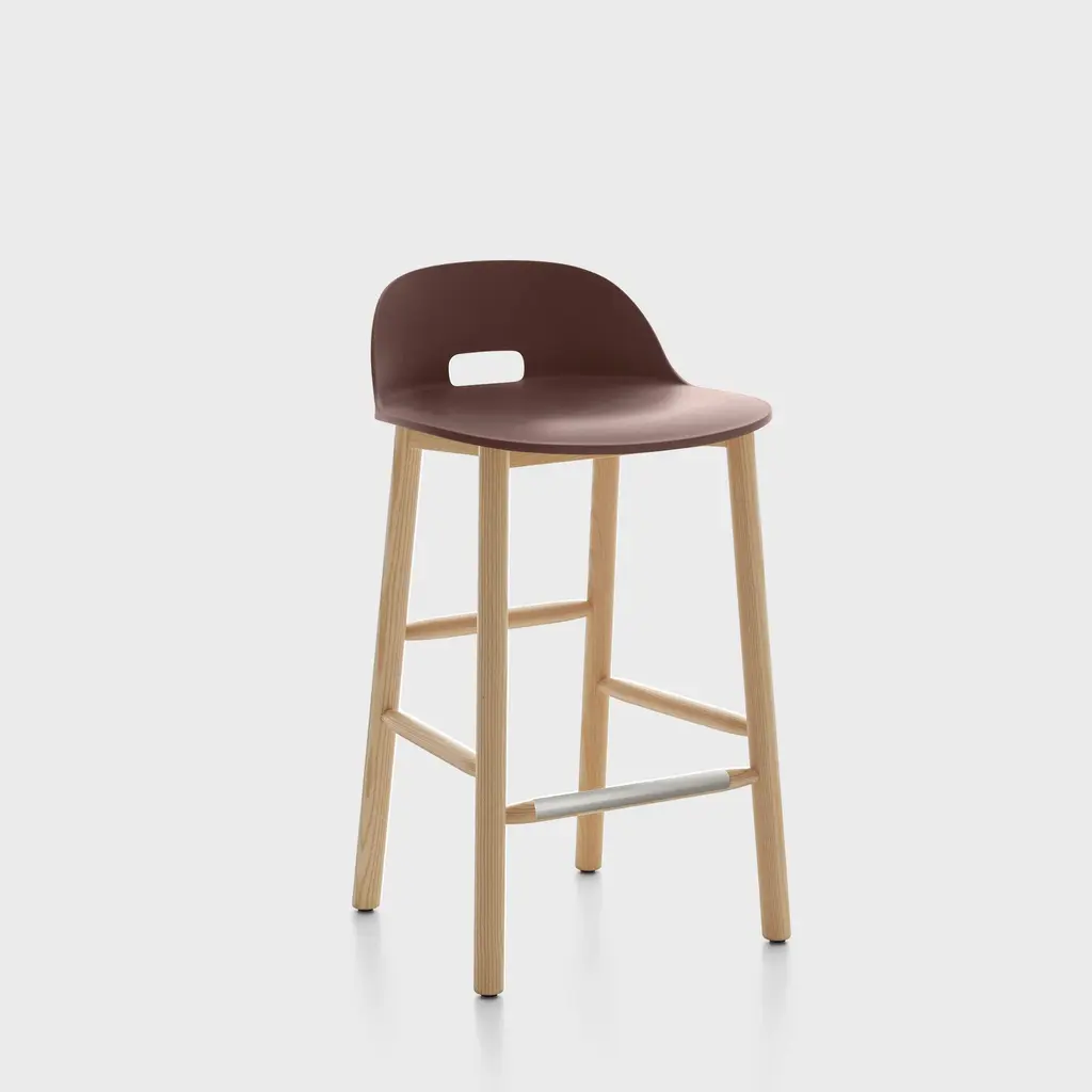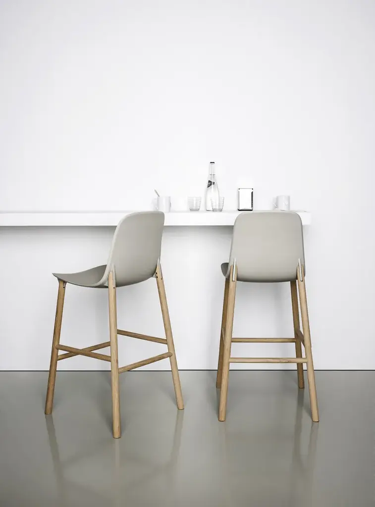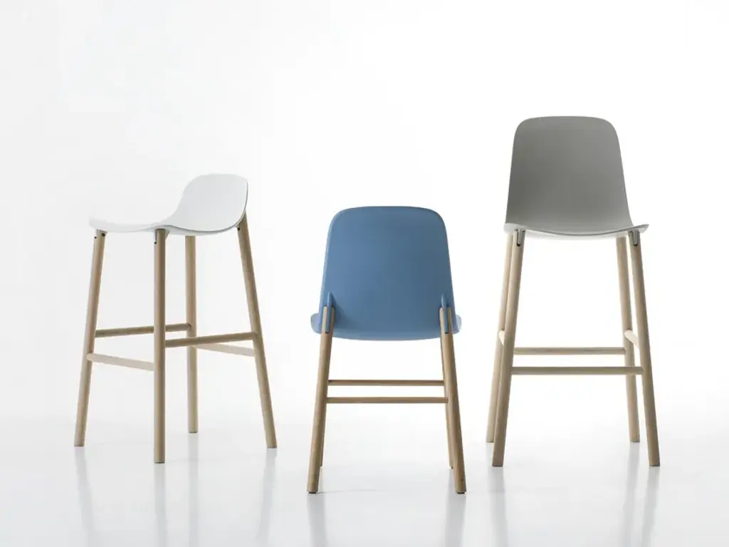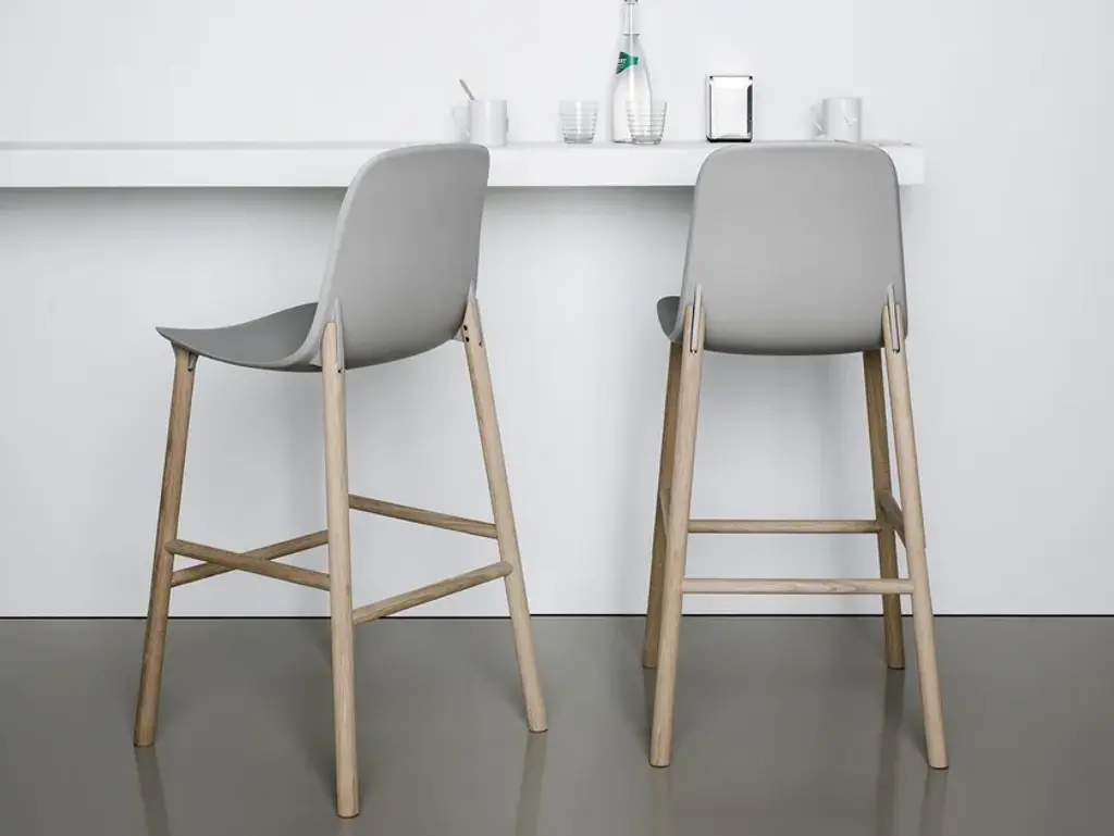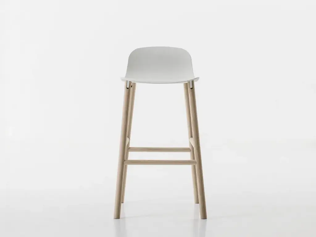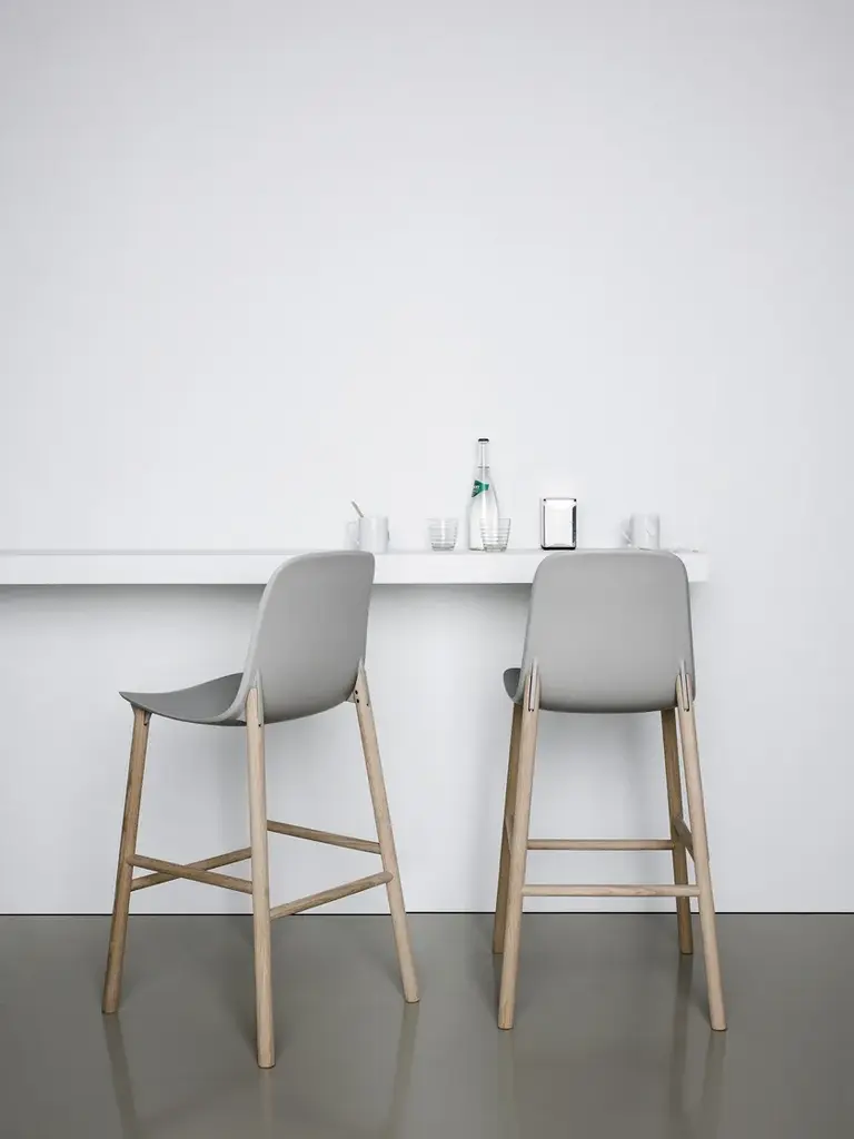 Stools available in two heights with seats in different shapes with wood legs.Two sinuous stools with narrow lines and an overall effect that is extremely resistant. The high stool entirely replicates the seat of the chair and becomes a comfortable bar stool, whereas the low stool has been shortened for a more harmonious overall effect. The two fin-shaped coupling elements clearly remain on the rear part, as a linking element between the frame and the base; a technical detail that is the key characteristic of the project. These two versatile seats are ideal for use in the home or as a distinguishing feature of a project at a restaurant, bar or hotel.The Sharky stool can be fitted with light padding and upholstered in high-quality Kvadrat® fabric in different colours that create many combinations.The philosophy of Eva Paster and Michael Geldmacher is based on observing nature and on a profound knowledge of contemporary lifestyles. To create the coupling elements between the structure and base of the Sharky chair, which won the Interior Innovation Award in 2015, the designers were inspired by the lightness and strength of shark fins. The result is a slimline, sinuous yet very hardwearing seat.The Sharky chair, stool with a high backrest and stool with a low backrest are available with wood legs or with painted aluminium legs with visible welded details. The polyurethane structure is made even more comfortable with a padded seat or cushions, available in a wide variety of colours. The option of adding a Lips cushion, designed for outdoor use, adds a touch of customization and extra comfort to these chairs.