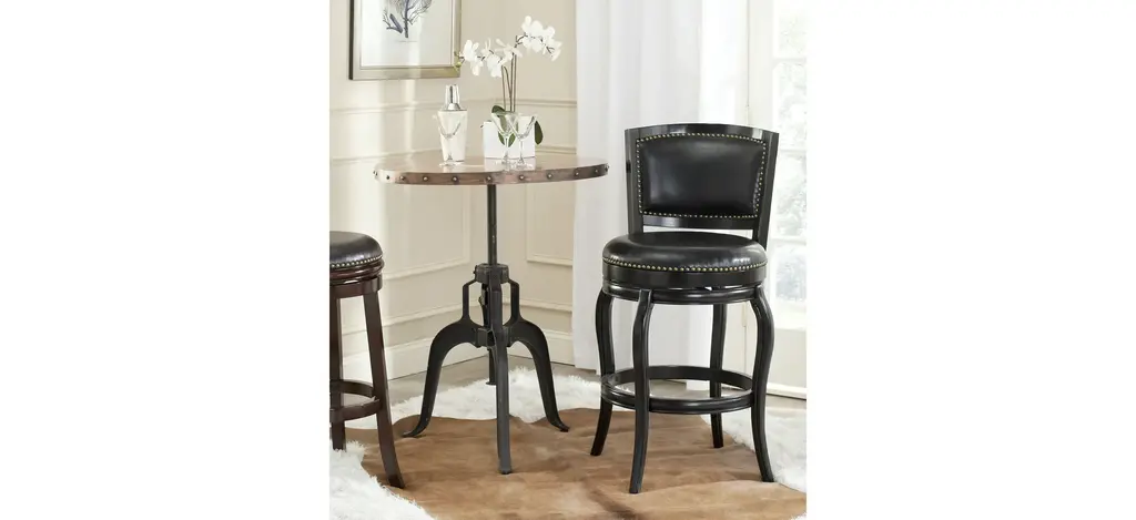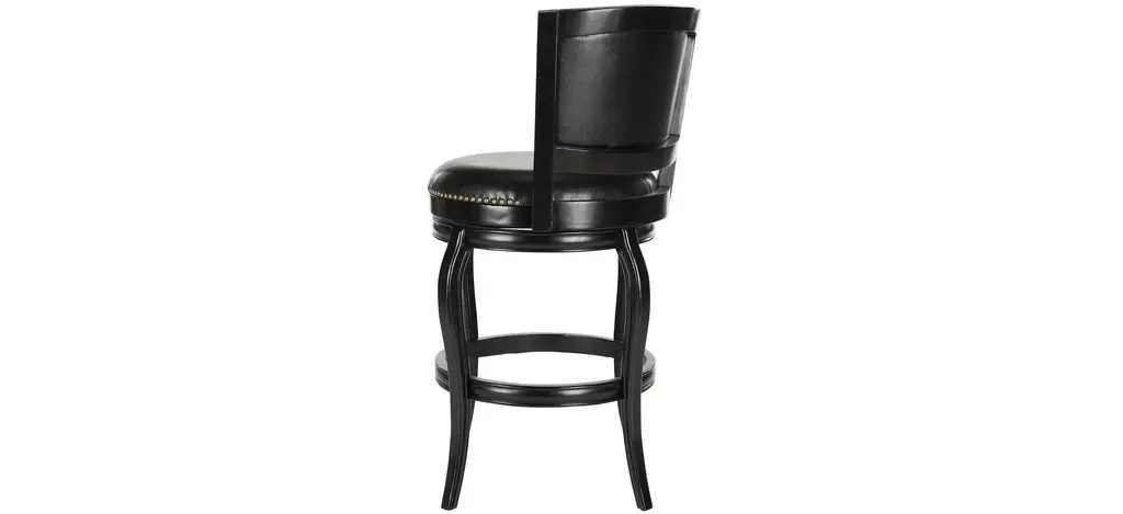 This Sharon Bar Stool conjures visions of exclusive Italian eateries where the service is impeccable and the wine is always delicious. Upholstered in black faux leather with bronze nailhead trim, its matching black finish perfectly showcases its traditionally luxe outline.
