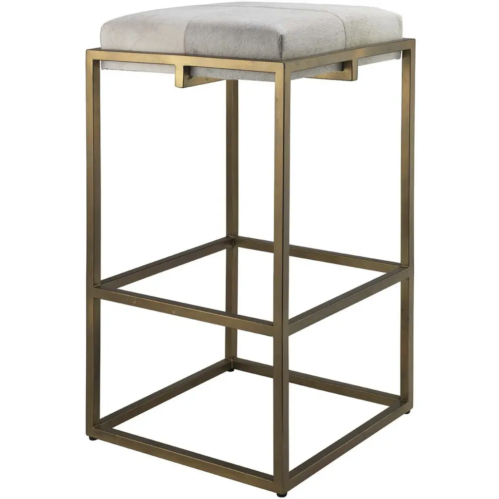 An architectural metal framework makes a clean, yet modern statement. The Shelby Bar Stool is an Art Deco inspired seat with geometric bars and a white hide cushion. The antiqued brass has a polished finish to give it a subtle luster.