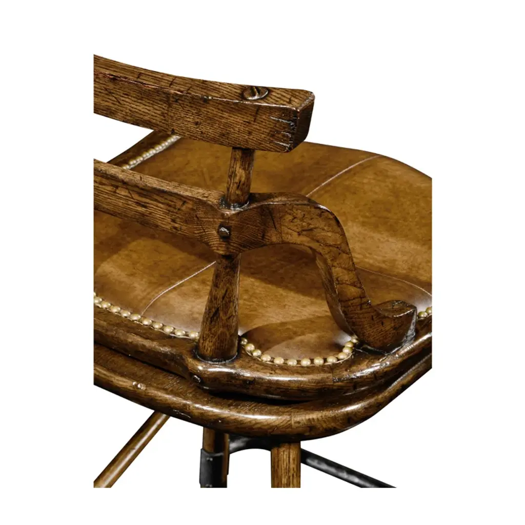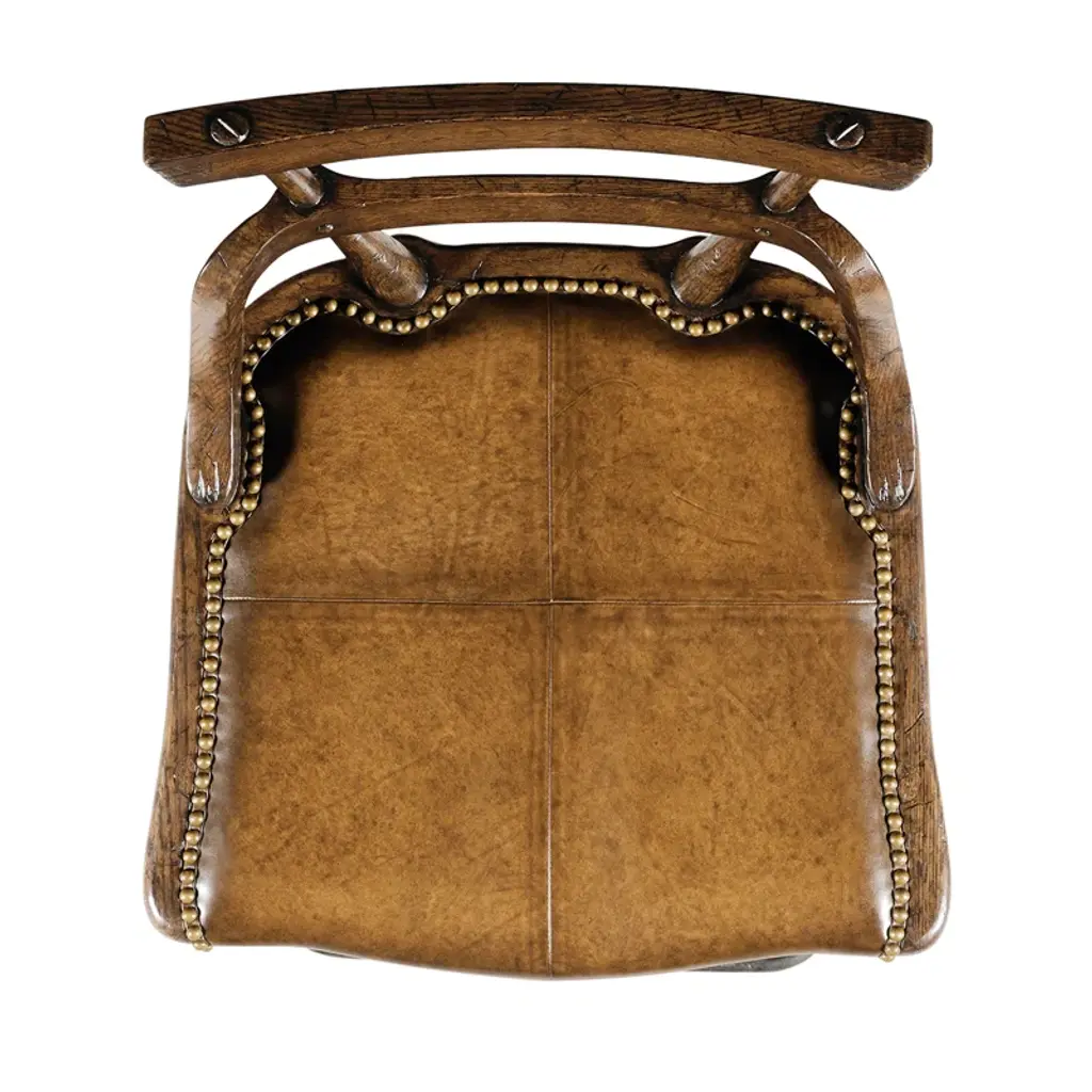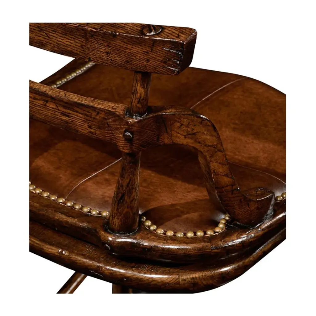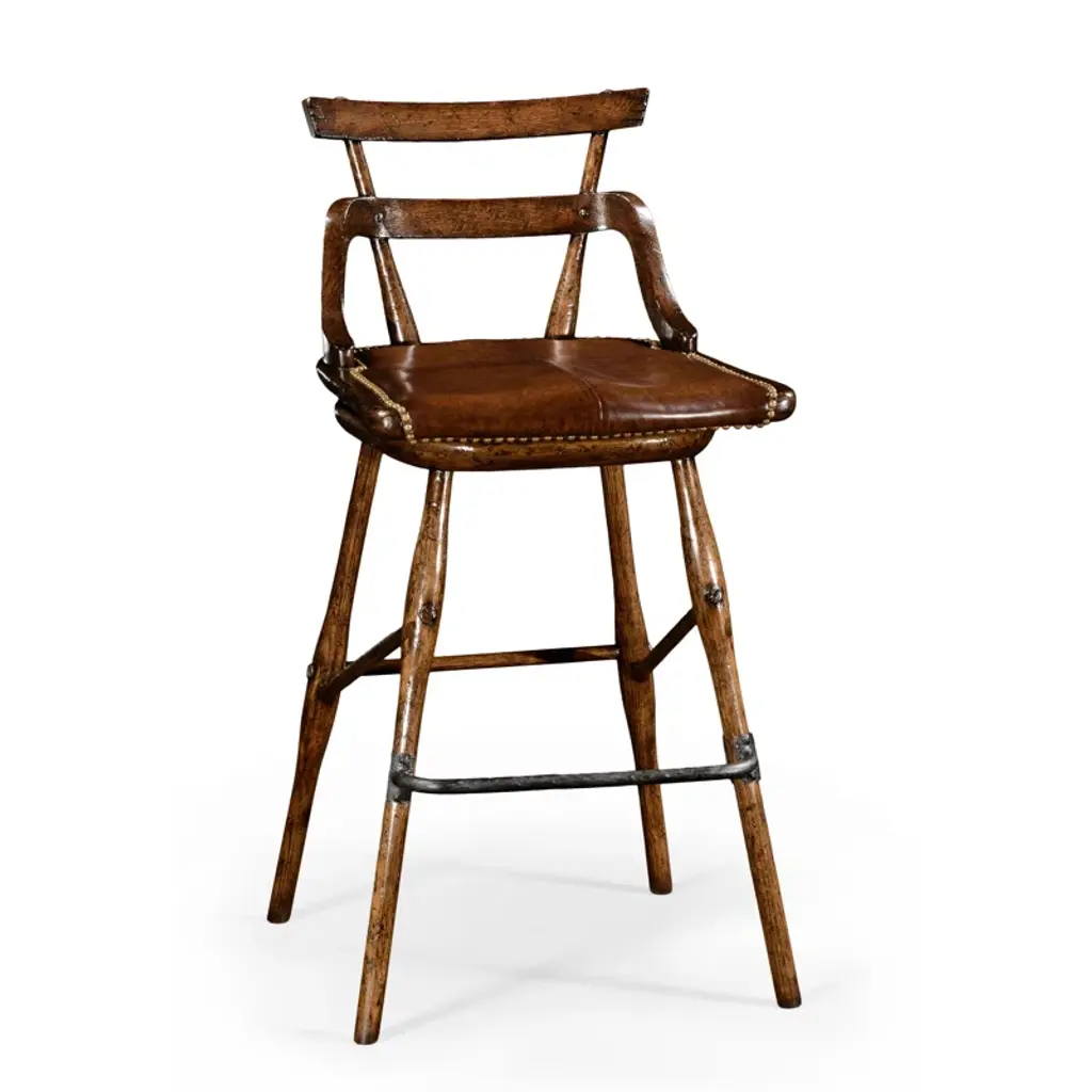Unusually shaped distressed natural oak country-style barstool. Studded brown leather seat above swollen legs and stretchers.