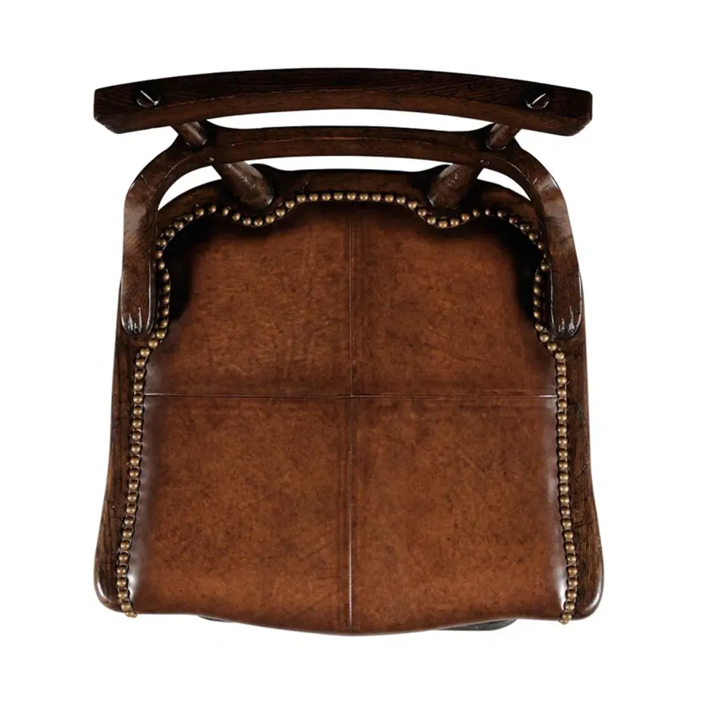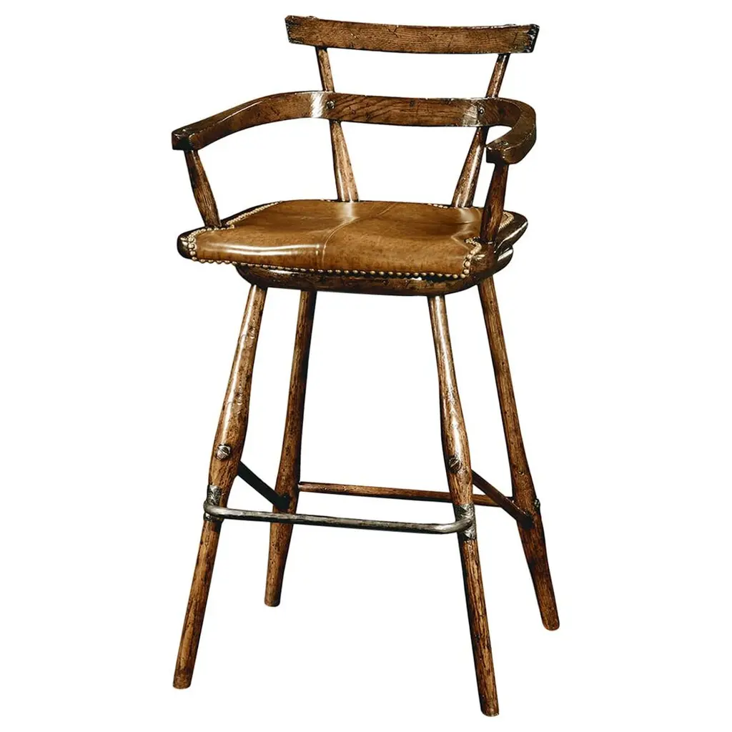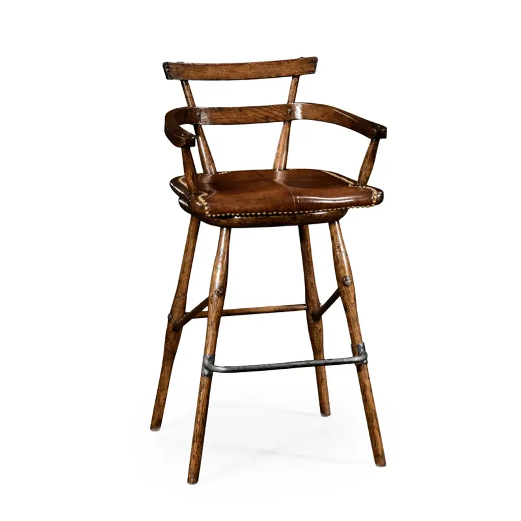 Unusually shaped distressed natural oak country-style barstool. Studded brown leather seat above swollen legs and stretchers.