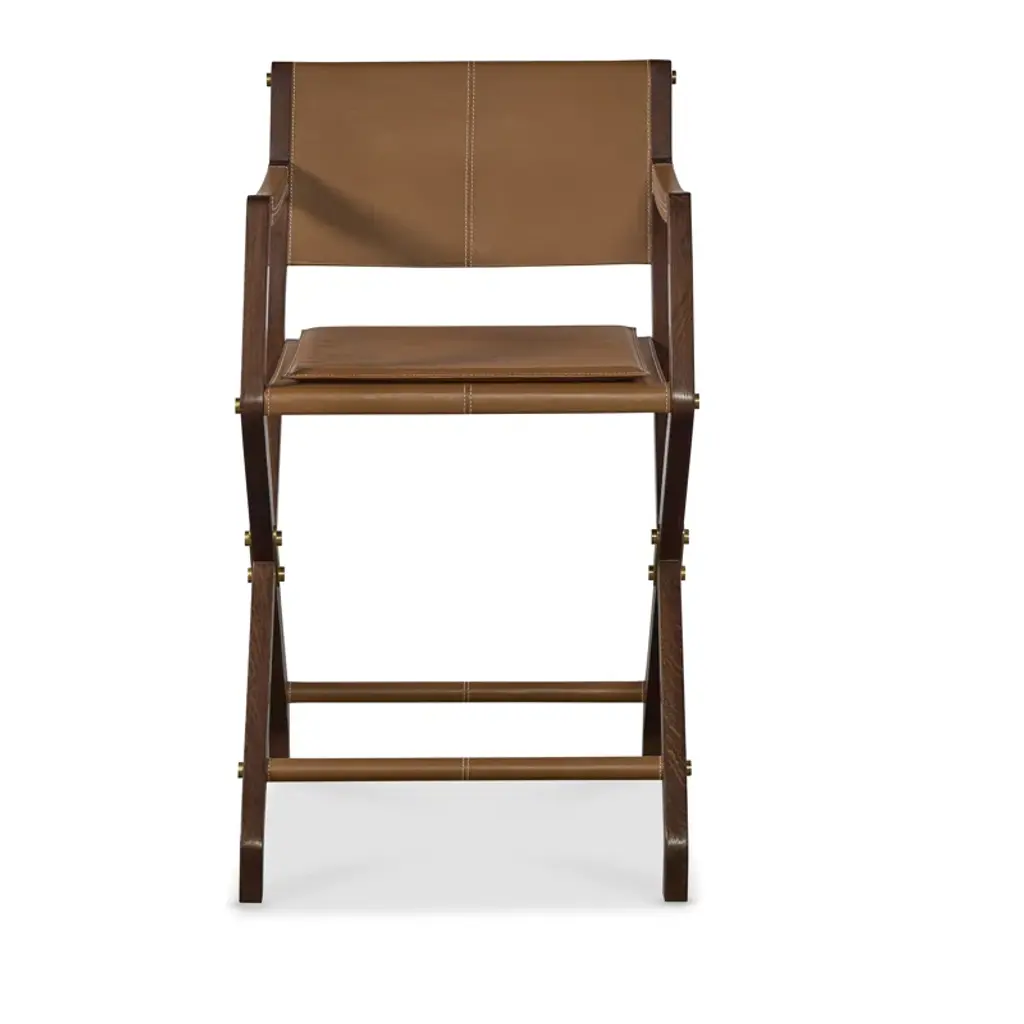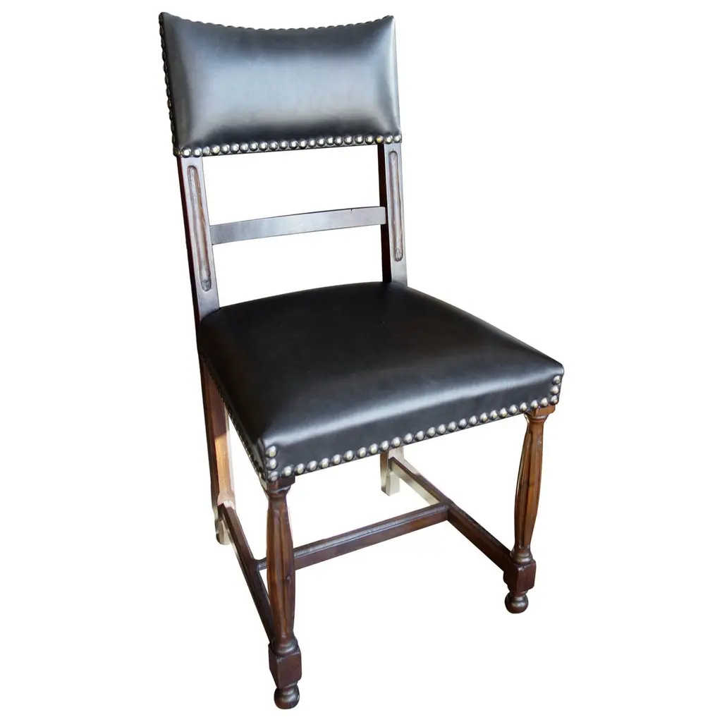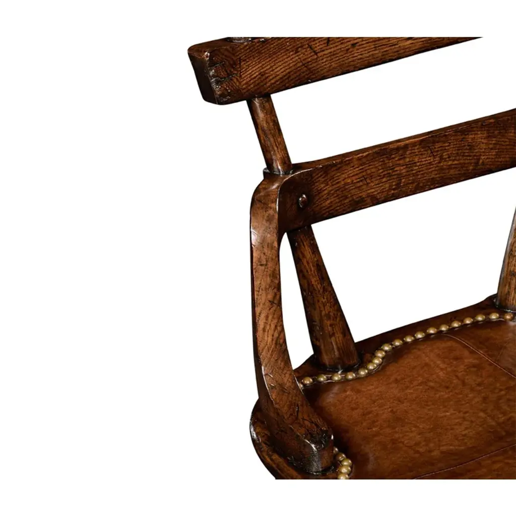 Unusually shaped distressed natural oak country-style barstool. Studded brown leather seat above swollen legs and stretchers.