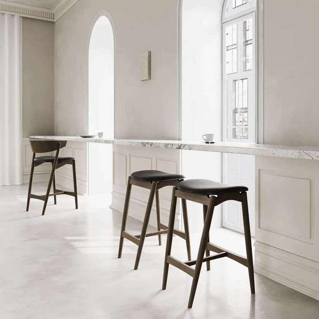 The new and refined barstool takes its origin from the timeless Sibast No 7 dining chair designed in 1953 by Helge Sibast and pays homage to the lines and the spirit of the Danish Modern movement from a contemporary perspective. Using the unique details from the Sibast No 7, such as the tapered back legs and the curved details, the dining chair has been transformed into the bold and generous Sibast No 7 bar stool. The upholstered seat together with the curved design makes the bar stool exceptionally comfortable. It comes in two heights and fits perfectly into private residences, kitchens as well as restaurants, bars and hotels.