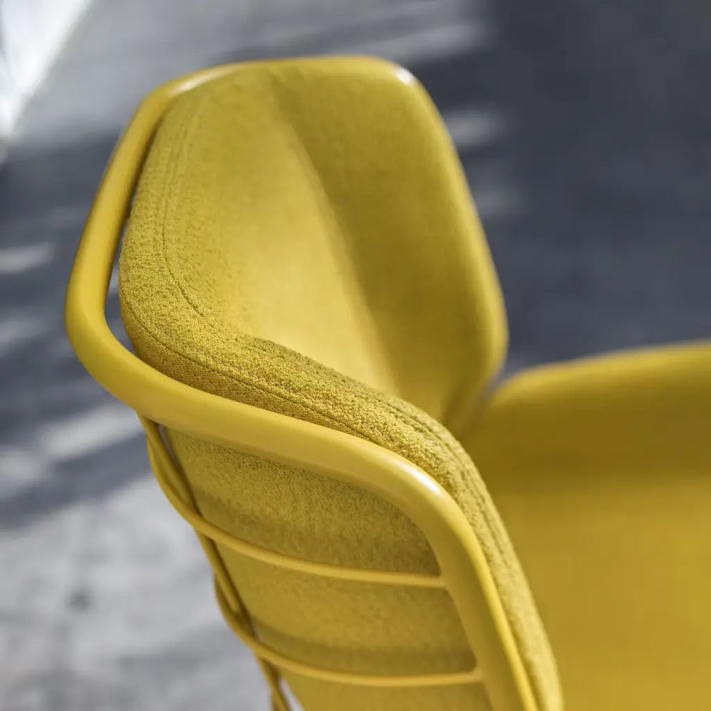 This superb and lively stool boasts a striking and modern silhouette comprising tall and slanted legs connected by four horizontal bars placed in pairs at different height levels, creating an eye-catching effect. The frame is made of tubular metal with a yellow-lacquered finish, and features a crisscrossed pattern on the back, solidly holding the comfortable yellow fabric cushion padded with foam rubber. This piece is available in other finishes and hues, please ask the Concierge for options.