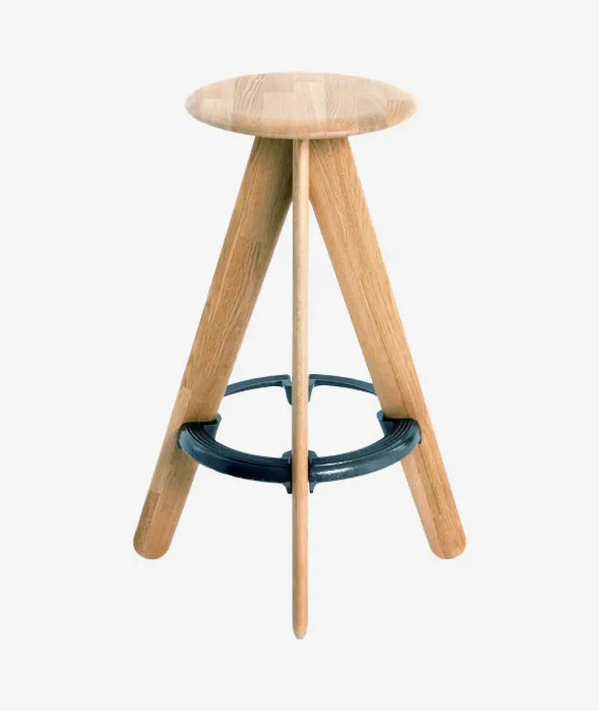 Celebrating the natural beauty of oak, Slab Bar Stool is a robust piece constructed in angular forms of inviting simplicity. The surface is deeply brushed to expose the grain of the natural oak. The Slab Bar Stool comes with a cast iron foot ring and is available in natural or in a black lacquered finish. The collection includes a dining chair and table.