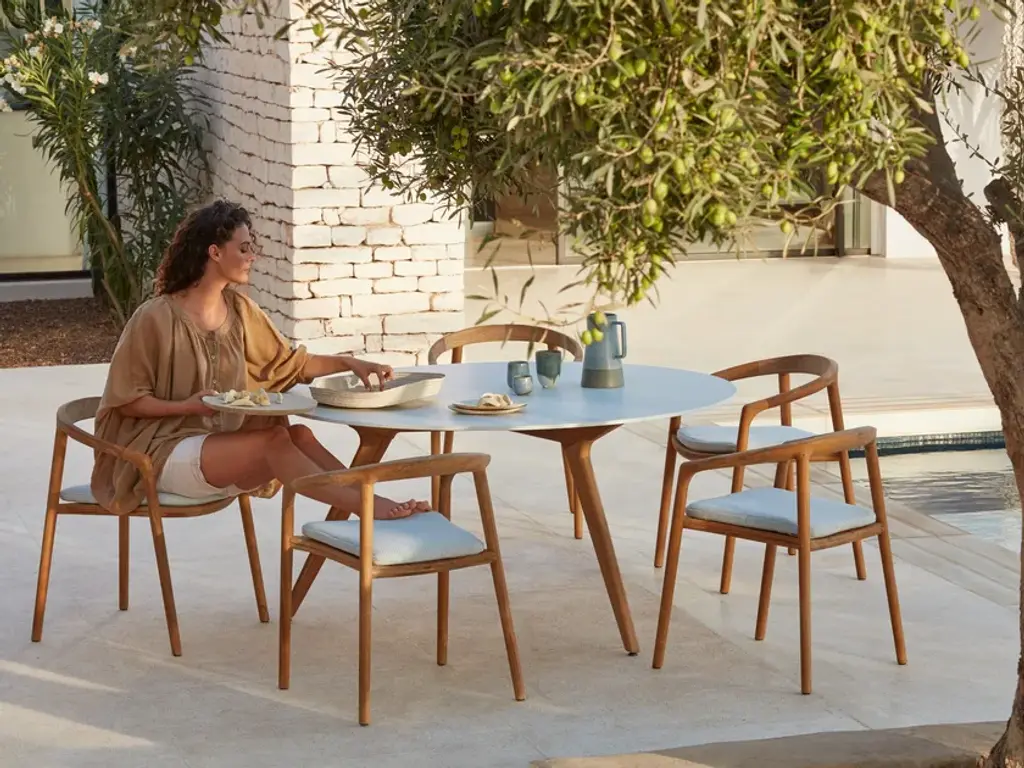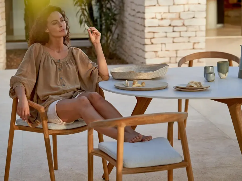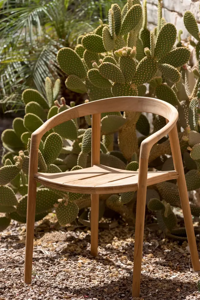Solid is fashioned from solid teak and reputed for its infallible durability. Its lines simultaneously evoke the power of an extensively crafted wood, solidity with a backrest joined to both the legs and the arm rests, and comfort thanks to its delicately crafted plush seating that perfectly moulds the body.Fashioned from natural teak and brushed teak nero, the SOLID collection is both an invitation and a bold statement. The design of the chairs, stools and bar stools perfectly balances technological innovation and authentic craftsmanship. Its graceful wooden frame and delicately crafted plush seating simultaneously suggest solidity and comfort – a sensation that is further amplified by its sensual shape, which molds to the body.