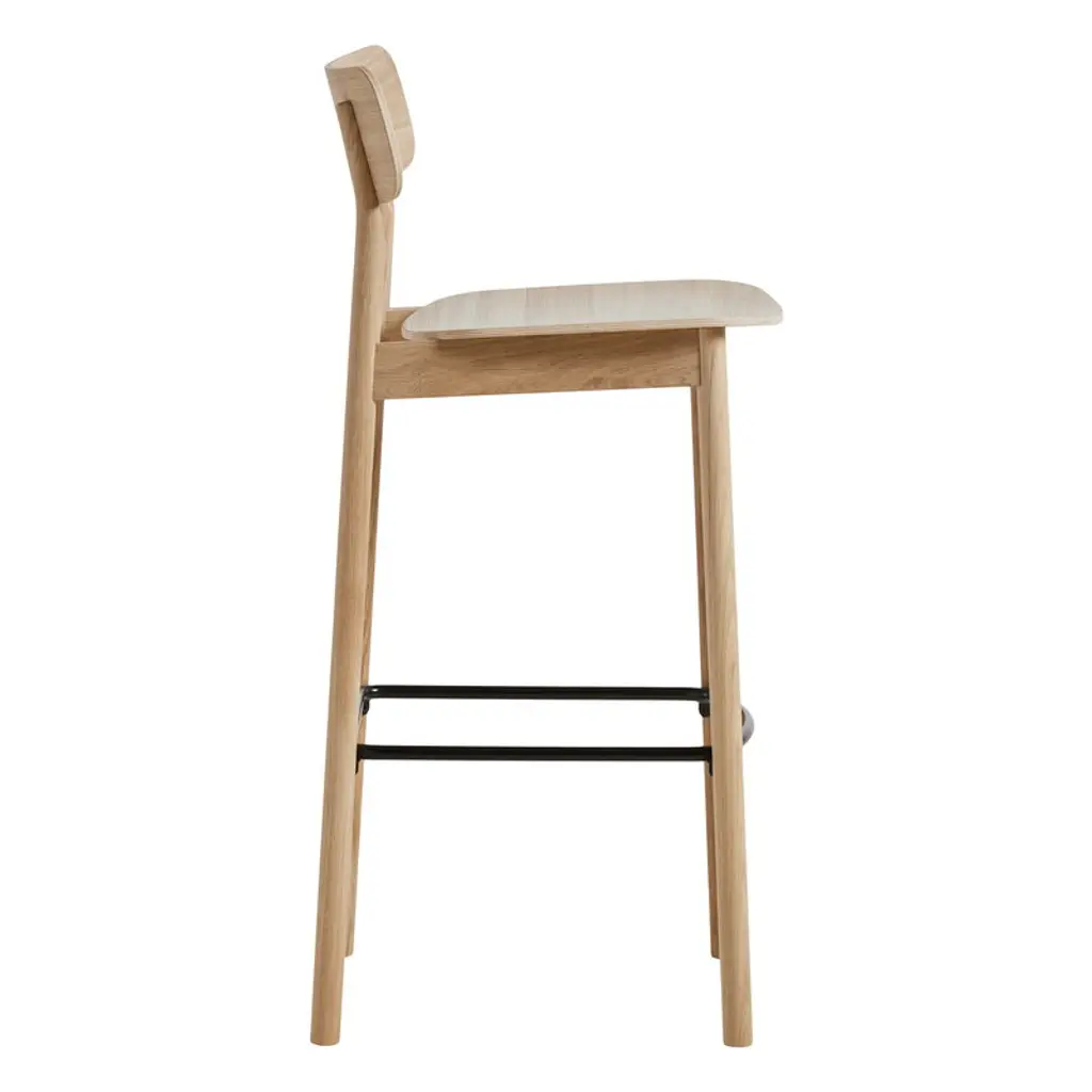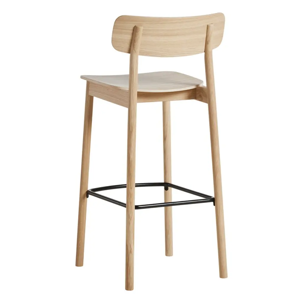 Woud’s Soma bar stool, created by Finnish designer Kasper Nyman, is characterized by soft, flowing lines. Made of solid wood, the Soma bar stool pairs a sleek, graceful appearance with a robust and durable structure, while the lightly curved, veneered backrest and seat add to the comfortable seating experience. This wooden bar chair is versatile enough to suit both home use and restaurants, and its otherwise simple design is enlivened by beautiful wood grain patterns and skillfully executed joints.