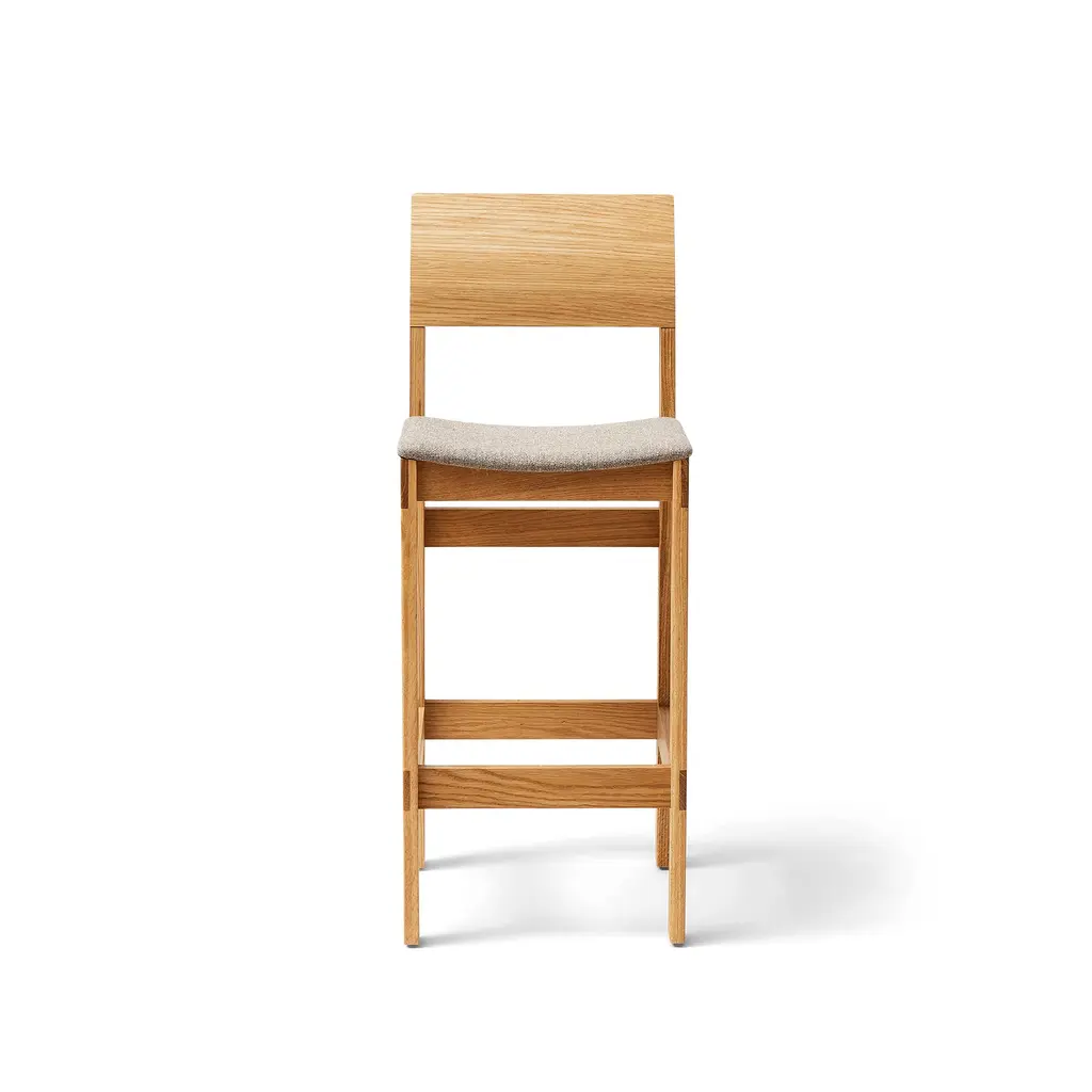 Designed by Herman Studio for Form & Refine, the Sonder Bar Chair 65 pairs an honest oak frame with a molded seat and back that gently cup the body. You feel it right away—the dish of the seat and the long, supportive back. Slim crossbars stiffen the frame and give your feet a natural perch, while the square edges read calm against a busy island. Choose the bare wood seat to enjoy the grain and a quick wipe-down, or add a soft pad upholstered in Kvadrat’s Hallingdal 65 (70% wool, 30% viscose) for longer sits and a quiet textile note. FSC-certified European oak finished in natural oil will pick up a warm sheen over time. Kitchen islands, café counters, home bars. Easy.