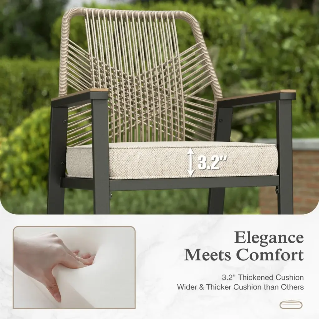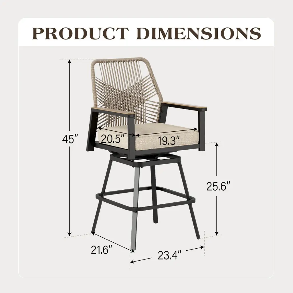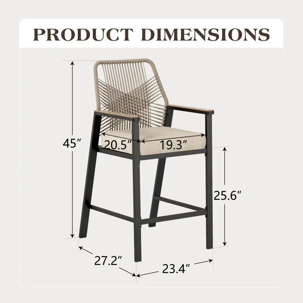 Perfectly suited for any modern outdoor décor, these chairs seamlessly combine style and functionality for an elegant appearance. The intricately woven rope back design adds a touch of charm, while the robust metal legs ensure durability against the elements. Experience cozy seating with thick, high-density cushions that maintain their shape, all protected by our CUSHION PRO technology. These rattan outdoor bar stools are both comfortable and resilient, supporting up to 300 lbs, making them perfect for gardens, patios, pools, deck, or kitchen counters.