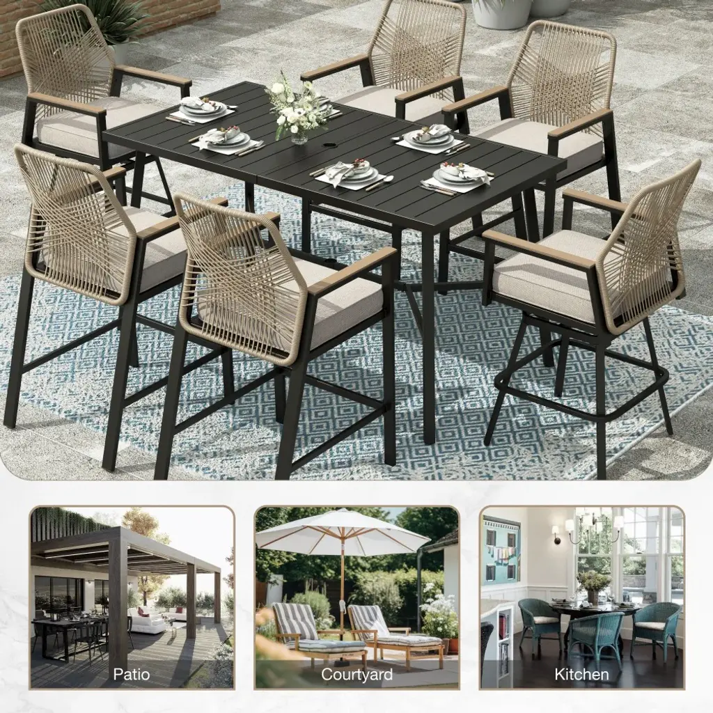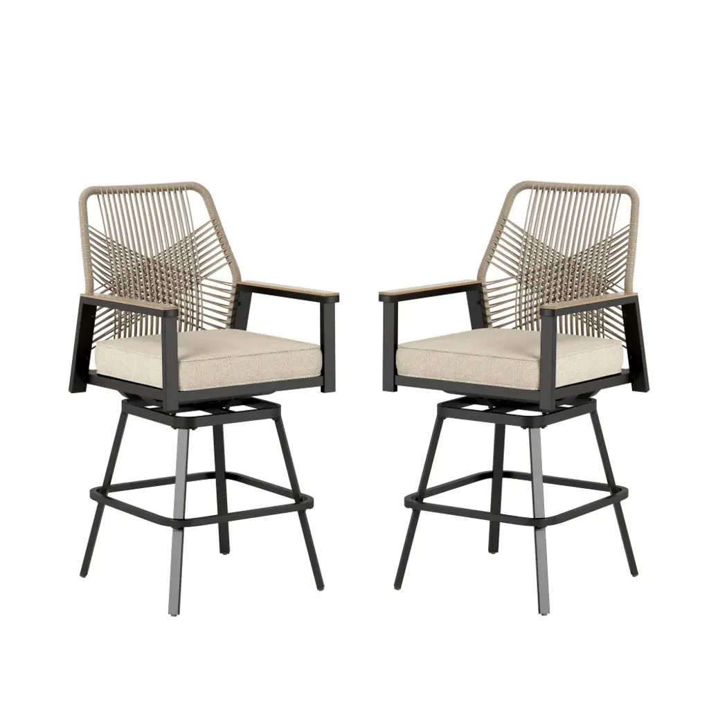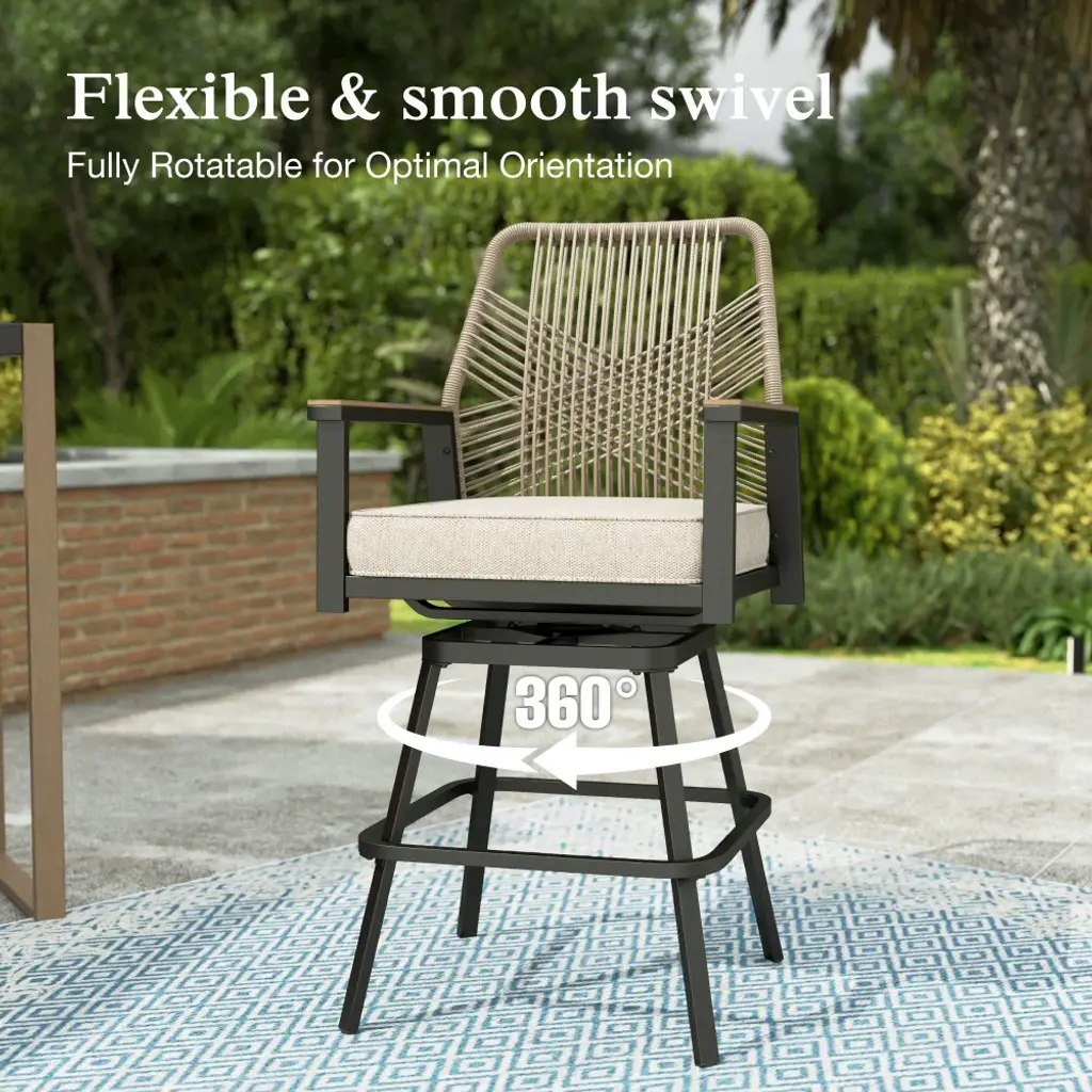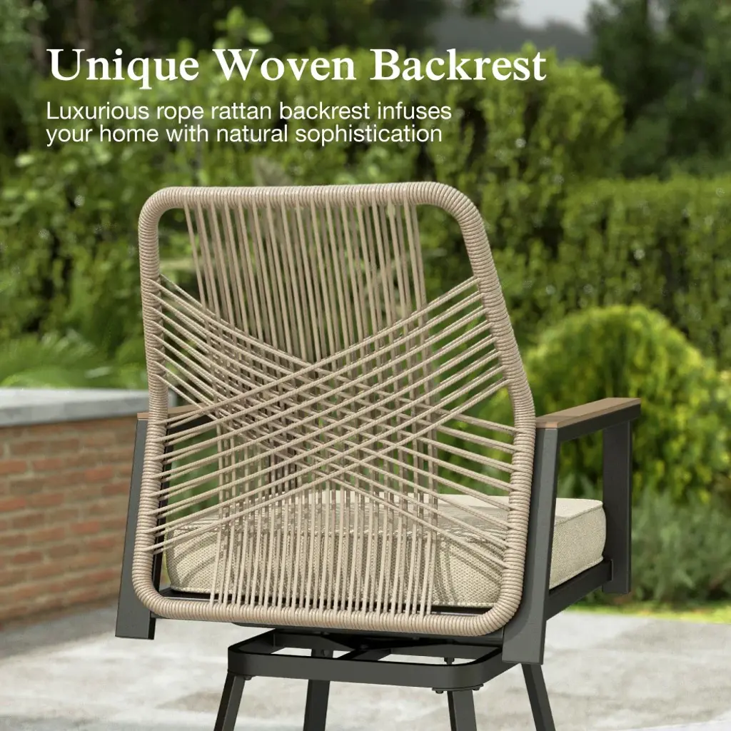 Perfectly suited for any modern outdoor décor, these chairs seamlessly combine style and functionality for an elegant appearance. The intricately woven rope back design adds a touch of charm, while the robust metal legs ensure durability against the elements. Experience cozy seating with thick, high-density cushions that maintain their shape, all protected by our CUSHION PRO technology. These rattan outdoor bar stools are both comfortable and resilient, supporting up to 300 lbs, making them perfect for gardens, patios, pools, deck, or kitchen counters.